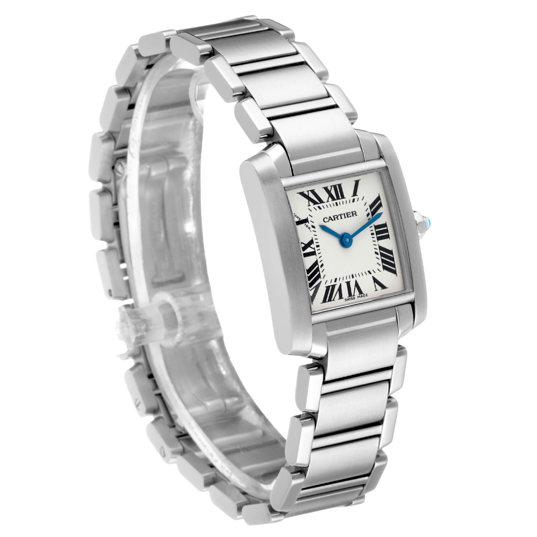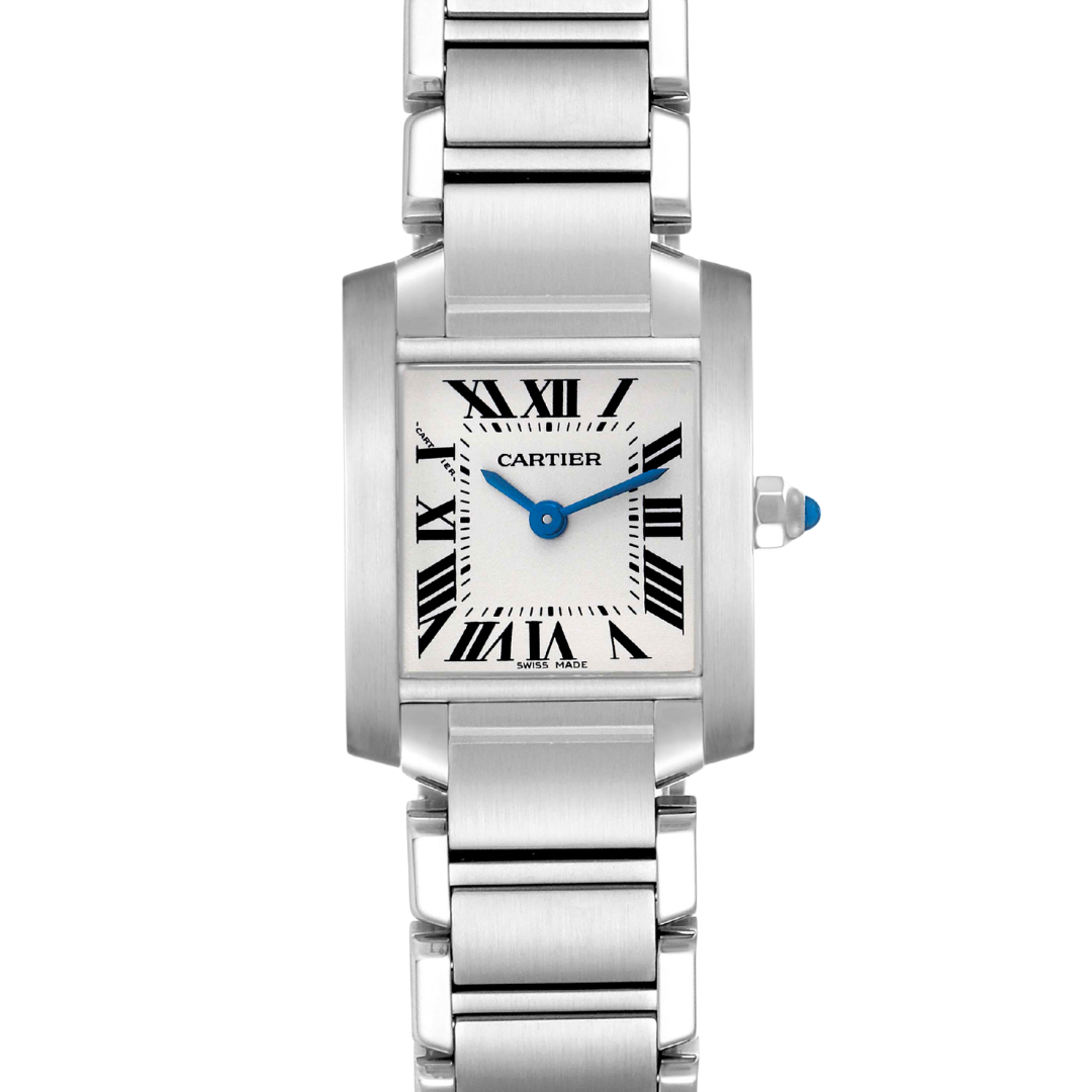 A Cartier Tank Française reference W51008Q3 in stainless steel, featuring a white dial with bold black Roman numeral hour markers. The dial features blued steel hands, a railway-style minute track, and Cartier’s signature square case design with a cabochon crown. The 25mm x 20mm case offers a compact and elegant profile, maintaining the clean geometric lines that define the Tank collection.