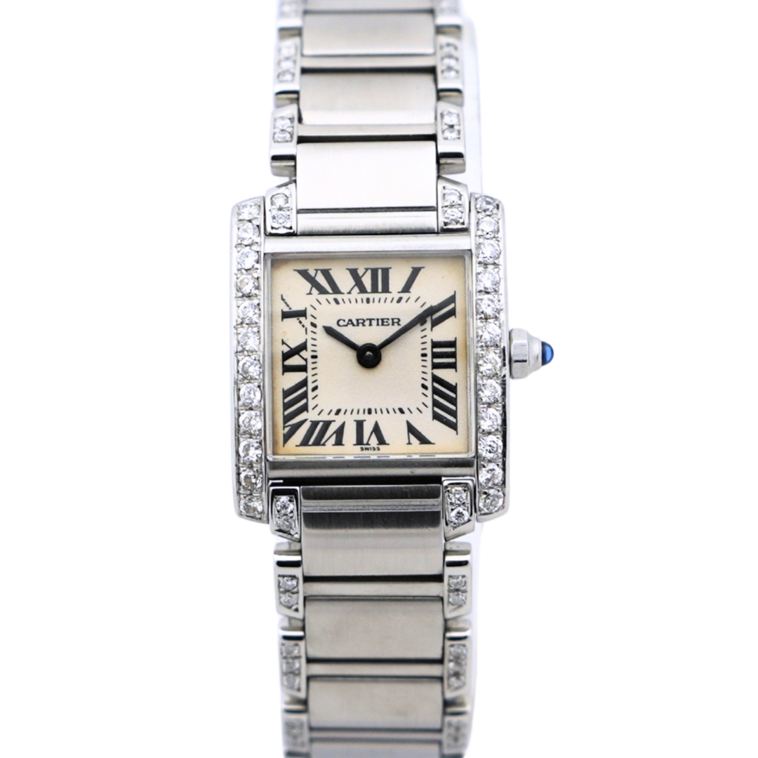 A Cartier Tank Francaise Watch, Afterset Diamond-Lined Bracelet and Bezel on a White Dial.