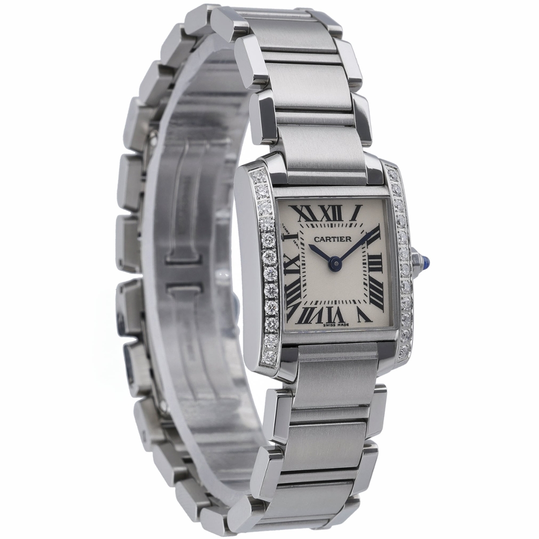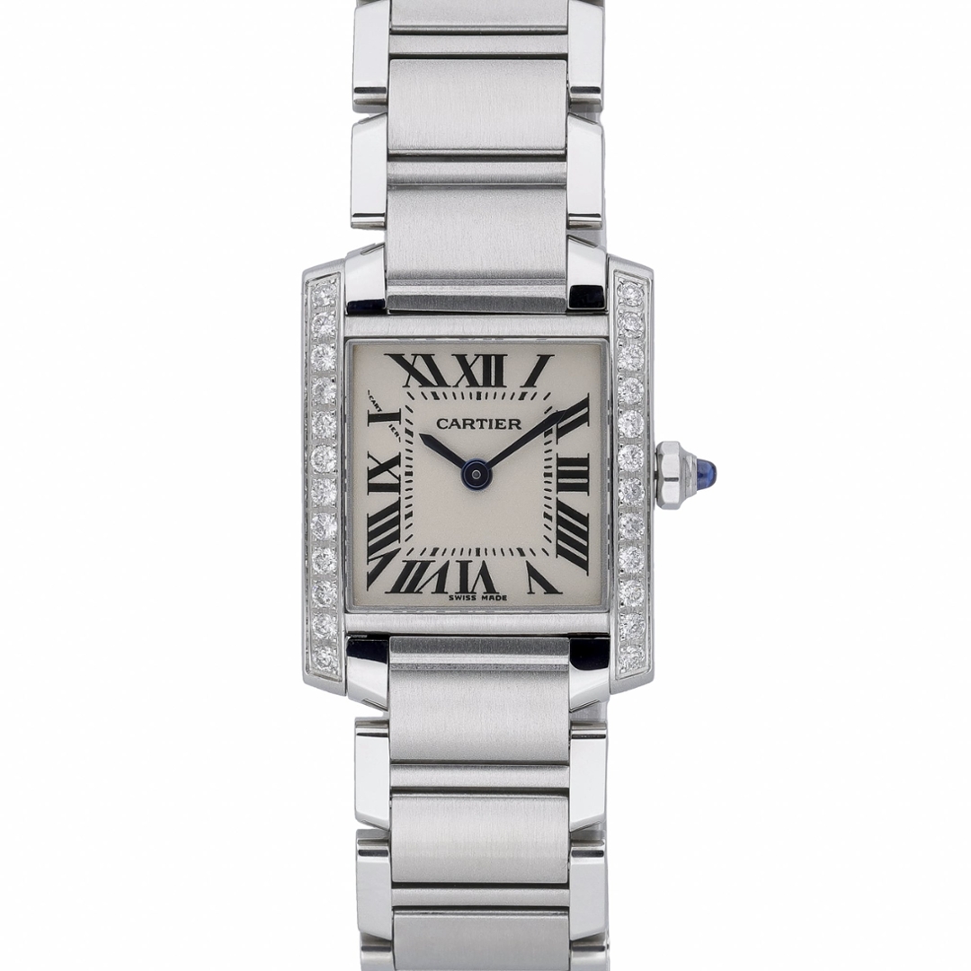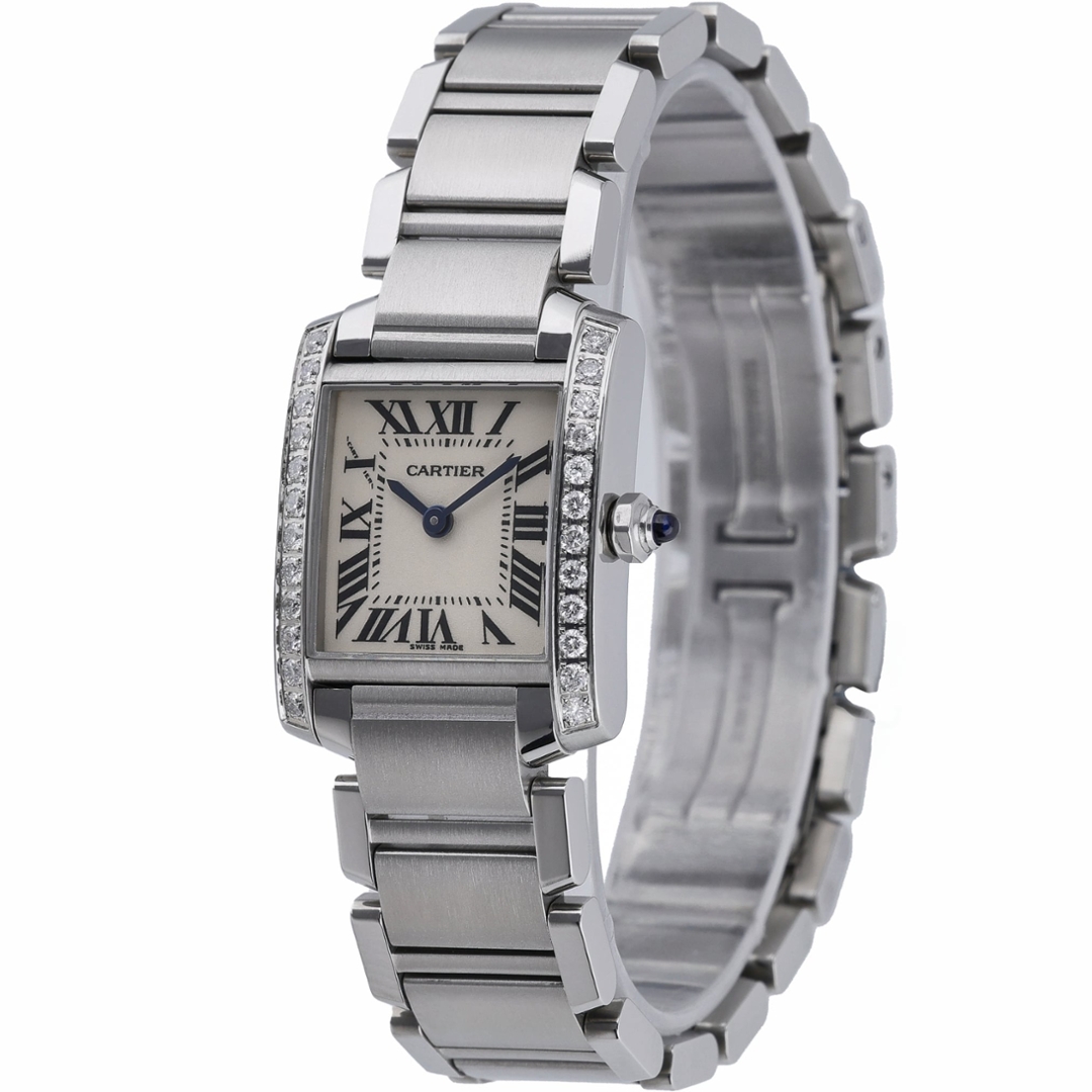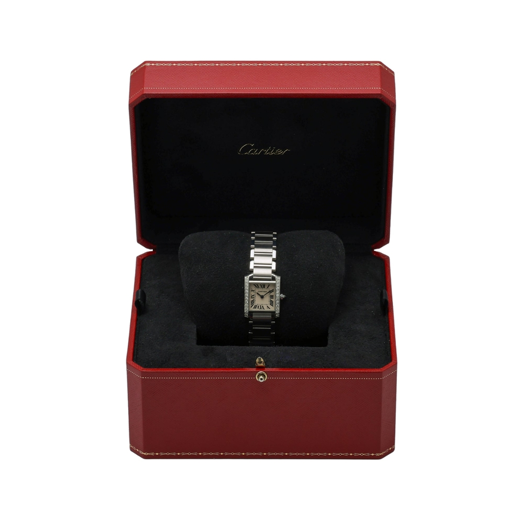 A Cartier Tank Francaise Watch, Stainless Steel with a Diamond Bezel on a White Dial