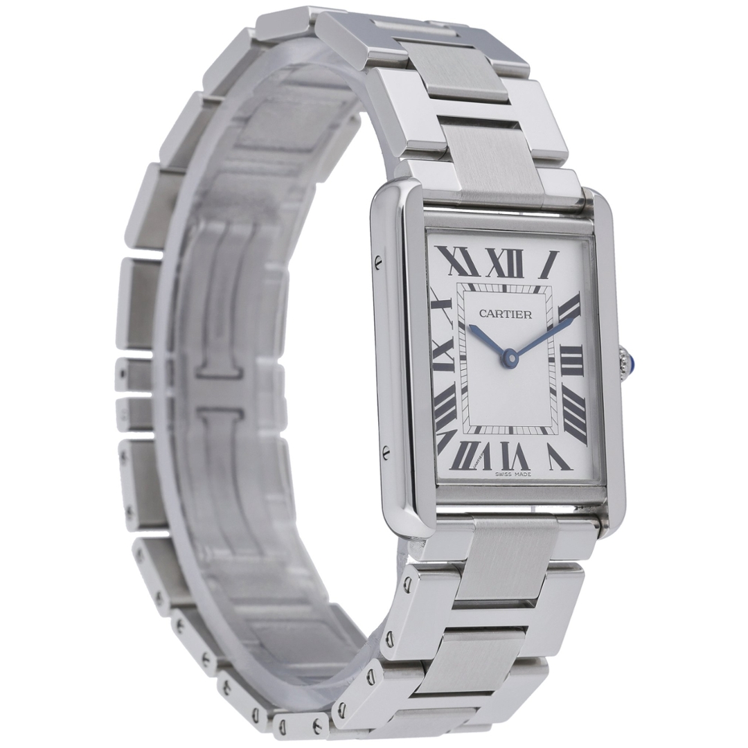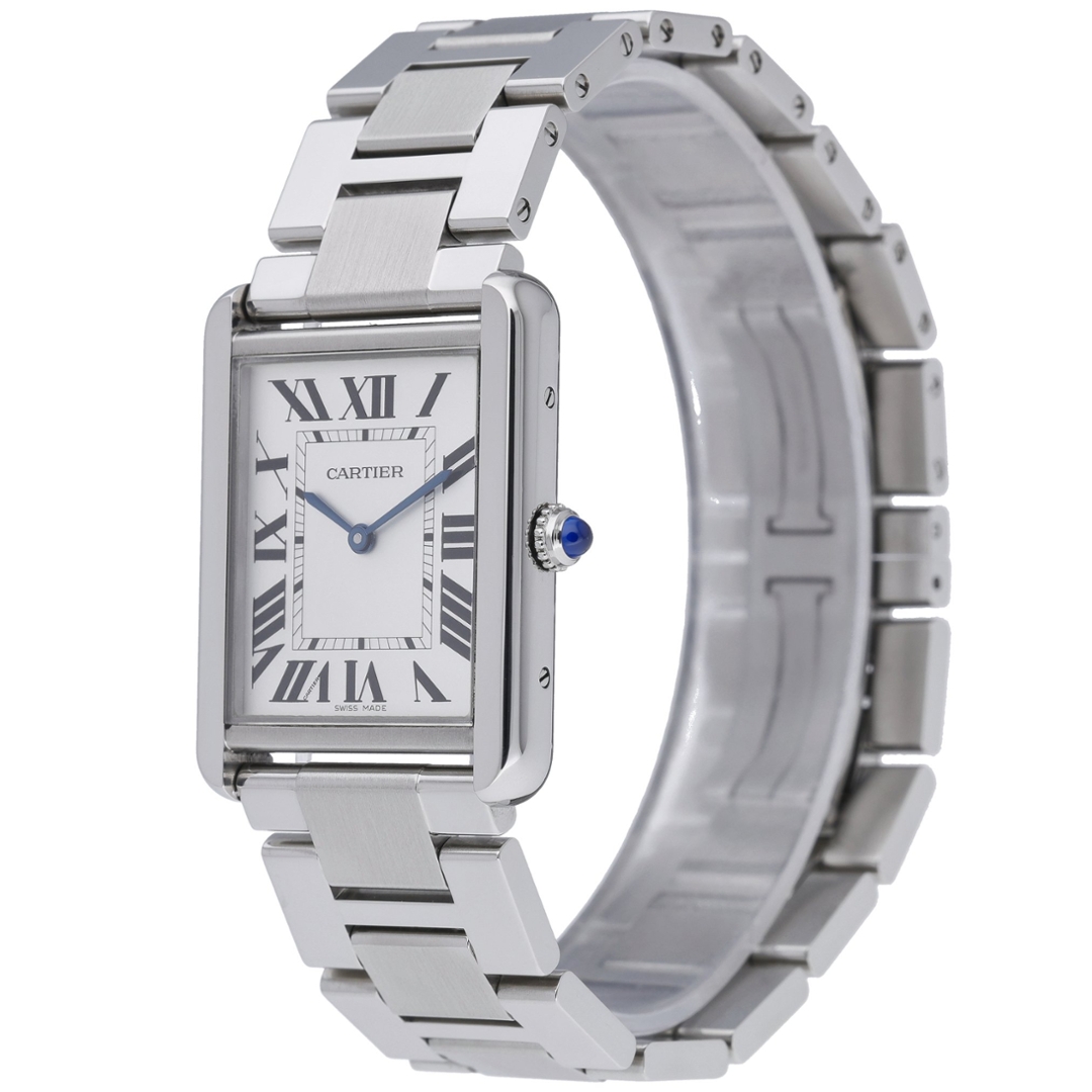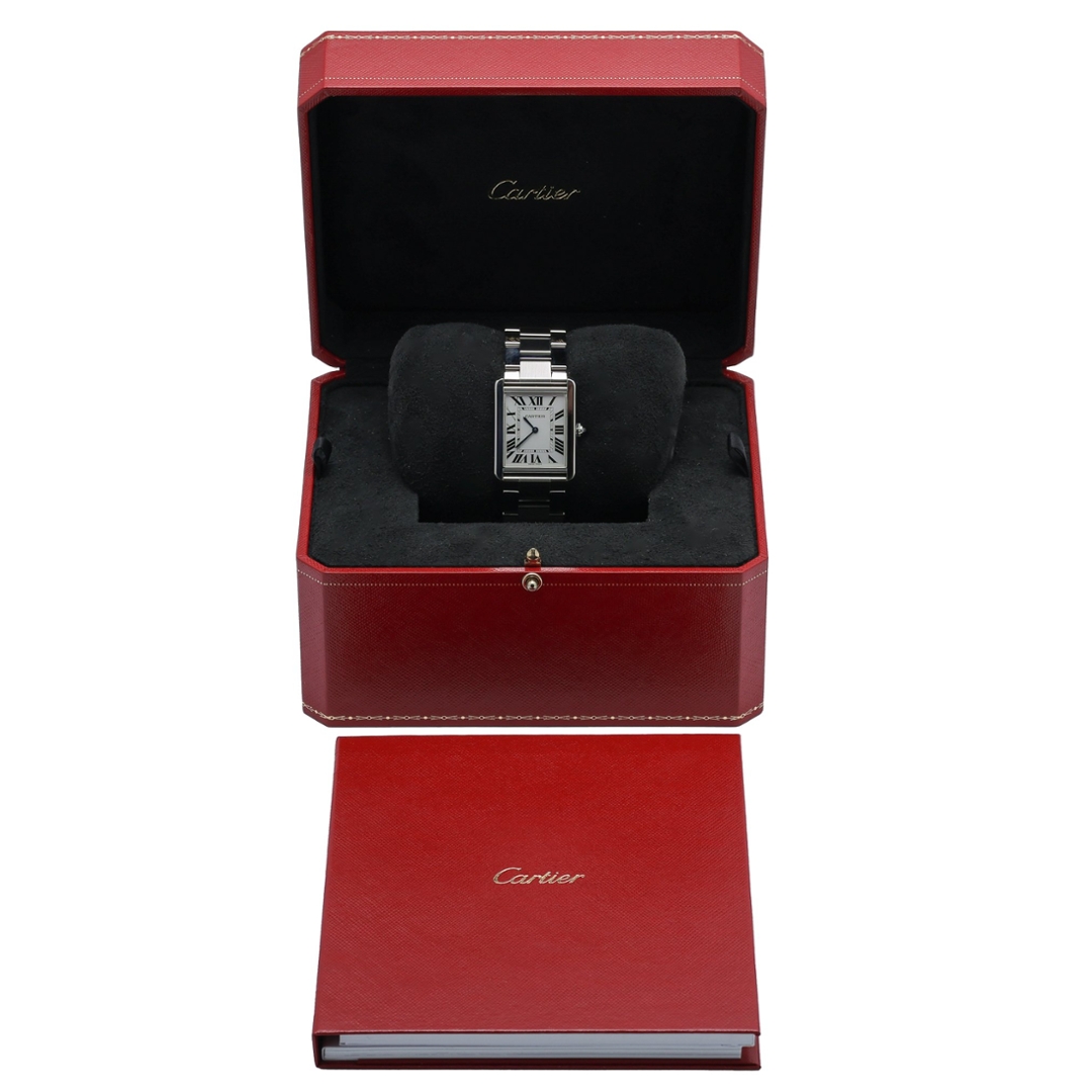 A Cartier Tank Solo Watch, stainless steel with a silvered opaline dial featuring bold black Roman numerals, blued-steel sword-shaped hands, and the signature sapphire cabochon crown. This timeless design reflects Cartier’s enduring mastery in elegant watchmaking, offering a balance of refinement and everyday practicality.