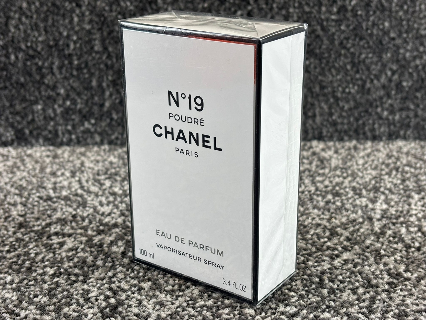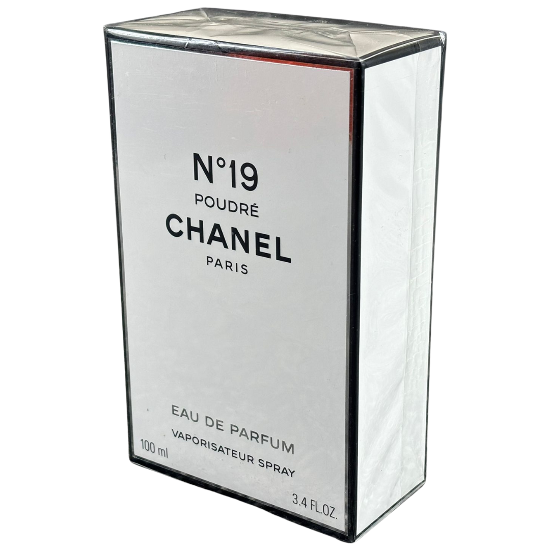 A 100ml bottle of Chanel No. 19 Eau de Parfum, presented in its
