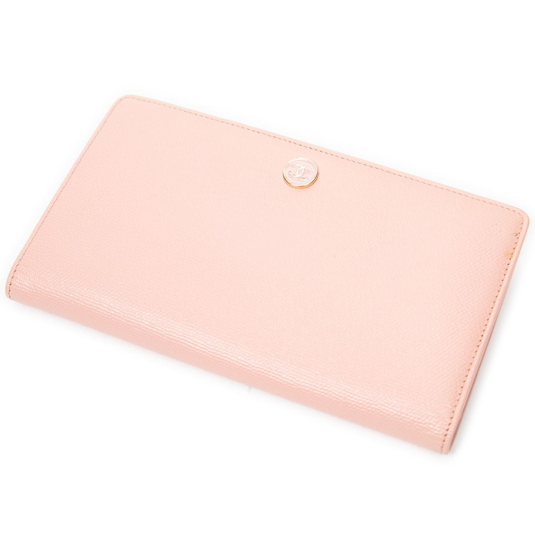 A vintage Chanel pink calfskin leather CC Button Long Bifold Wallet with a certificate of authenticity, Approximately 10cm height, 18cm width.