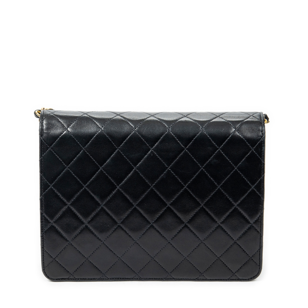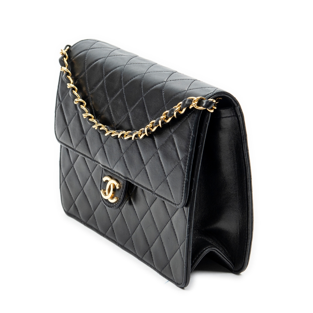 A vintage Chanel black quilted lambskin leather CC Push Lock Straight Single Flap bag with a certificate of authenticity, Approximately 17cm height, 22cm width.