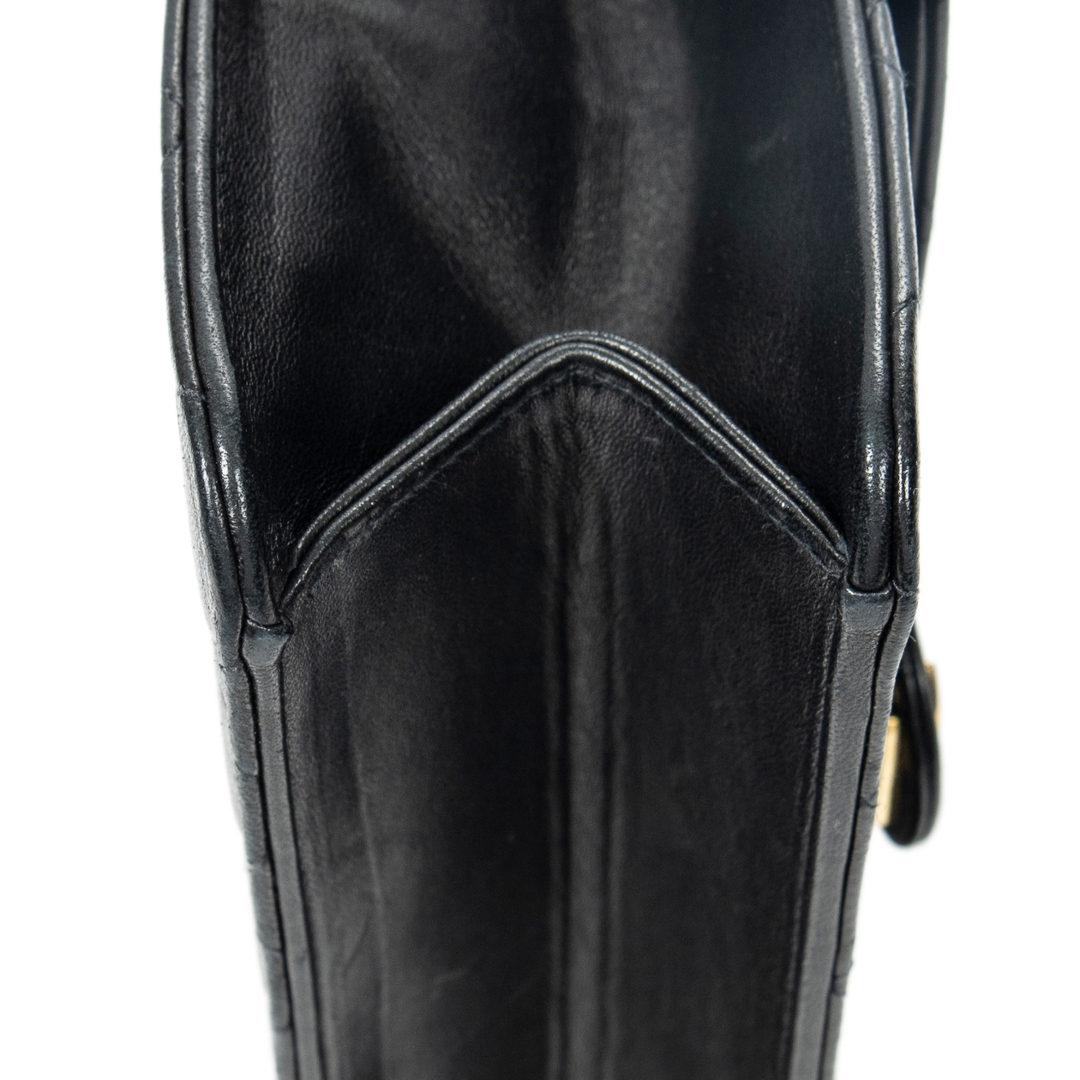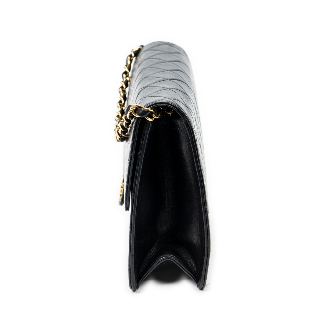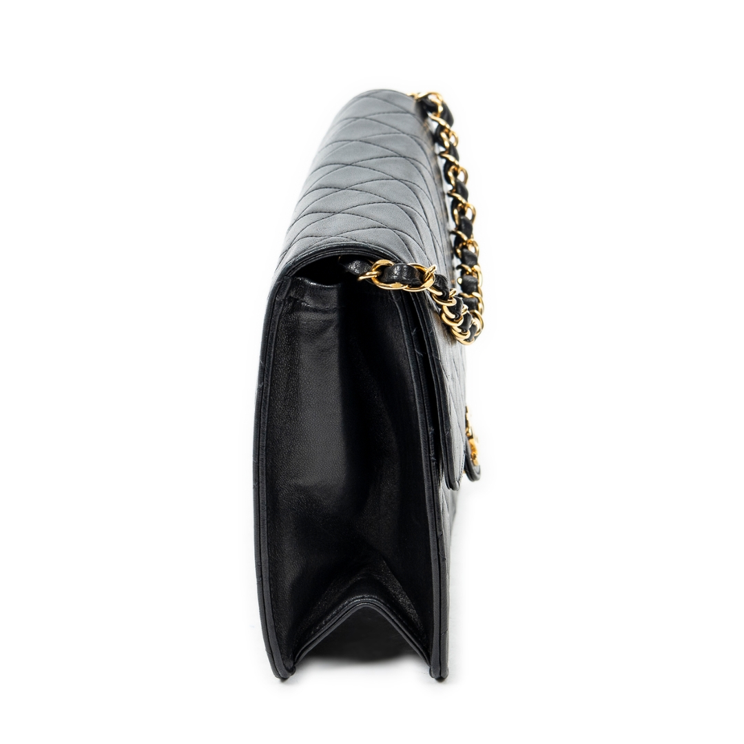 A vintage Chanel black quilted lambskin leather CC Push Lock Straight Single Flap bag, embodying the house’s most iconic design language. Crafted from supple lambskin, the classic diamond quilting creates a soft yet structured silhouette, complemented by gold-tone hardware and the signature CC push lock closure. The leather-threaded chain strap adds a timeless finish synonymous with Chanel’s heritage.