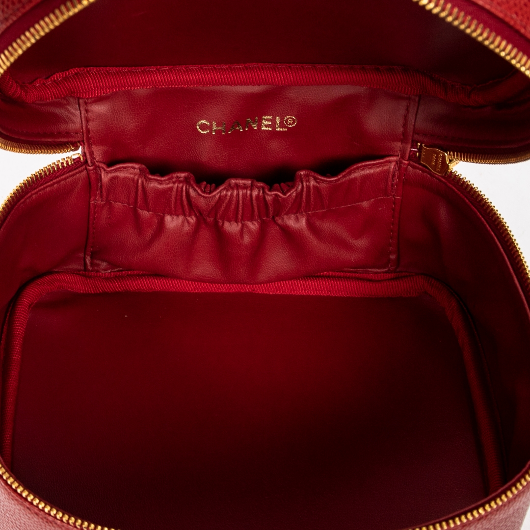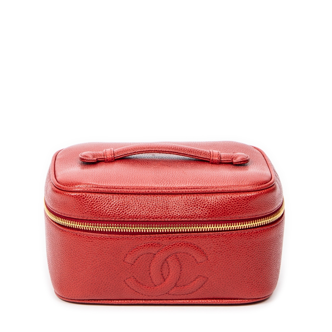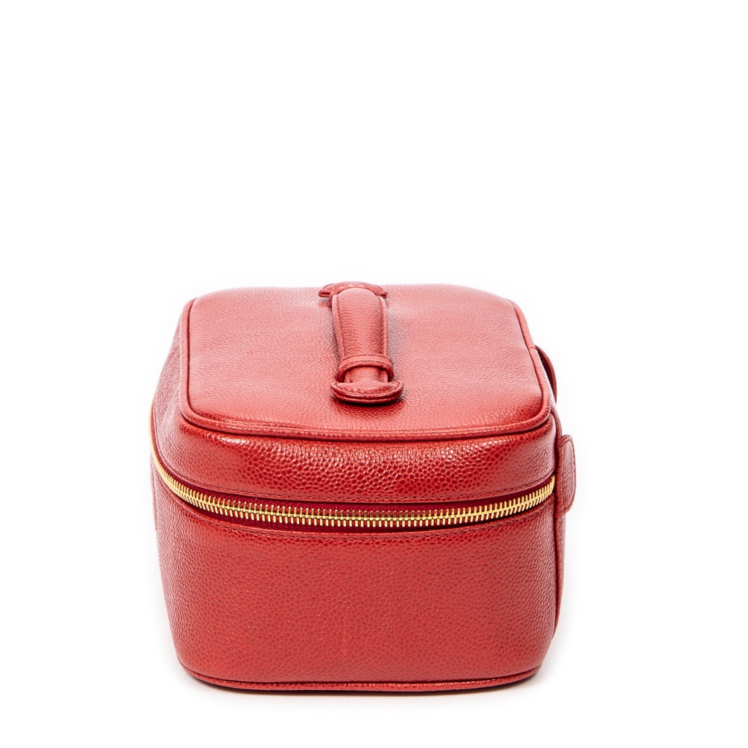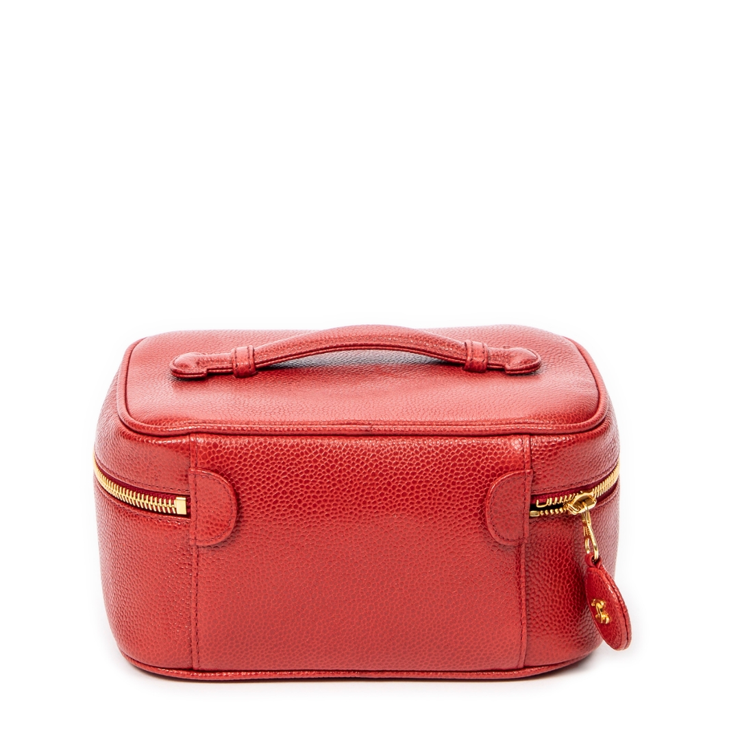 The compact vanity-style form is both practical and elegant, featuring a secure zip-around closure with gold-tone hardware that contrasts beautifully against the red leather. A top handle enhances its classic appeal while ensuring ease of carry, making it a versatile piece suited to both day and evening use without compromising on sophistication.