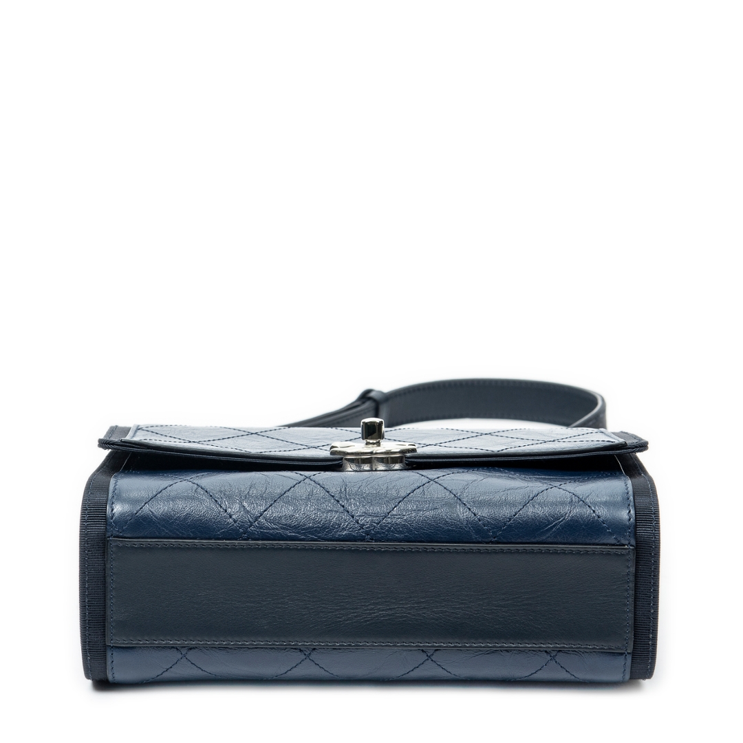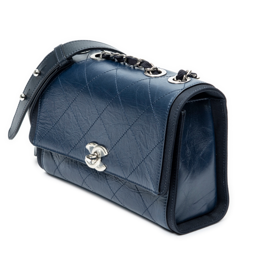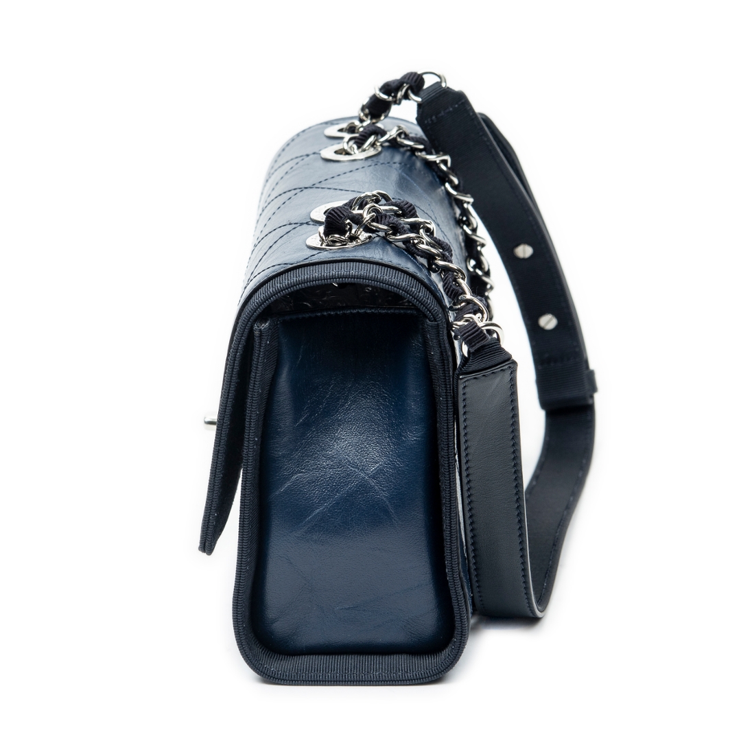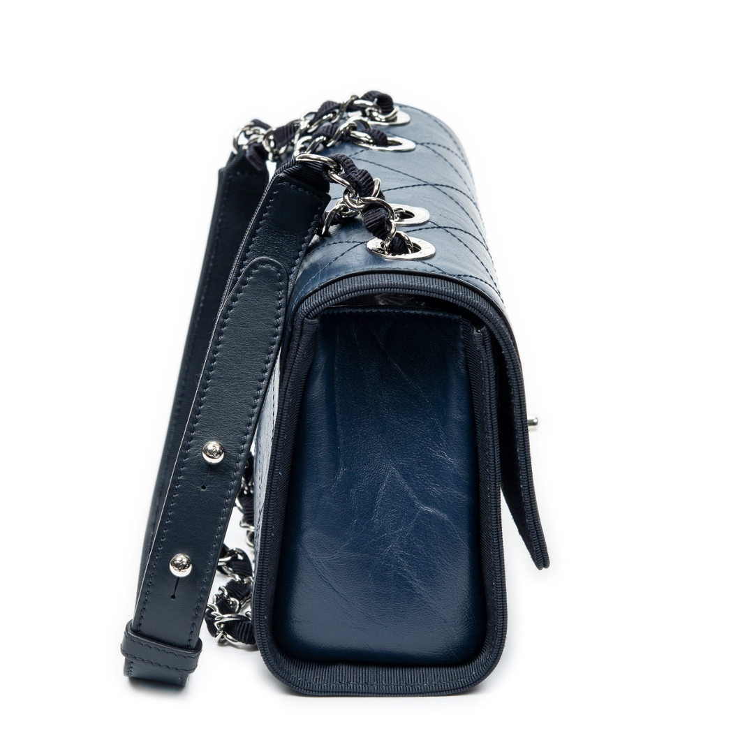 A vintage Chanel navy quilted crumpled calfskin leather CC Single Flap bag, offering a contemporary twist on the house’s iconic design codes. Crafted from softly textured crumpled calfskin, the diamond quilting is enhanced by a relaxed, slightly distressed finish that adds depth and character. The silver-tone CC turn-lock closure and coordinating hardware provide a modern contrast against the rich navy tone.