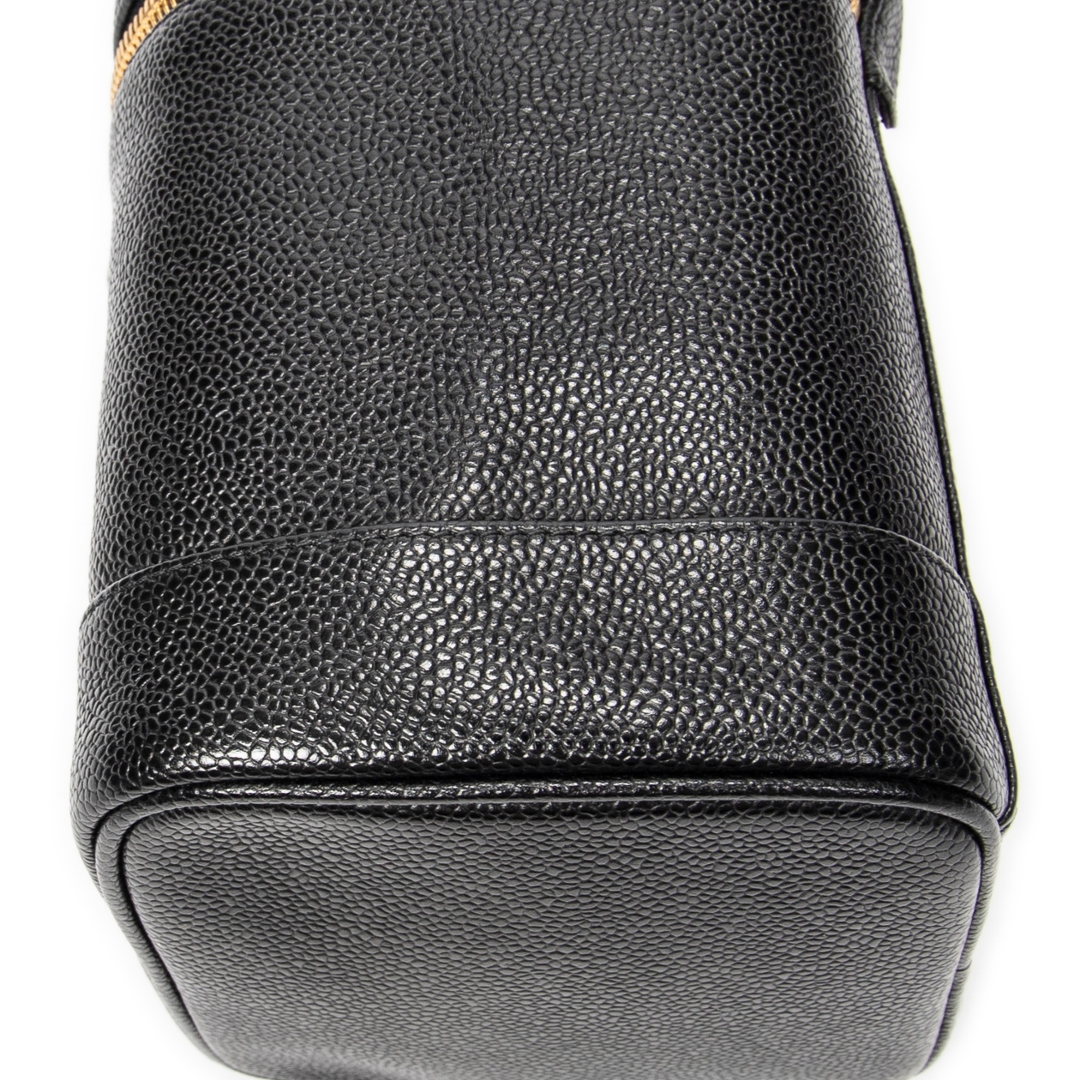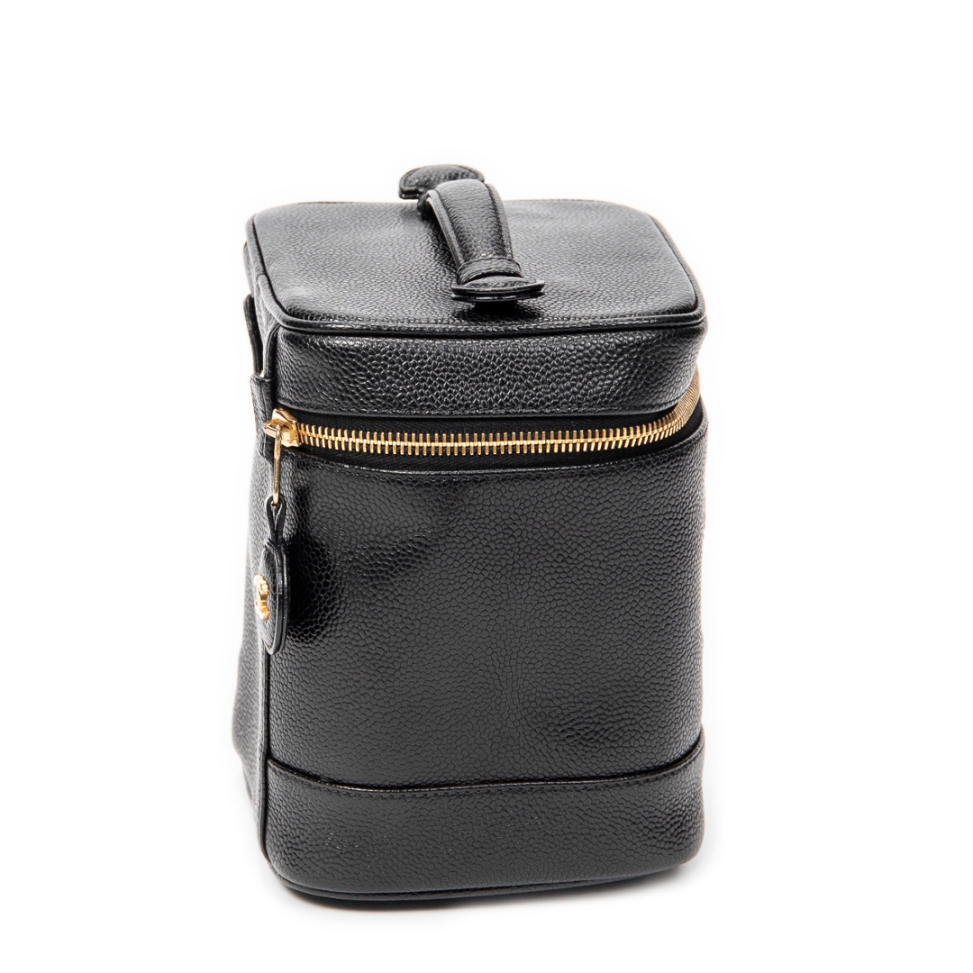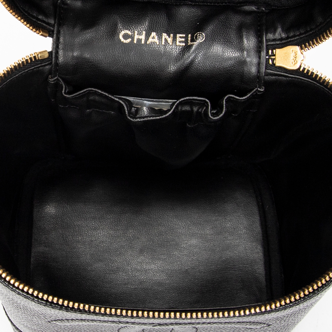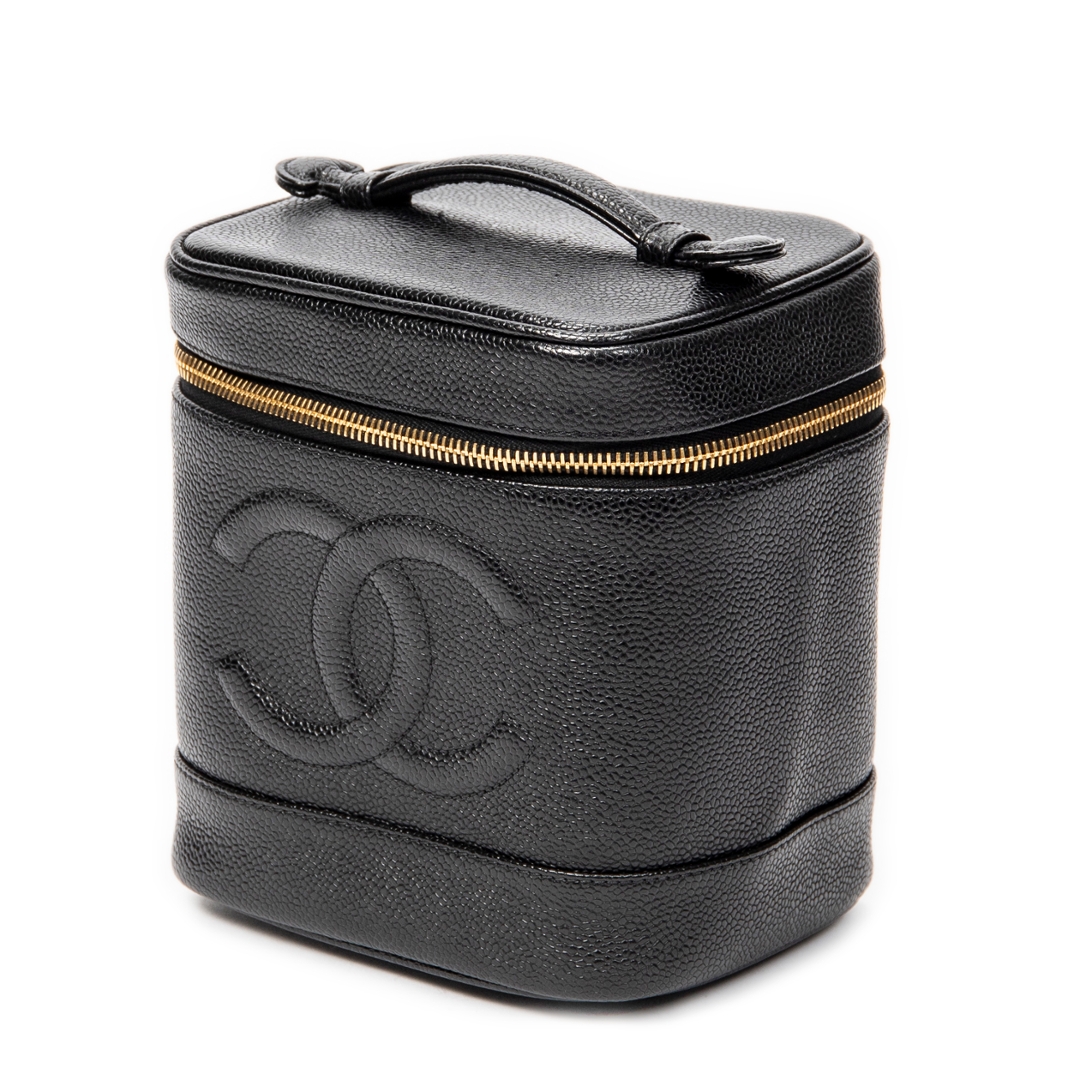 A vintage Chanel black calf leather CC Tall Vanity Case bag with a certificate of authenticity, Approximately 12cm height, 15cm width.