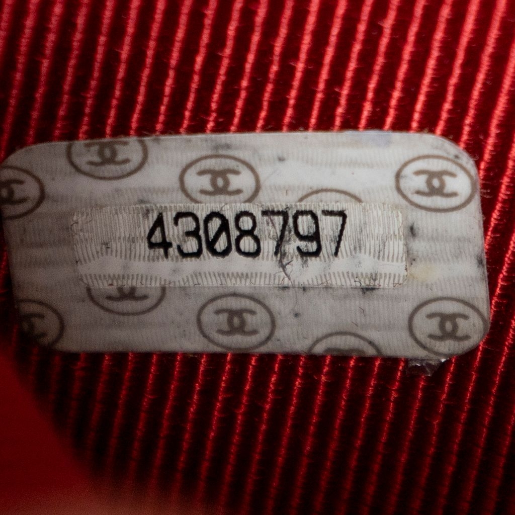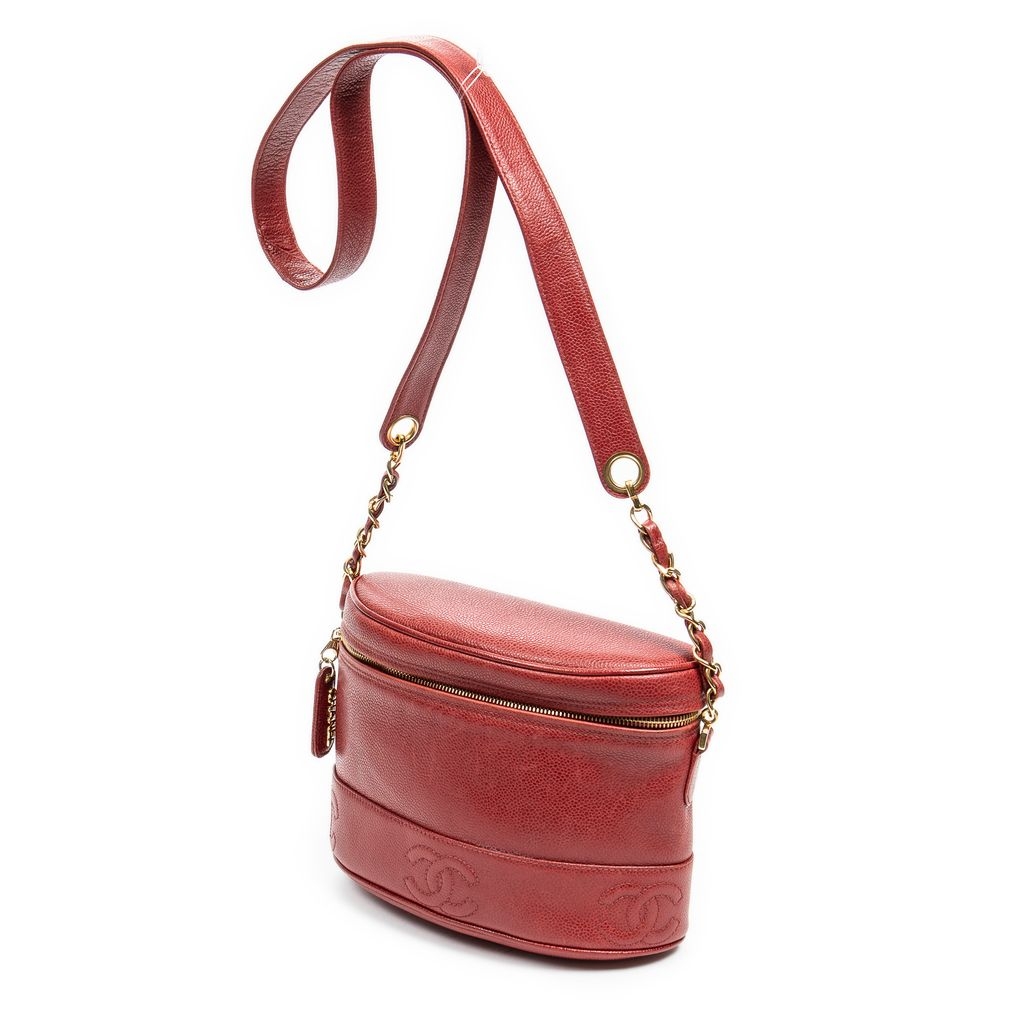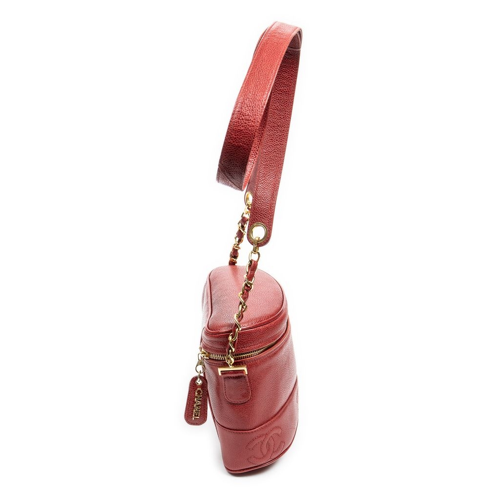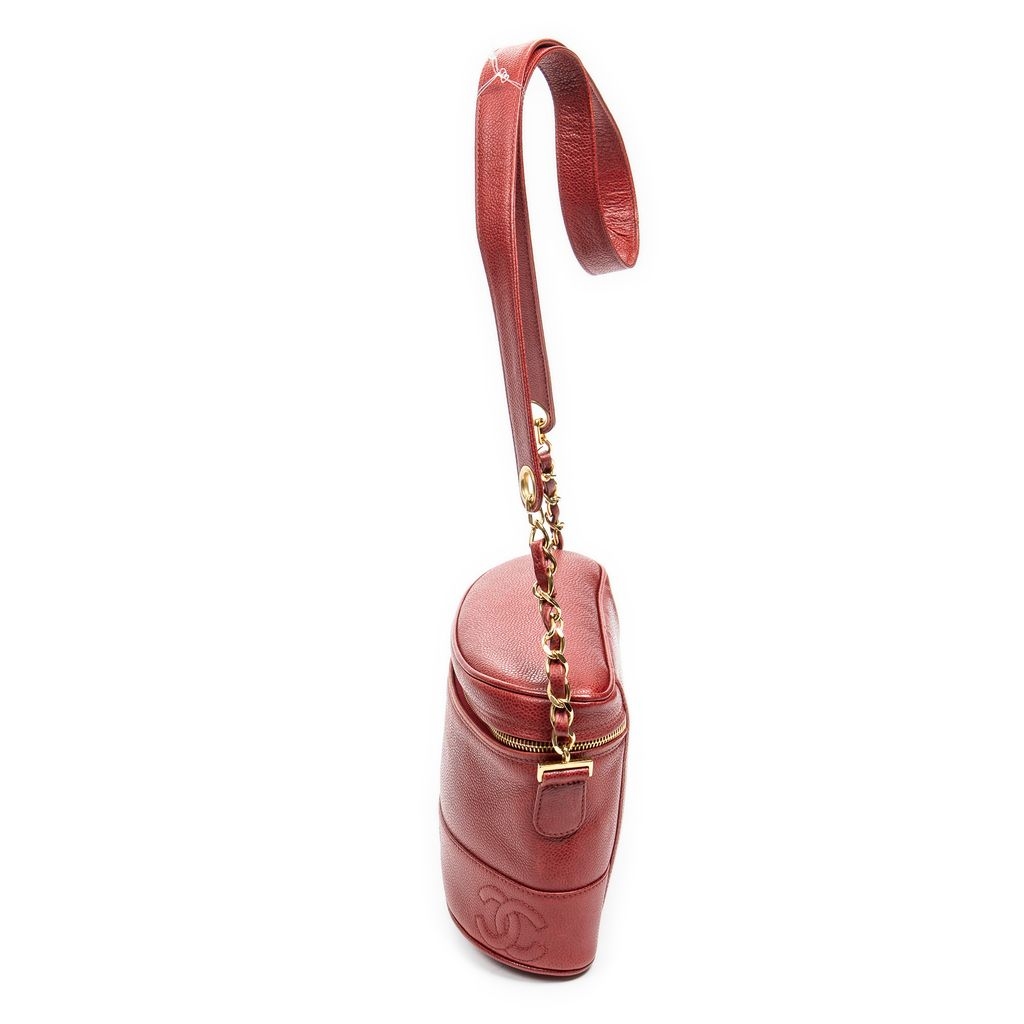 A vintage Chanel red calf leather CC Timeless Chain Crossbody bag with a certificate of authenticity, Approximately 29cm height, 50cm width.