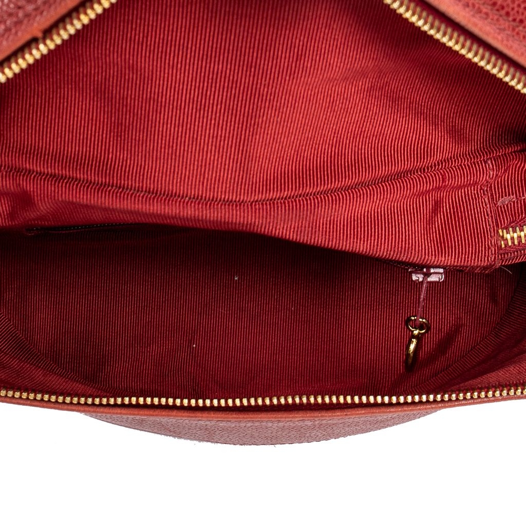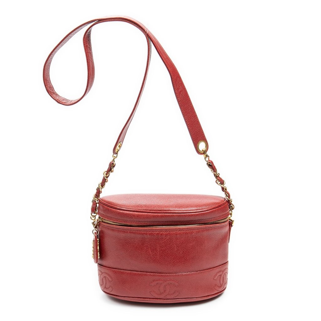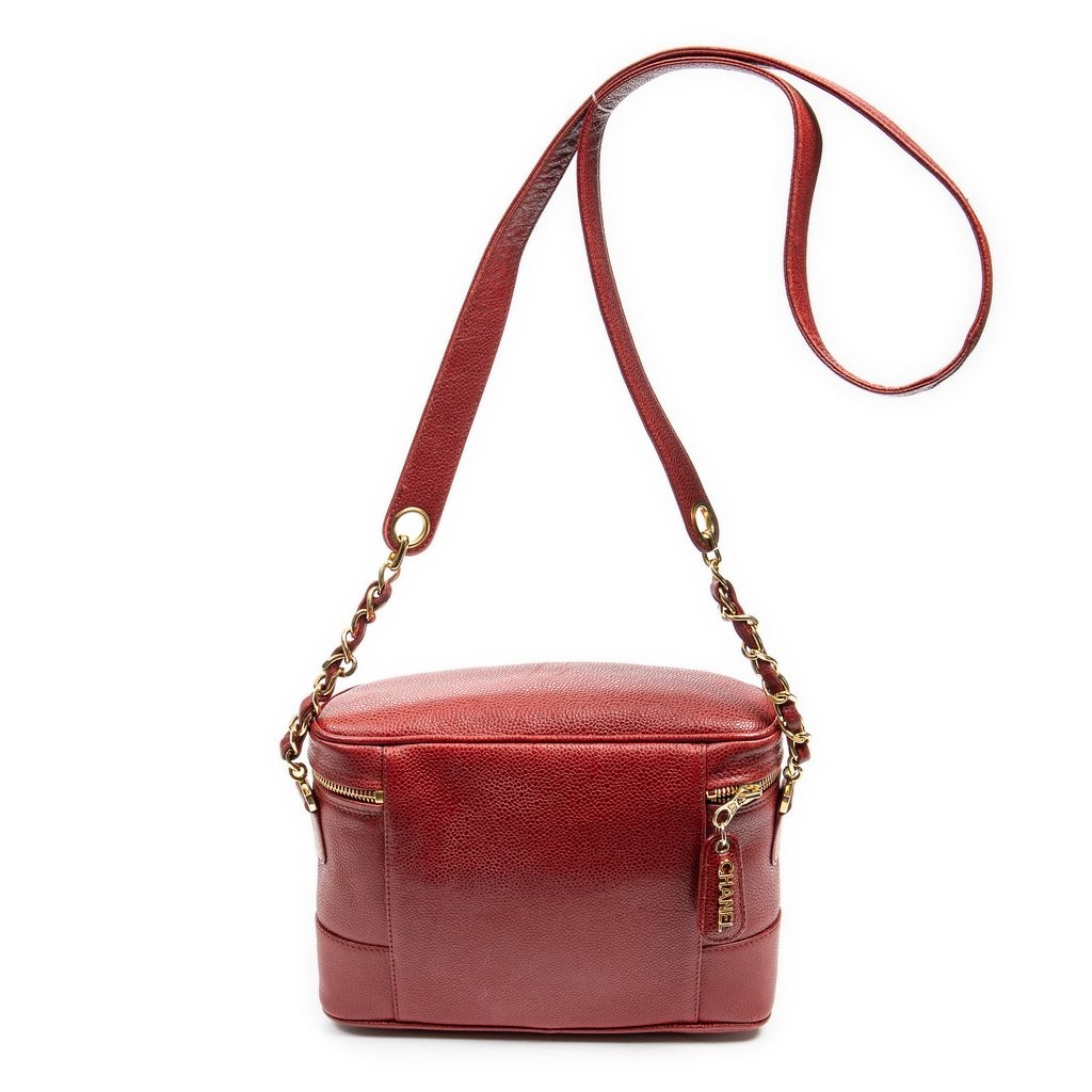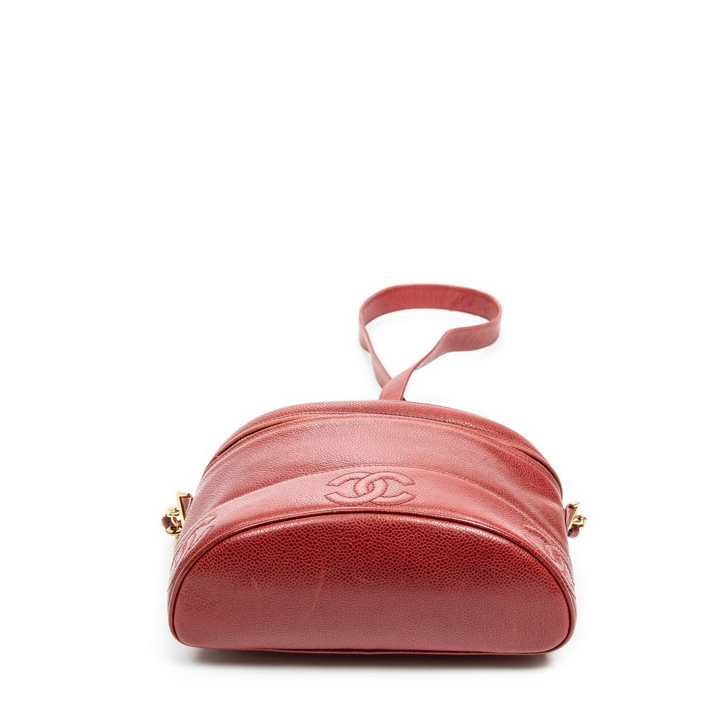 A vintage Chanel red calf leather CC Timeless Chain Crossbody bag with a certificate of authenticity, Approximately 29cm height, 50cm width.