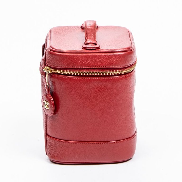 A vintage Chanel red calf leather CC Vanity Case with a certificate of authenticity, Approx 16cm height, 15cm width.
