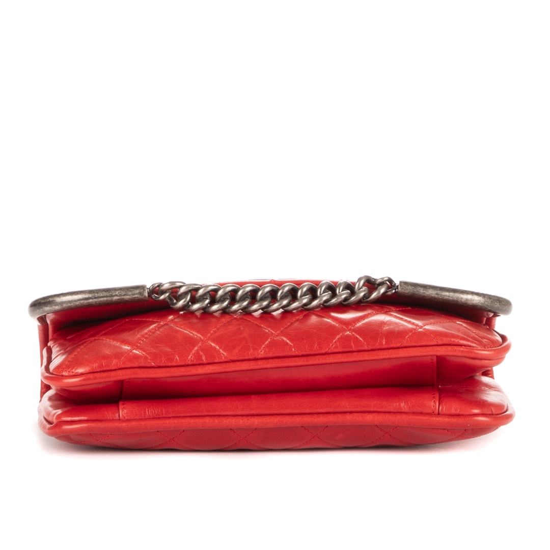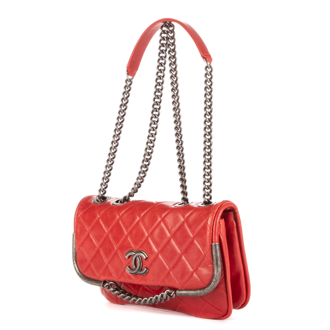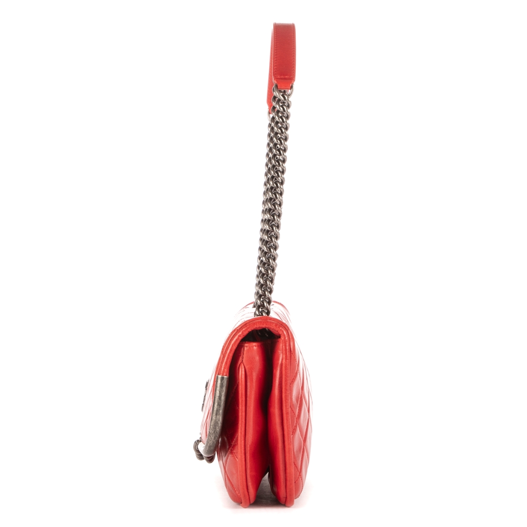 A vintage red calf leather Chanel Chain Single Flap bag with a certificate of authenticity, Approximately 16cm height, 27cm width.