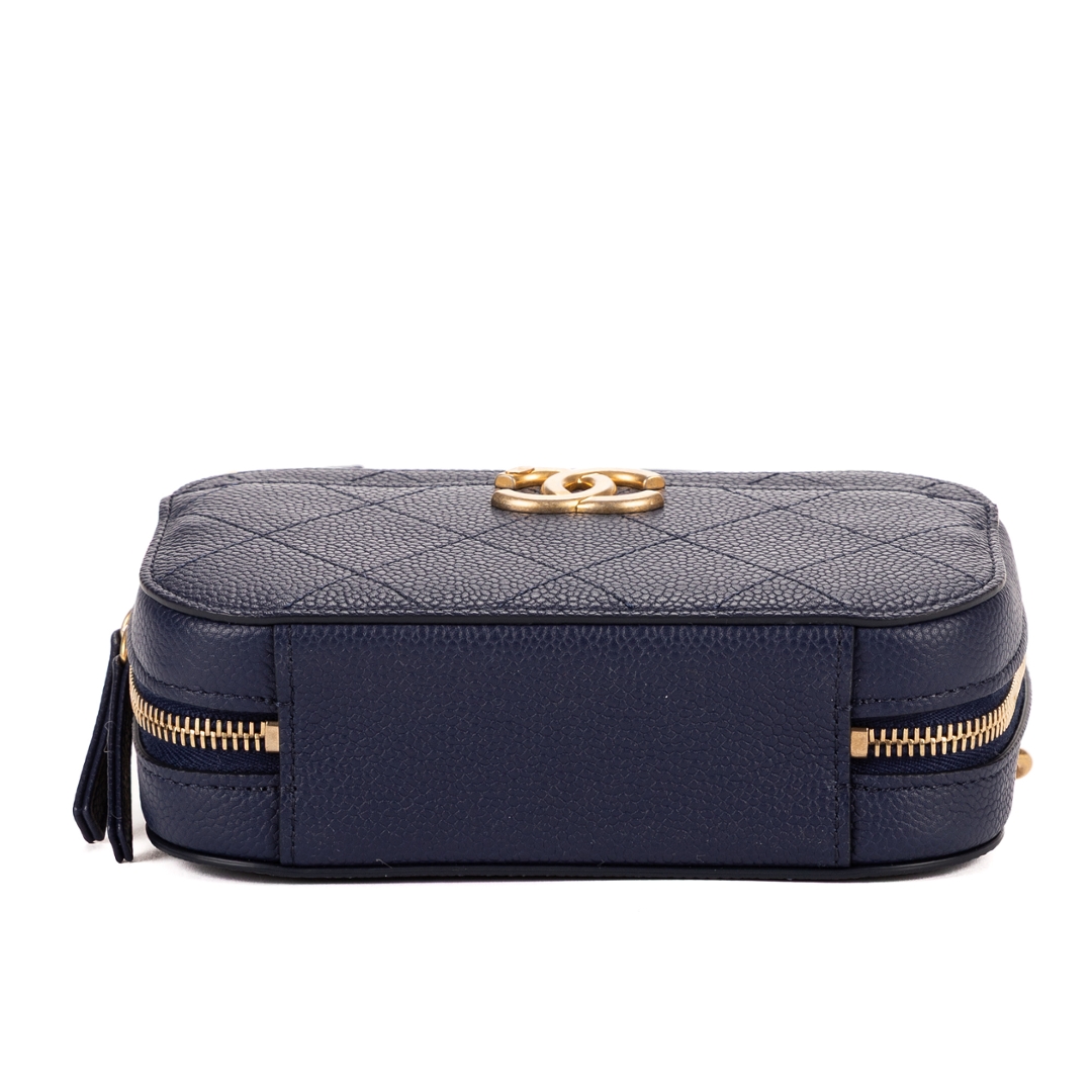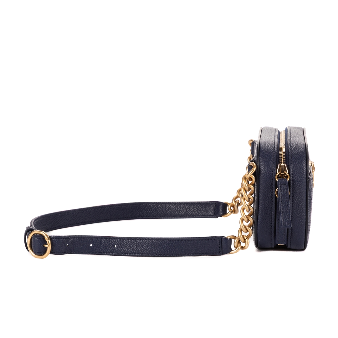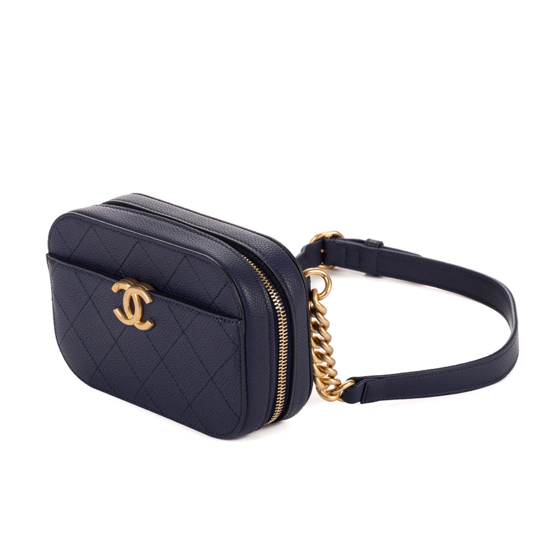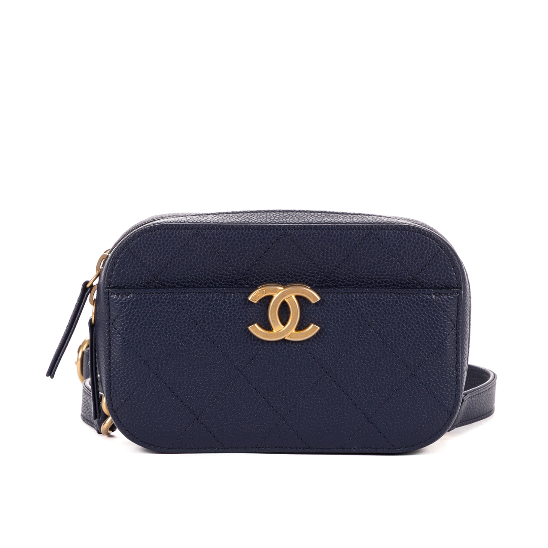 A vintage Chanel Chic Affinity Belt Bag, presented in a refined dark navy caviar leather that embodies the house’s timeless elegance. The softly structured silhouette is enhanced by classic diamond quilting, while the gold-tone CC logo to the front delivers an instantly recognisable signature. Crafted with Chanel’s renowned attention to detail, this piece offers both durability and enduring style.