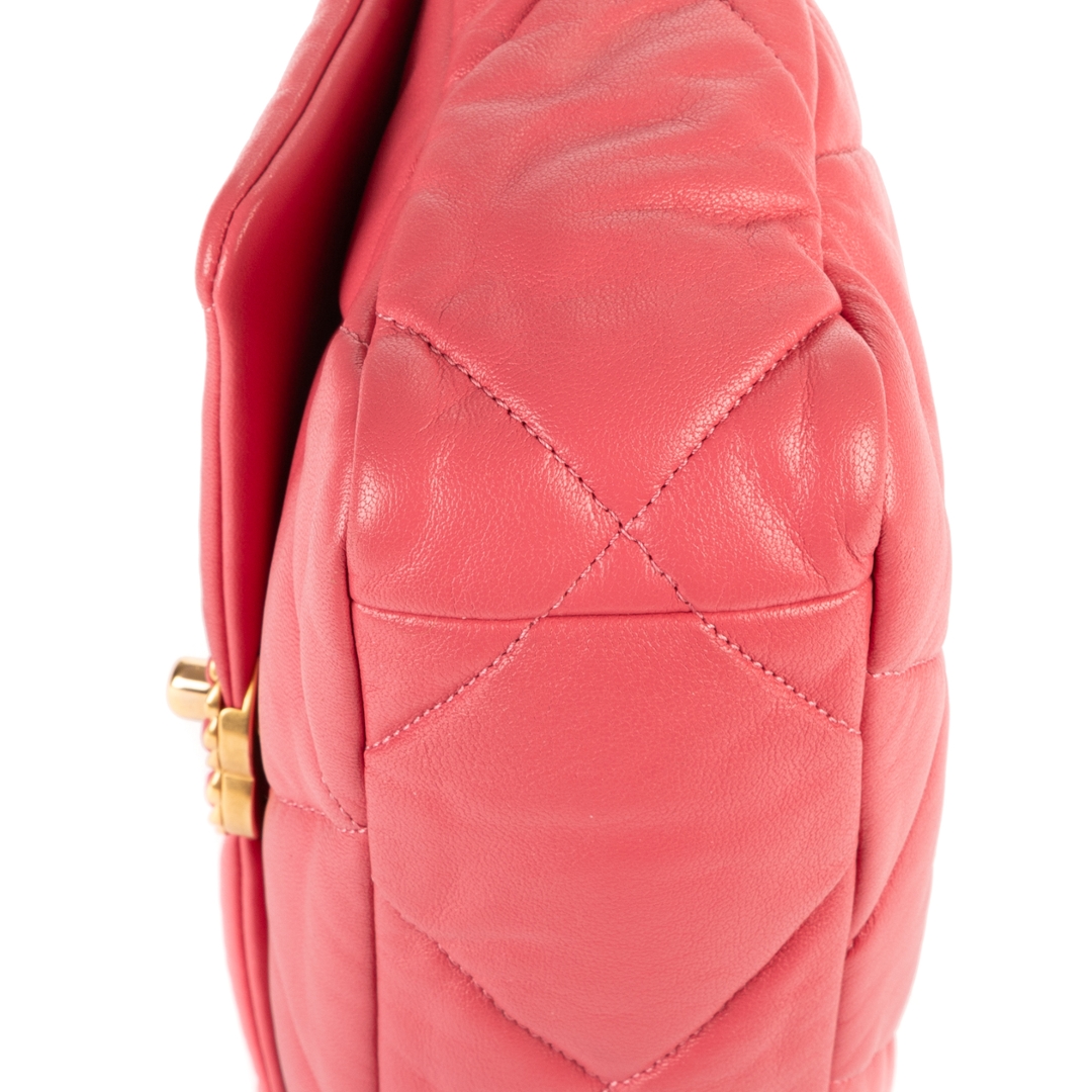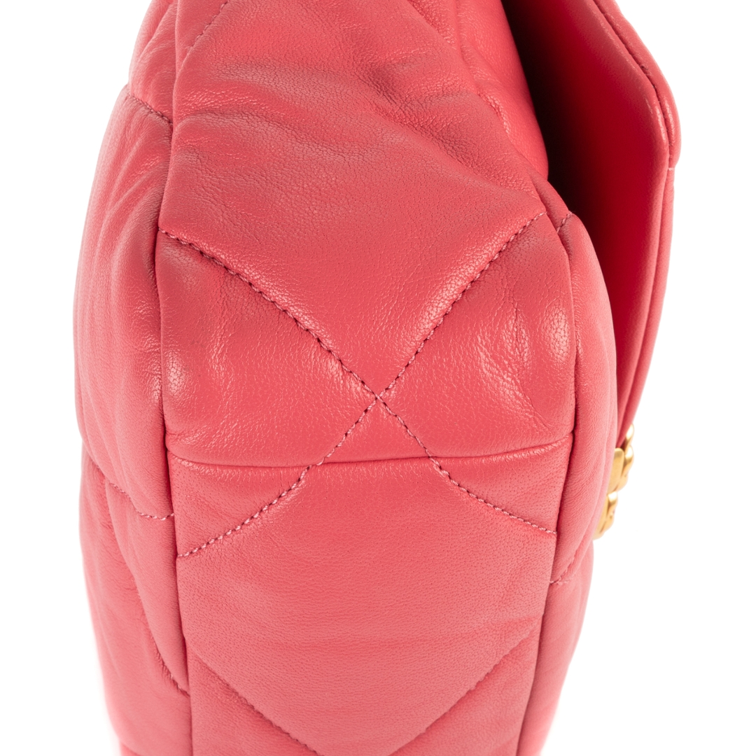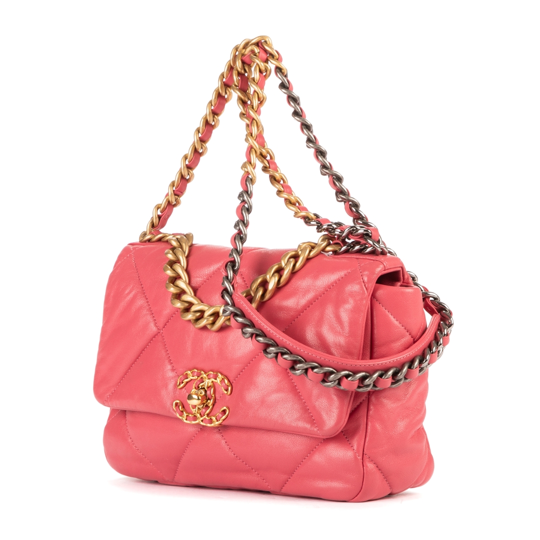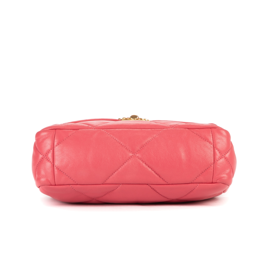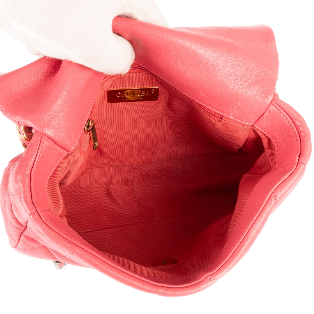 A vintage pink calf leather Chanel Classic 19 Flap bag with a certificate of authenticity, Approximately 17cm height, 25cm width.