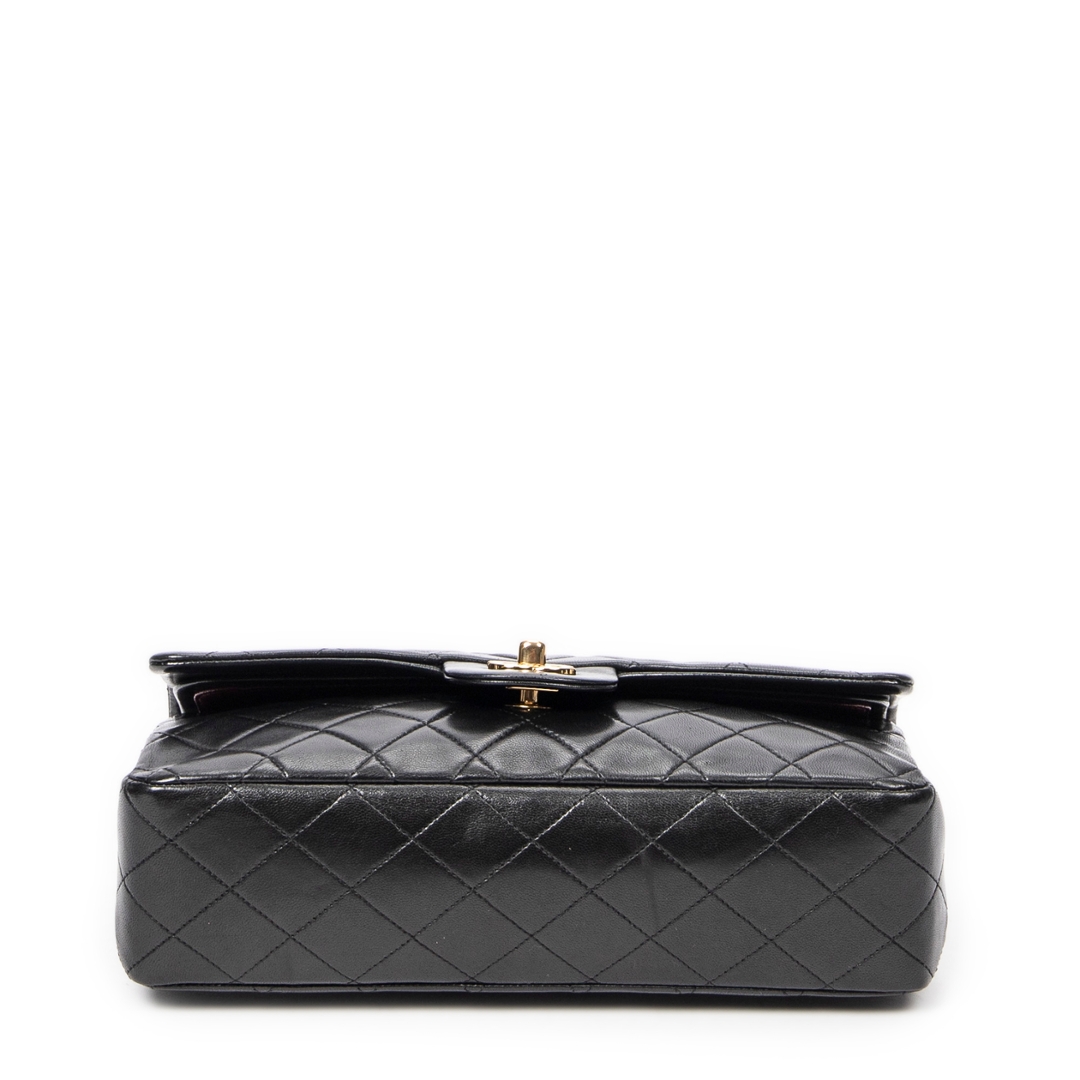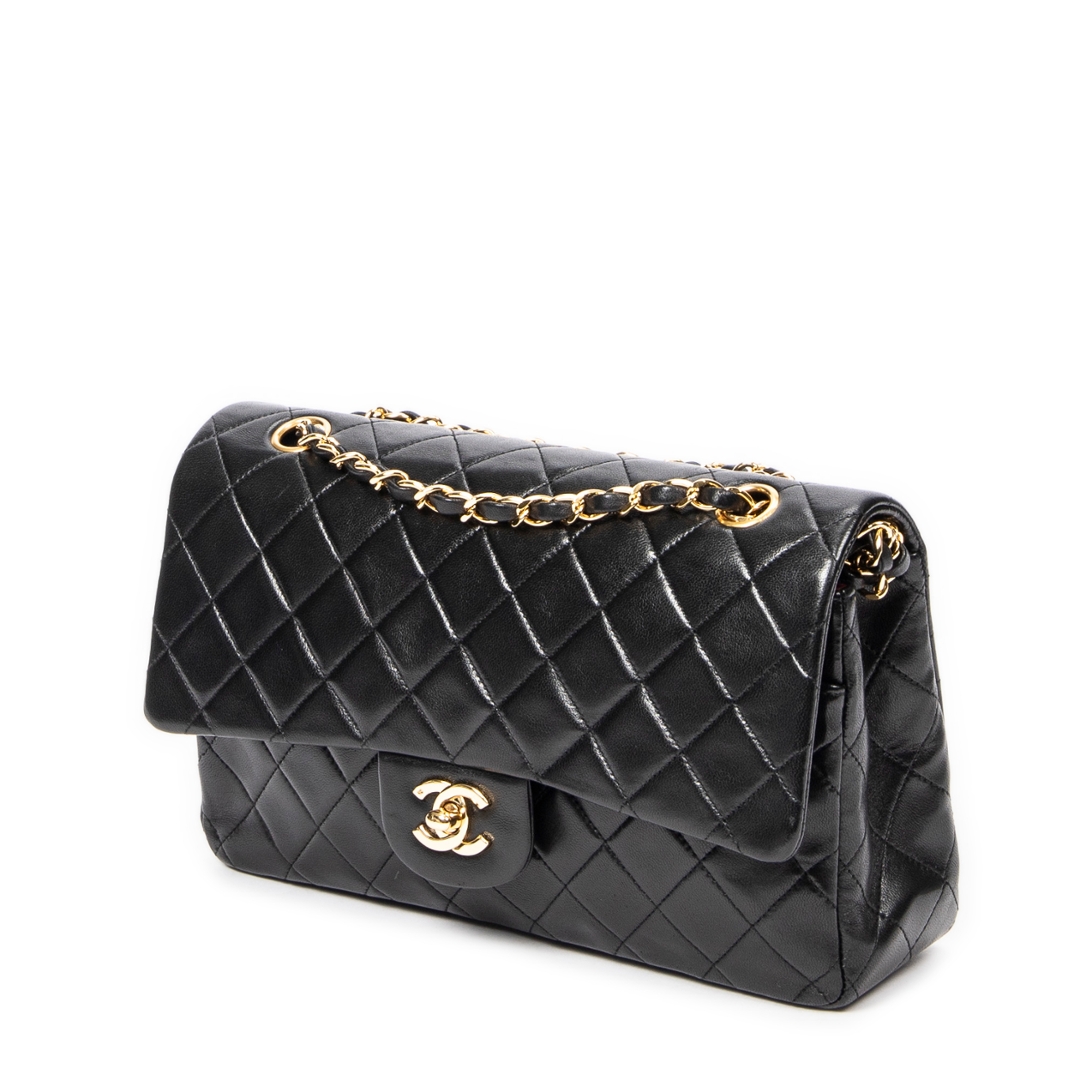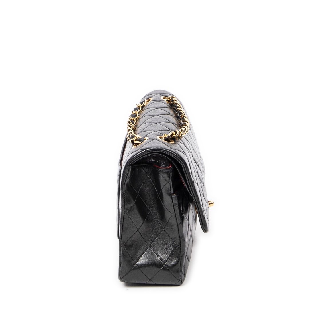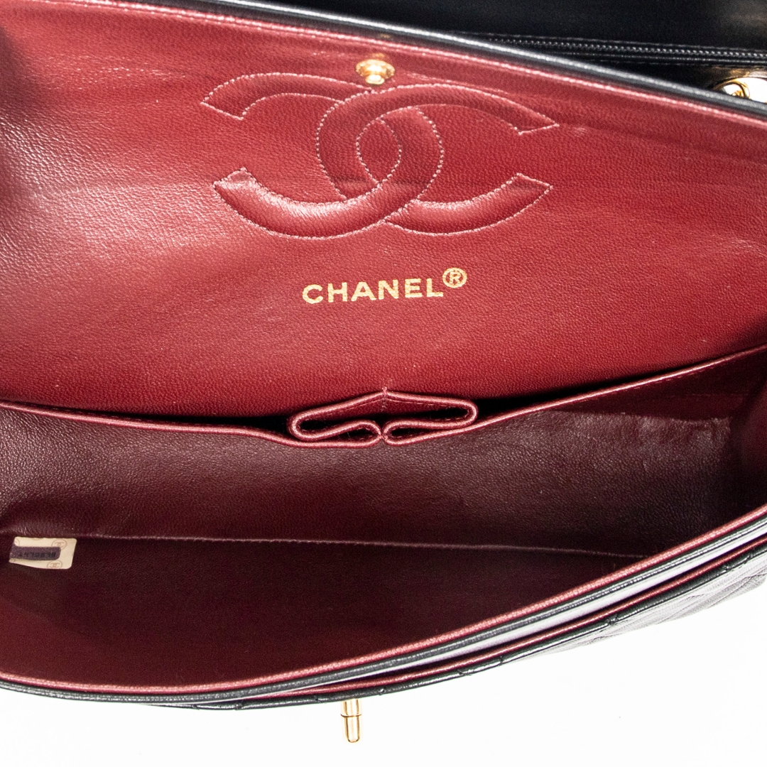 A vintage Chanel black quilted lambskin leather Classic Double Flap bag, representing one of the most iconic and enduring designs in luxury fashion. Crafted from supple lambskin, the signature diamond quilting enhances both texture and structure, while the gold-tone CC turn-lock closure and leather-interwoven chain strap deliver the unmistakable Chanel aesthetic.