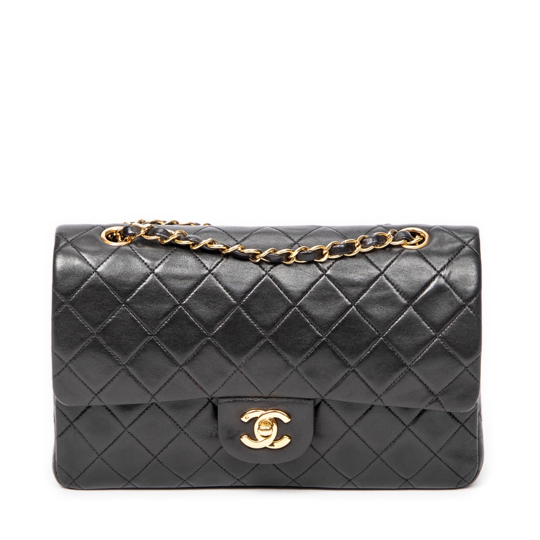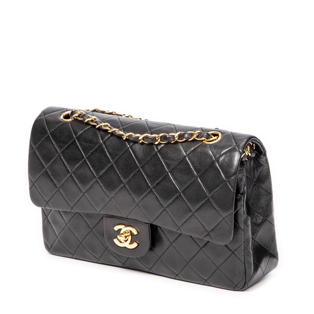 A vintage Chanel black quilted lambskin leather Classic Double Flap bag, epitomising the timeless elegance and craftsmanship synonymous with the house. Crafted from soft lambskin, the signature diamond quilting enhances both structure and texture, while the gold-tone CC turn-lock fastening and leather-interwoven chain strap deliver the unmistakable Chanel aesthetic.