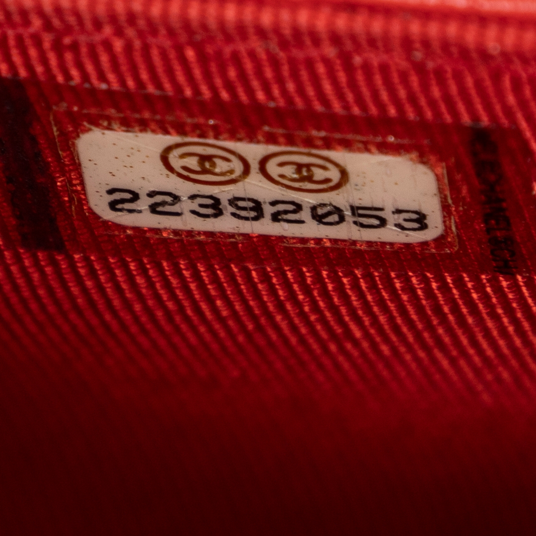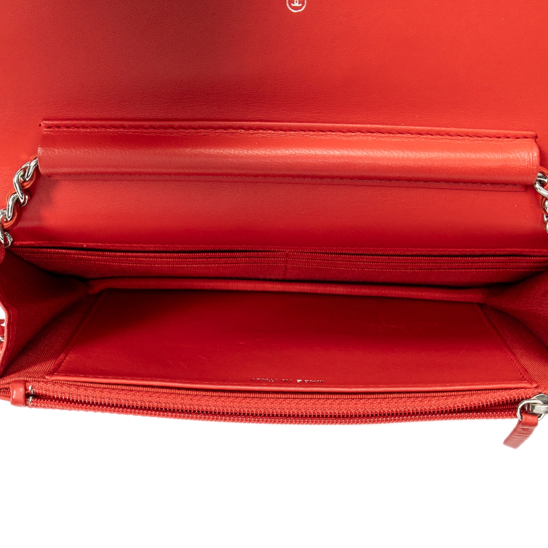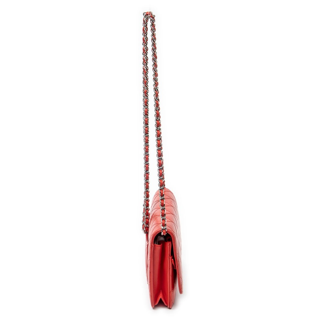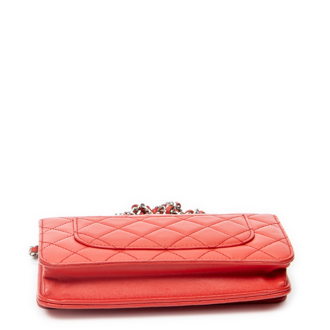 A vintage Chanel red calf leather Classic Wallet On Chain bag with a certificate of authenticity, Approximately 12cm height, 19cm width.