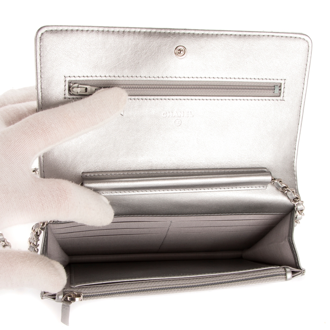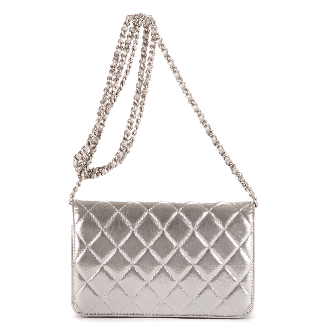 A vintage Chanel metallic silver calf leather Classic Wallet on Chain bag with a certificate of authenticity, Approximately 12cm height, 19cm width.