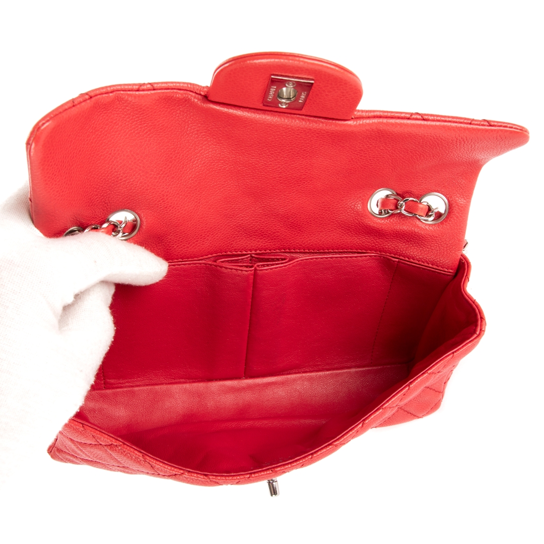A vintage Chanel red calf leather East-West Single Flap bag with a certificate of authenticity, Approximately 11cm height, 25cm width.