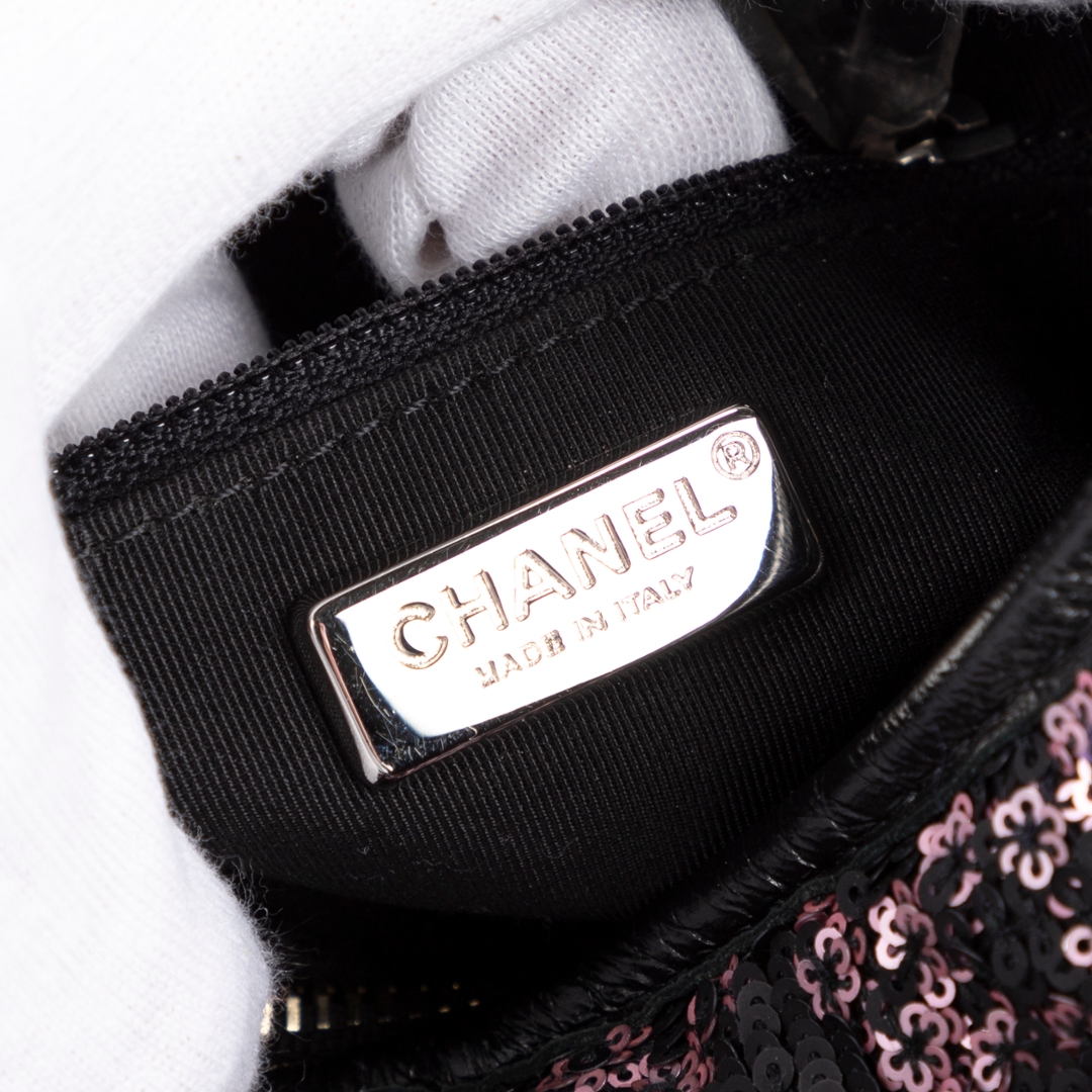 A vintage Chanel Gabrielle Sequins bag, combining black calfskin leather with shimmering sequin canvas for a striking and contemporary interpretation of a classic silhouette. The softly structured body is elevated by the contrast between smooth leather and textured sequins, while the iconic CC charm detail adds a refined and instantly recognisable Chanel signature.
