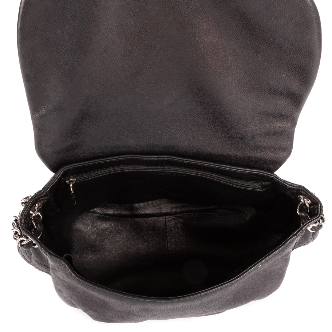 The half moon shape provides a relaxed yet structured form, allowing for practical everyday use while maintaining a polished appearance. Chain shoulder straps with leather interwoven detailing enhance both comfort and durability, while silver-tone hardware complements the deep black finish for a cohesive and contemporary look. The spacious interior is well-suited to carrying daily essentials with ease.