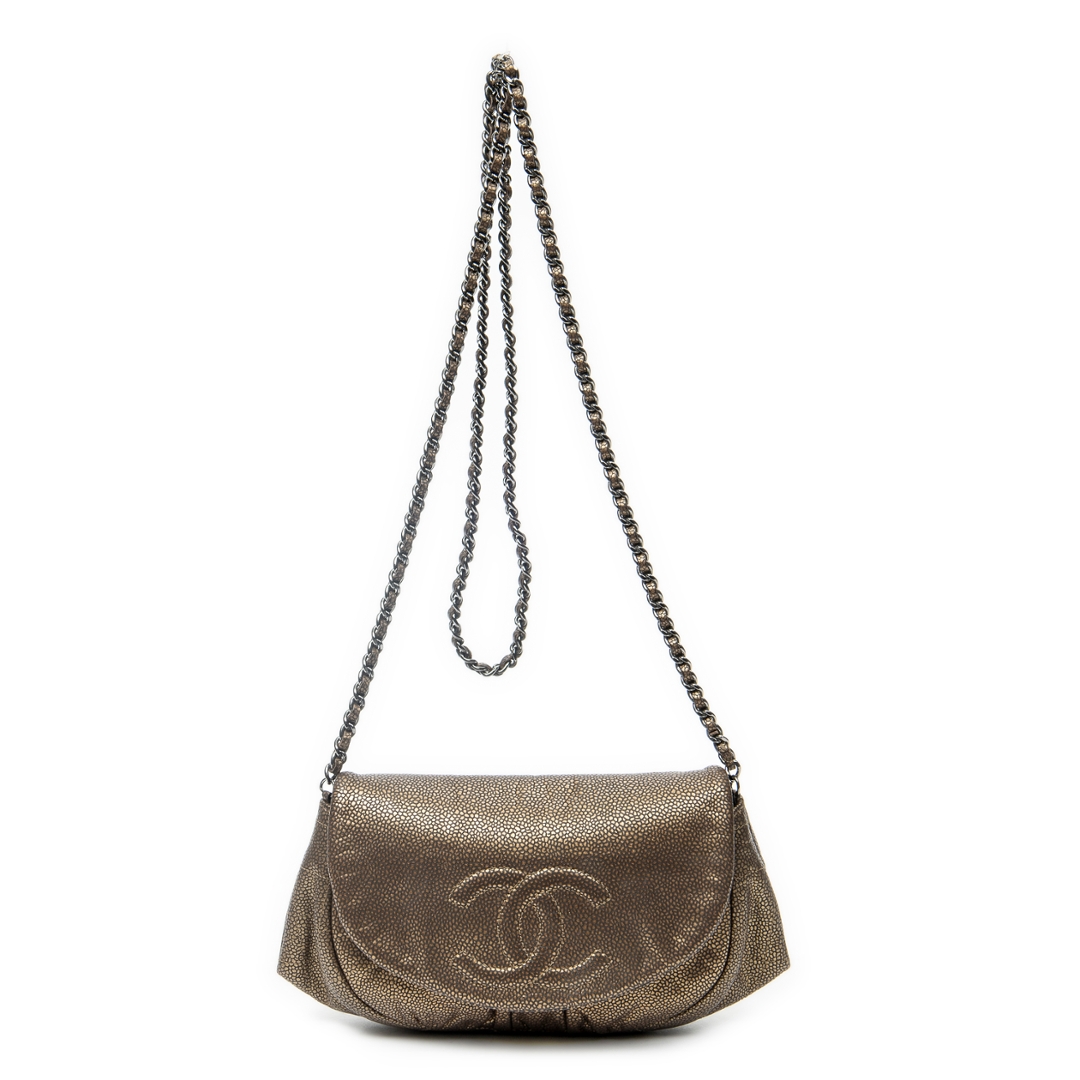 A vintage Chanel bronze calf leather Half Moon Wallet on Chain bag with a certificate of authenticity, Approximately 12cm height, 26cm width.