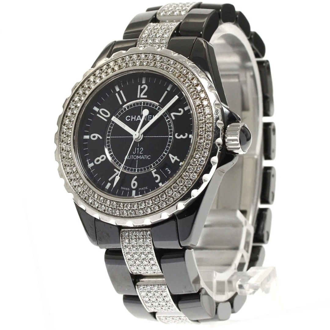 A Chanel J12 reference H1339, crafted in black ceramic and elevated with an extensive diamond-set case, bezel, and bracelet. This model exemplifies Chanel’s distinctive approach to watchmaking, combining high-fashion design with technical watchmaking to create a piece that is both bold and refined. The deep black dial, paired with luminous Arabic numerals and hands, creates a strong contrast against the brilliance of the surrounding diamonds.