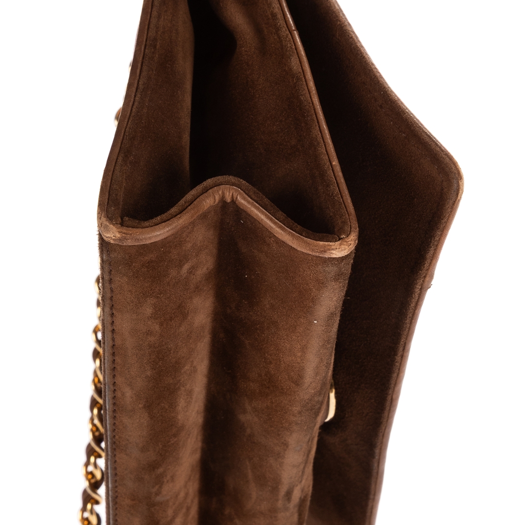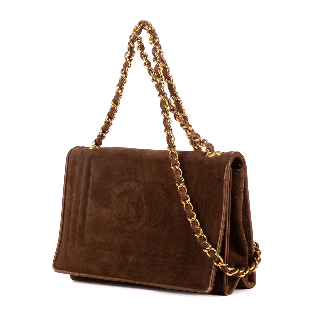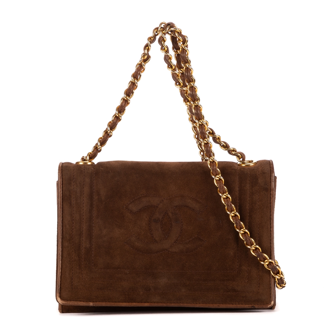 A vintage Chanel brown suede calf leather Logo Chain Flap bag with a certificate of authenticity, Approximately 14cm height, 20cm width.