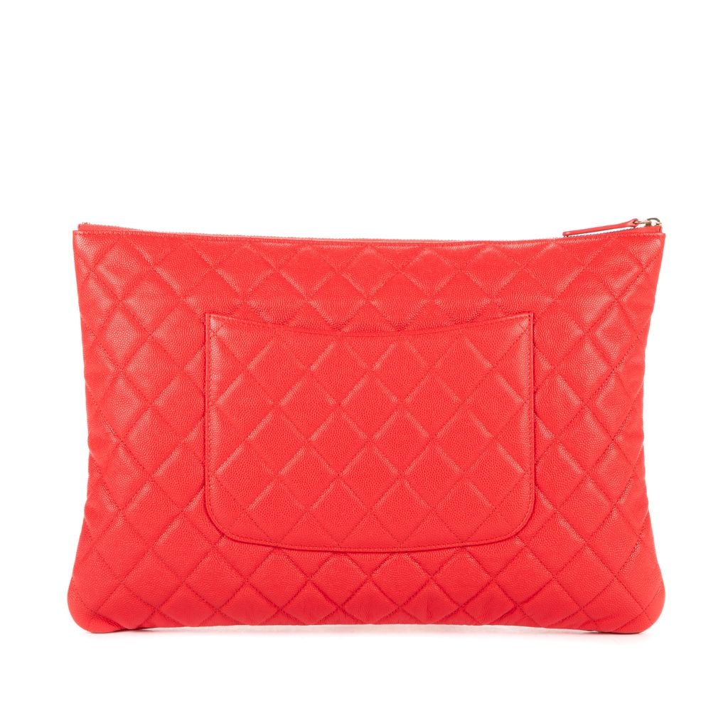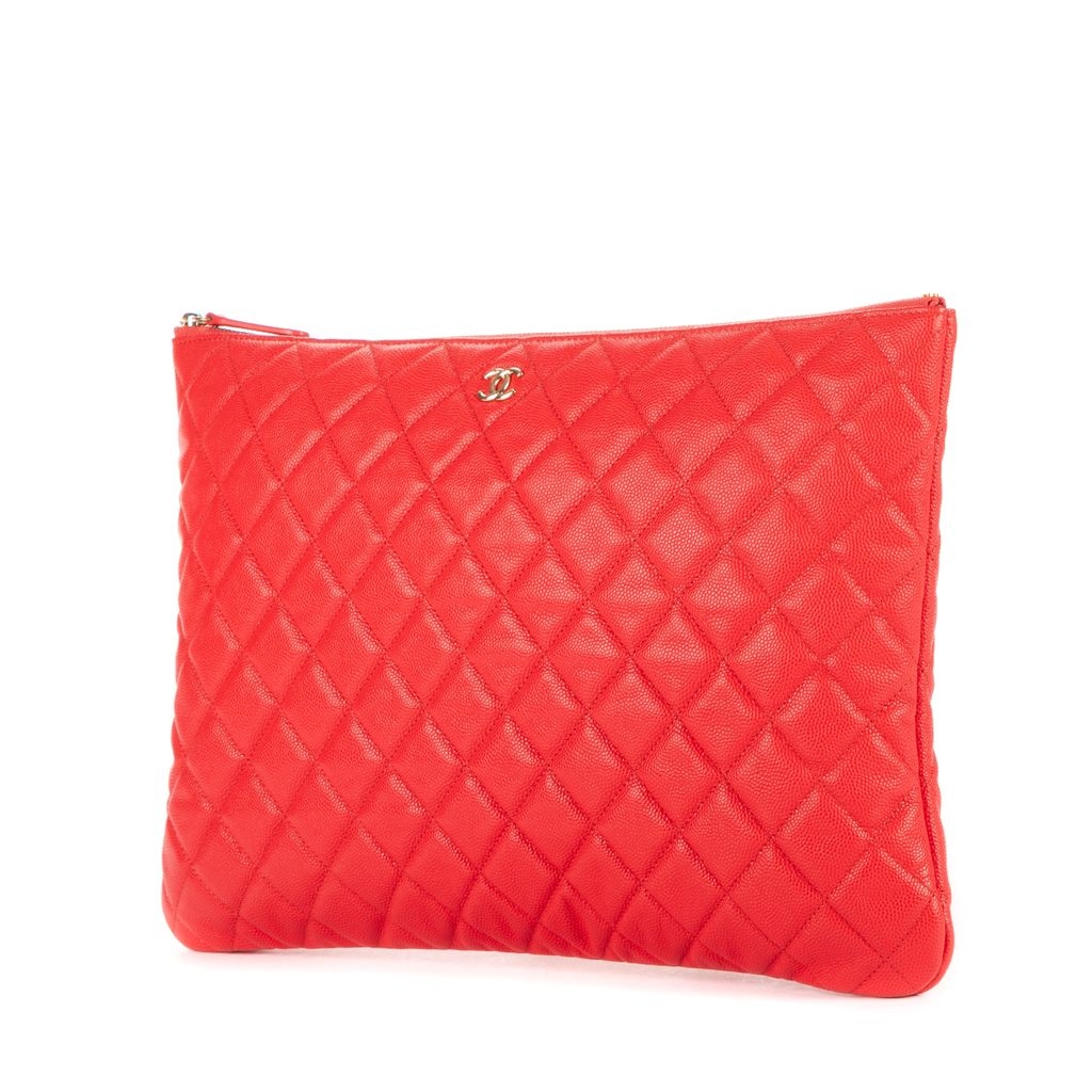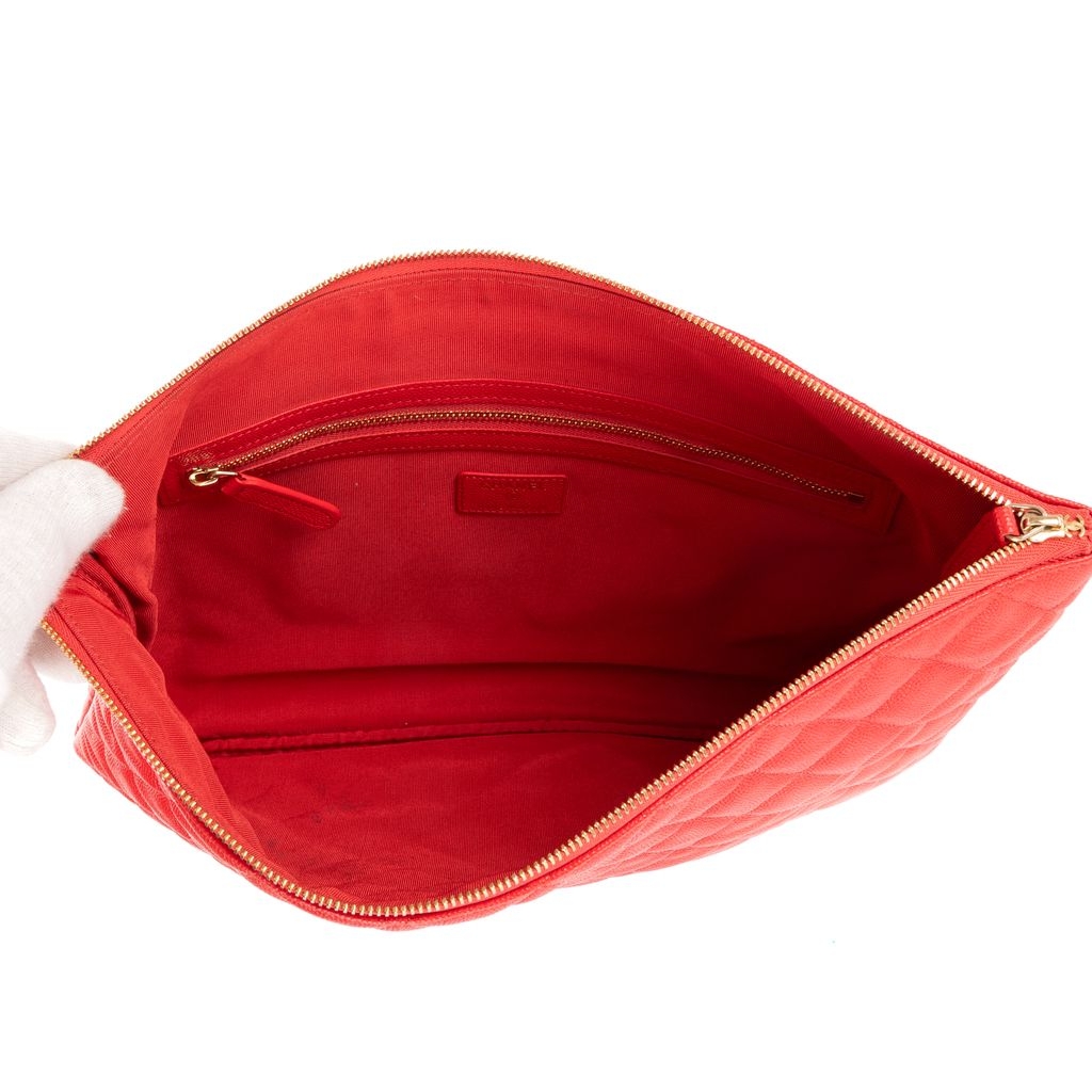 A vintage Chanel red calf leather Logo Zip Clutch bag with a certificate of authenticity, Approximately 23cm height, 34cm width.
