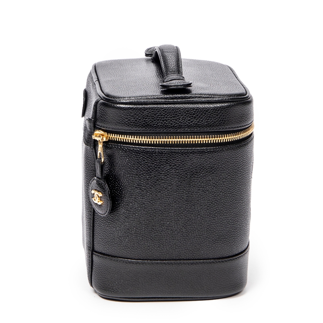 A vintage Chanel black calf leather Timeless Tall Vanity Case bag with a certificate of authenticity, Approximately 16cm height, 15cm width.