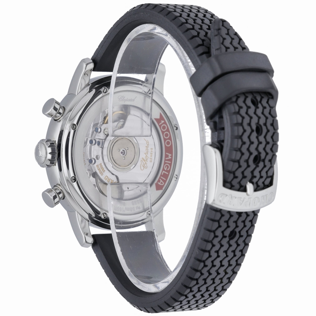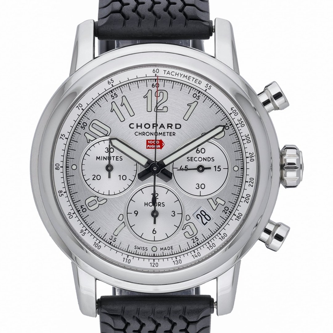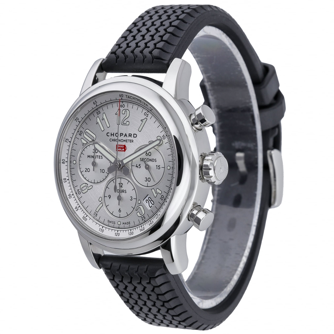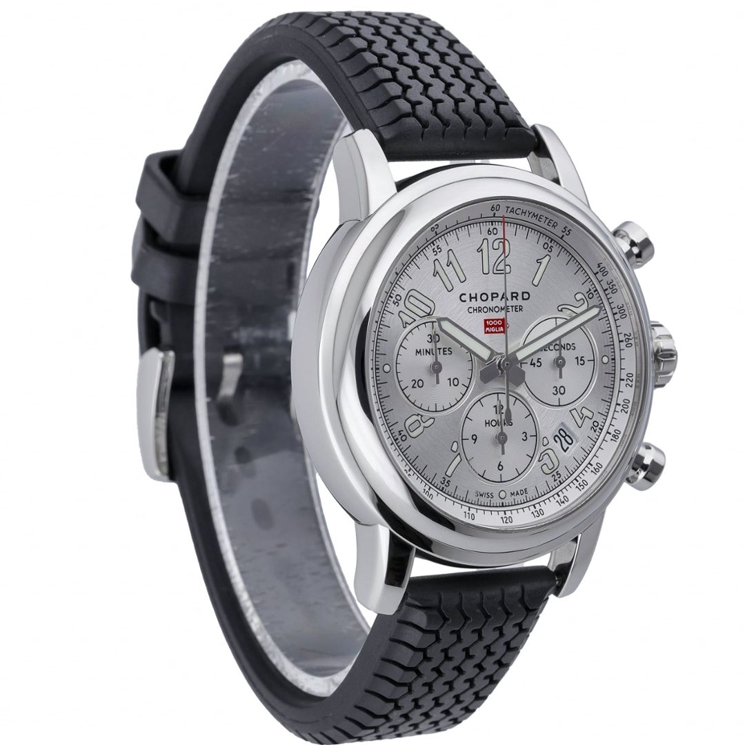 The 42mm stainless steel case frames a silver dial featuring bold Arabic numerals and three chronograph sub-dials positioned at 3, 6, and 9 o’clock, measuring seconds, hours, and minutes. A tachymeter scale runs around the outer edge of the dial, allowing speed calculations over distance while reinforcing the watch’s racing heritage. The distinctive red Mille Miglia arrow logo sits beneath the Chopard signature, referencing the iconic road race, while a neatly positioned date aperture is positioned between 4 and 5 o’clock. Powering the watch is an automatic chronometer-certified movement, delivering reliable and precise performance.