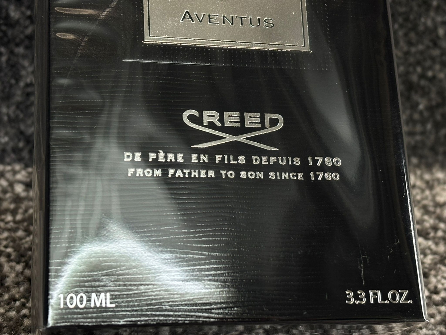 A bottle of Creed - Aventus Eau De Parfum in a presentation box.