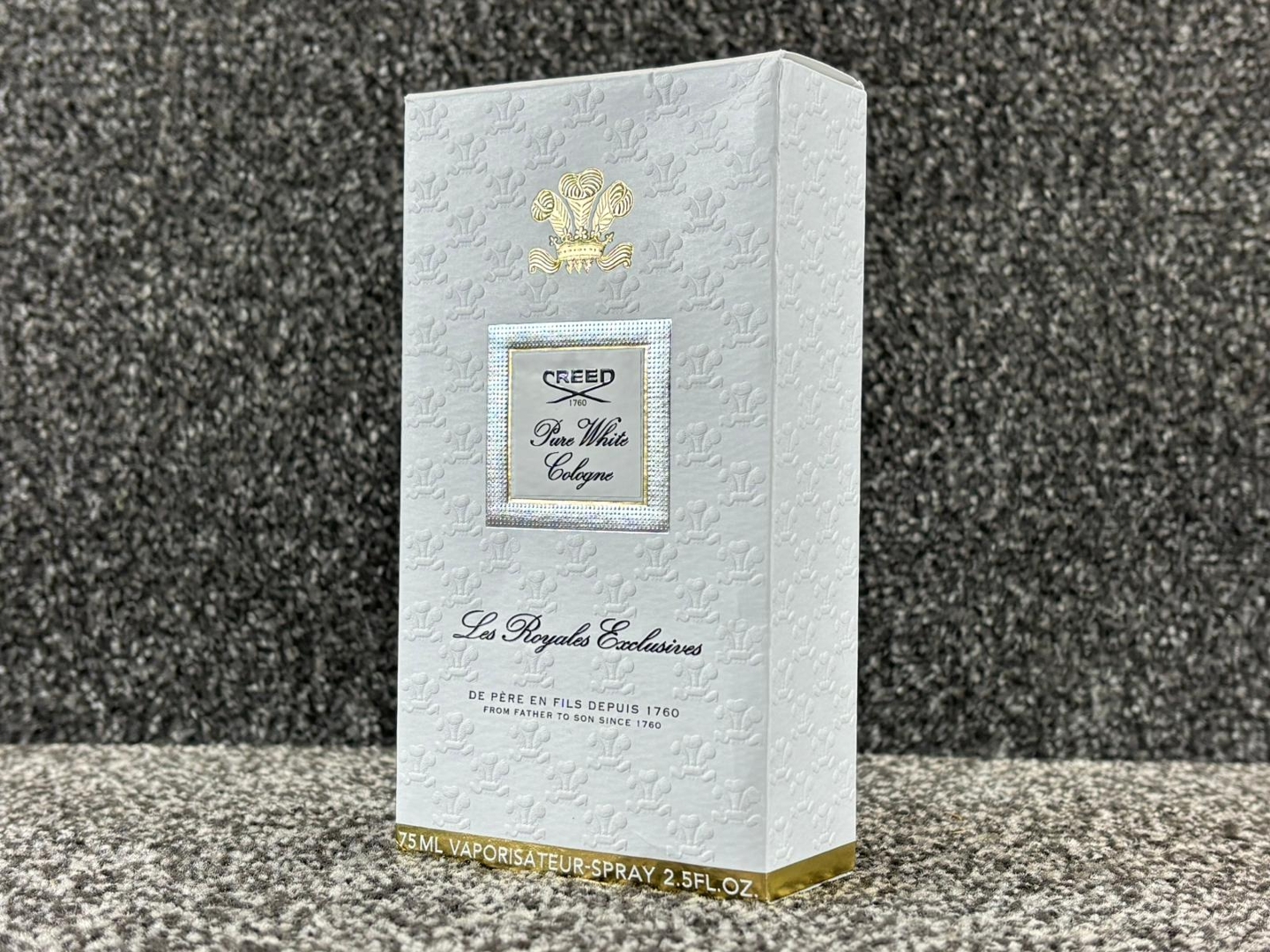 A 75ml bottle of Creed Pure White Cologne Vaporisateur Spray, presented in its original presentation box, offering a clean and quietly luxurious fragrance from the House of Creed. Pure White Cologne is defined by its refined minimalism, delivering an understated yet confident scent that feels crisp, elegant, and effortlessly wearable across all seasons.
