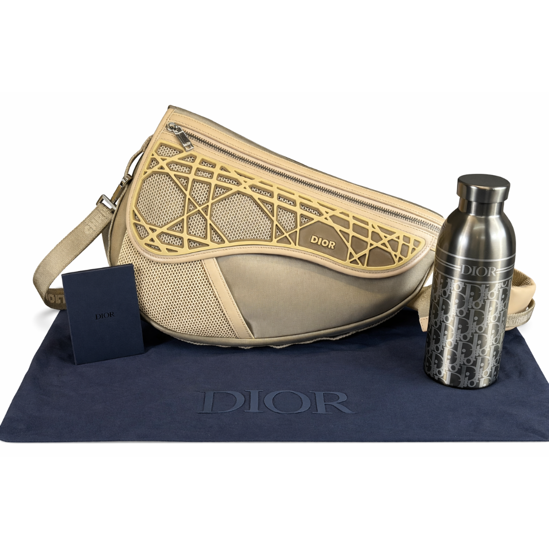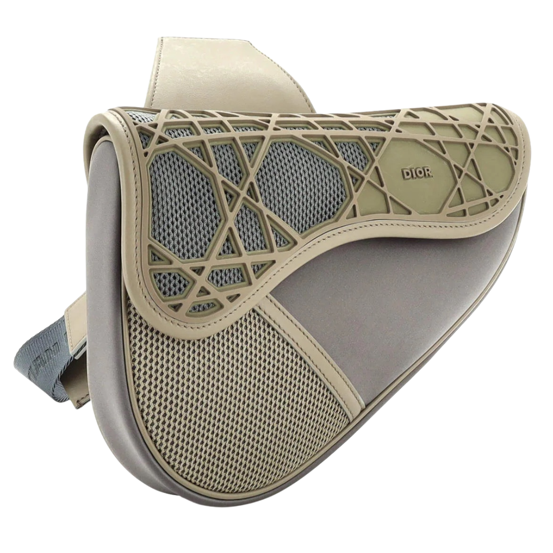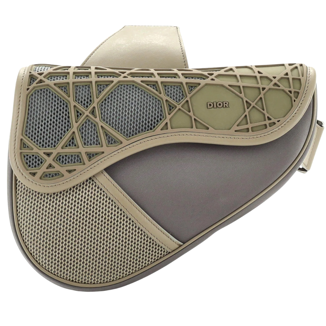 A Dior beige technical fabric saddle bag, reimagining the house’s iconic silhouette with a contemporary, sport-inspired aesthetic. The combination of structured leather panels and breathable mesh inserts creates a layered, textured look, while the standout geometric overlay adds a bold, architectural element across the front. Finished with subtle Dior branding, the design delivers a modern and distinctive take on a classic style.