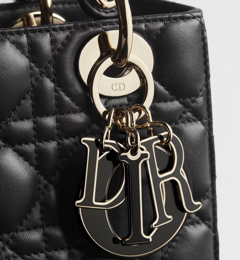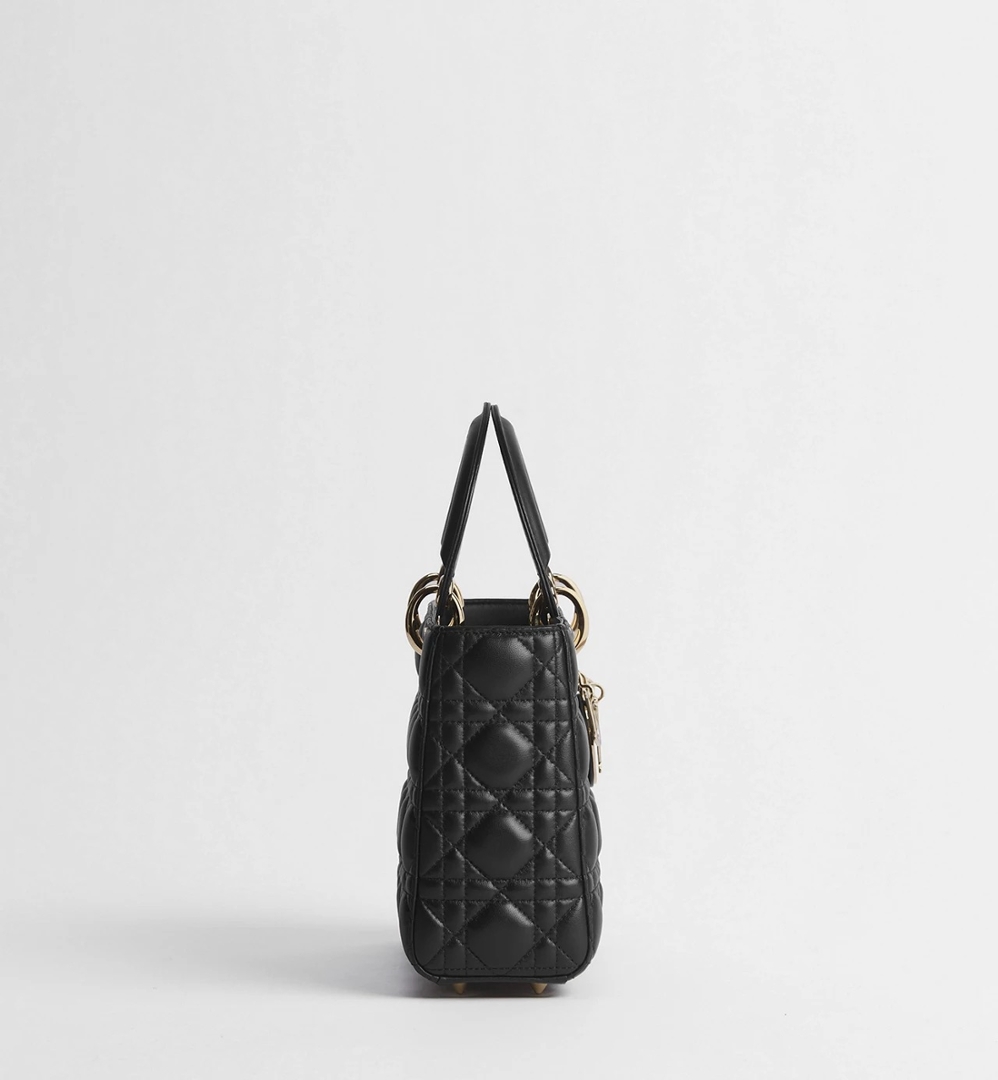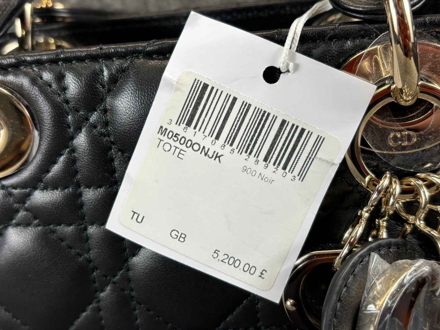 A brand new Dior Black Cannage Quilted Leather Lady Dior Mini Bag with Gold-Tone Hardware & Charm Set, Approximately 15cm height, 18cm width.
