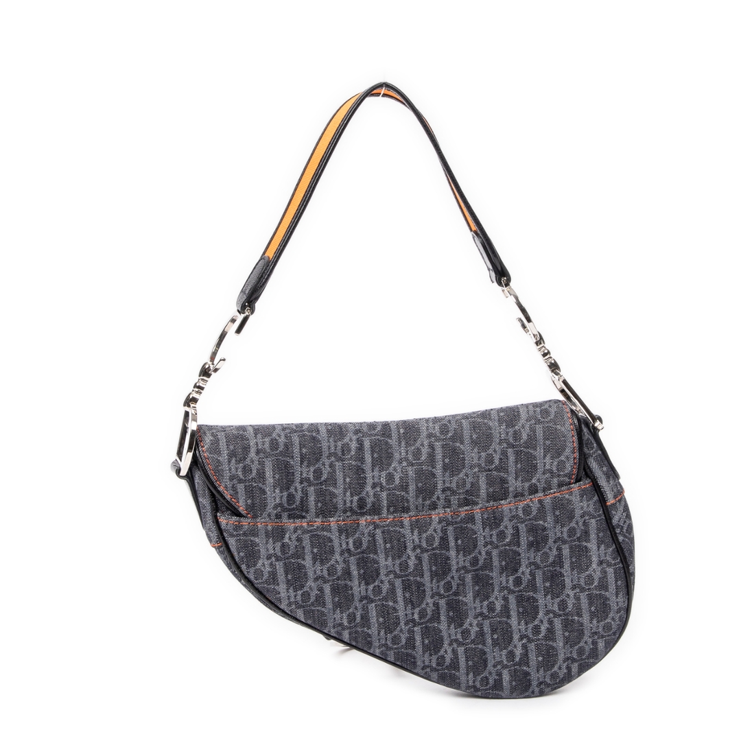 A vintage denim blue canvas Dior Flight Saddle bag with a certificate of authenticity, Approximately 19cm height, 26cm width.