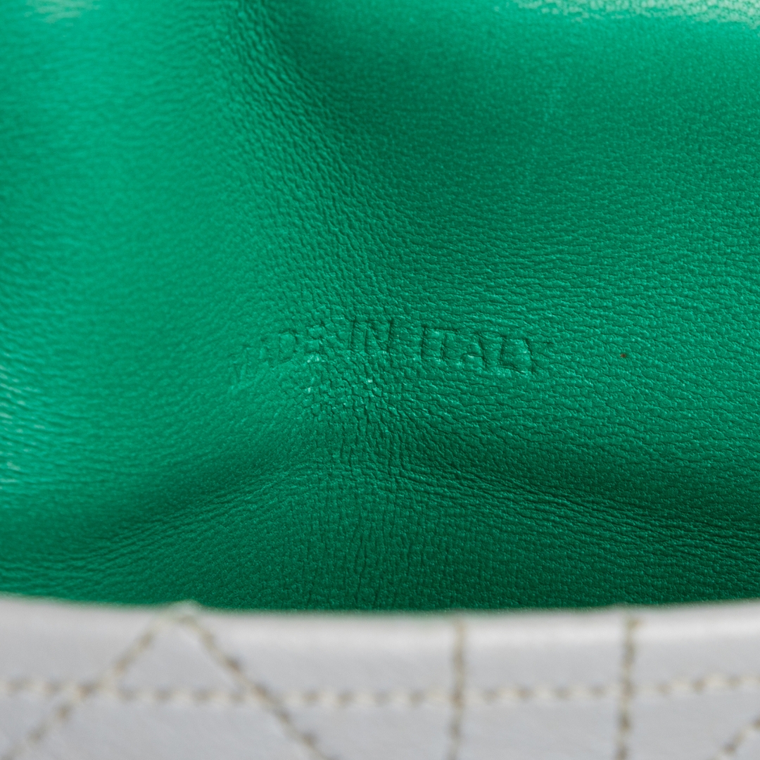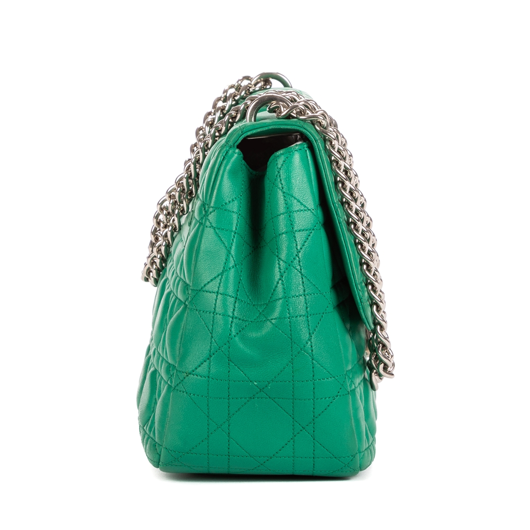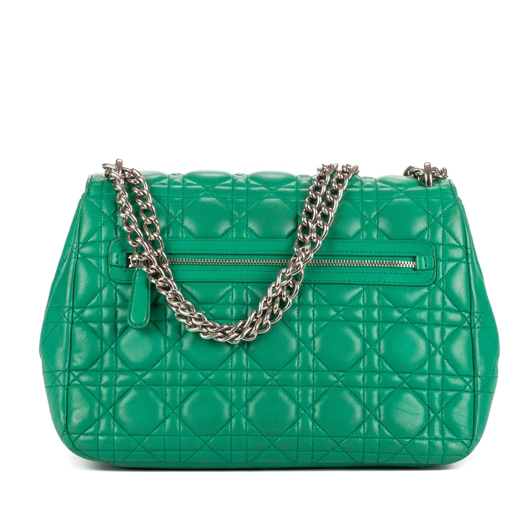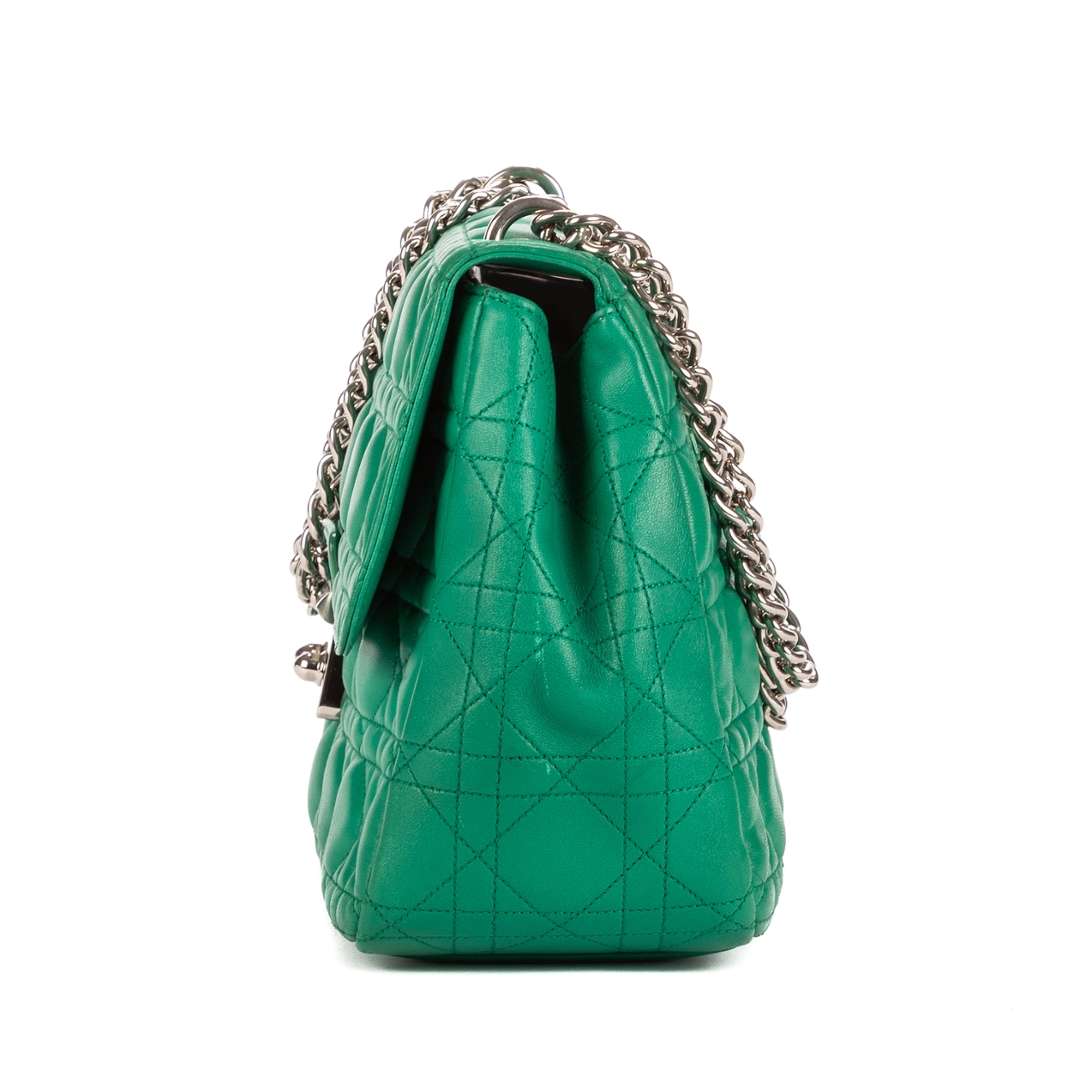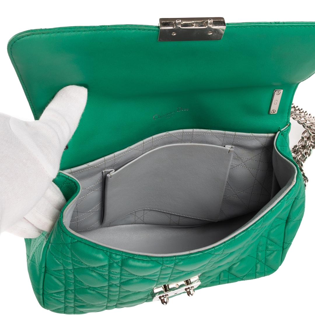 A vintage Dior Miss Dior bag radiates elegance and confidence in a striking shade of green. Crafted from premium calf leather, it features Dior’s signature Cannage stitching — an iconic pattern inspired by the house’s couture heritage. The supple texture and structured silhouette are beautifully complemented by the gleaming silver-tone hardware and the distinctive clasp lock engraved with the Dior logo.