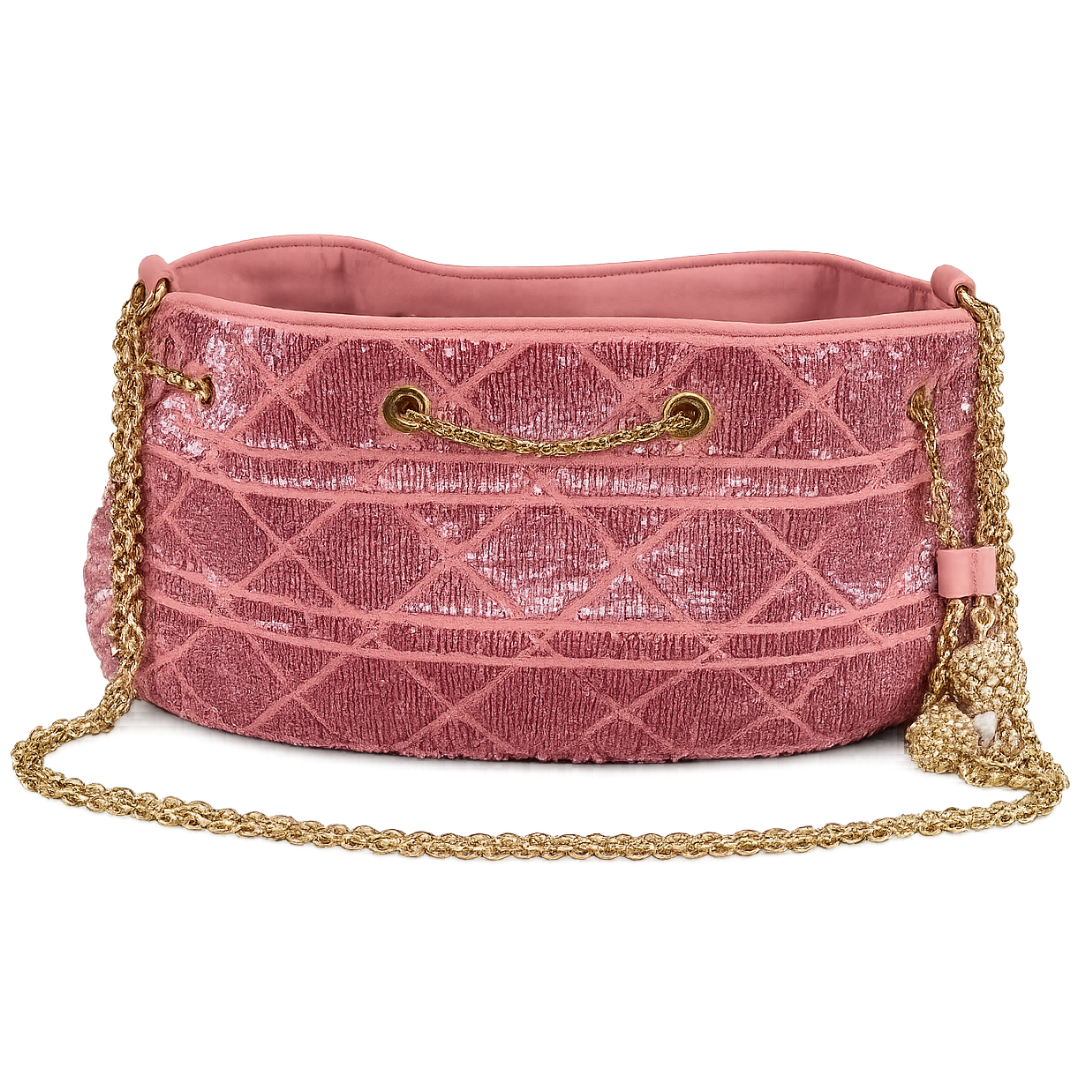 A Dune London pink monogram canvas pochette, designed with a softly structured silhouette and finished in a distinctive geometric monogram pattern that delivers instant visual appeal. The warm blush tone is elevated by subtle shimmer throughout the fabric, while gold-tone eyelets and delicate chain detailing add a refined contrast, giving the piece a polished evening-ready aesthetic.