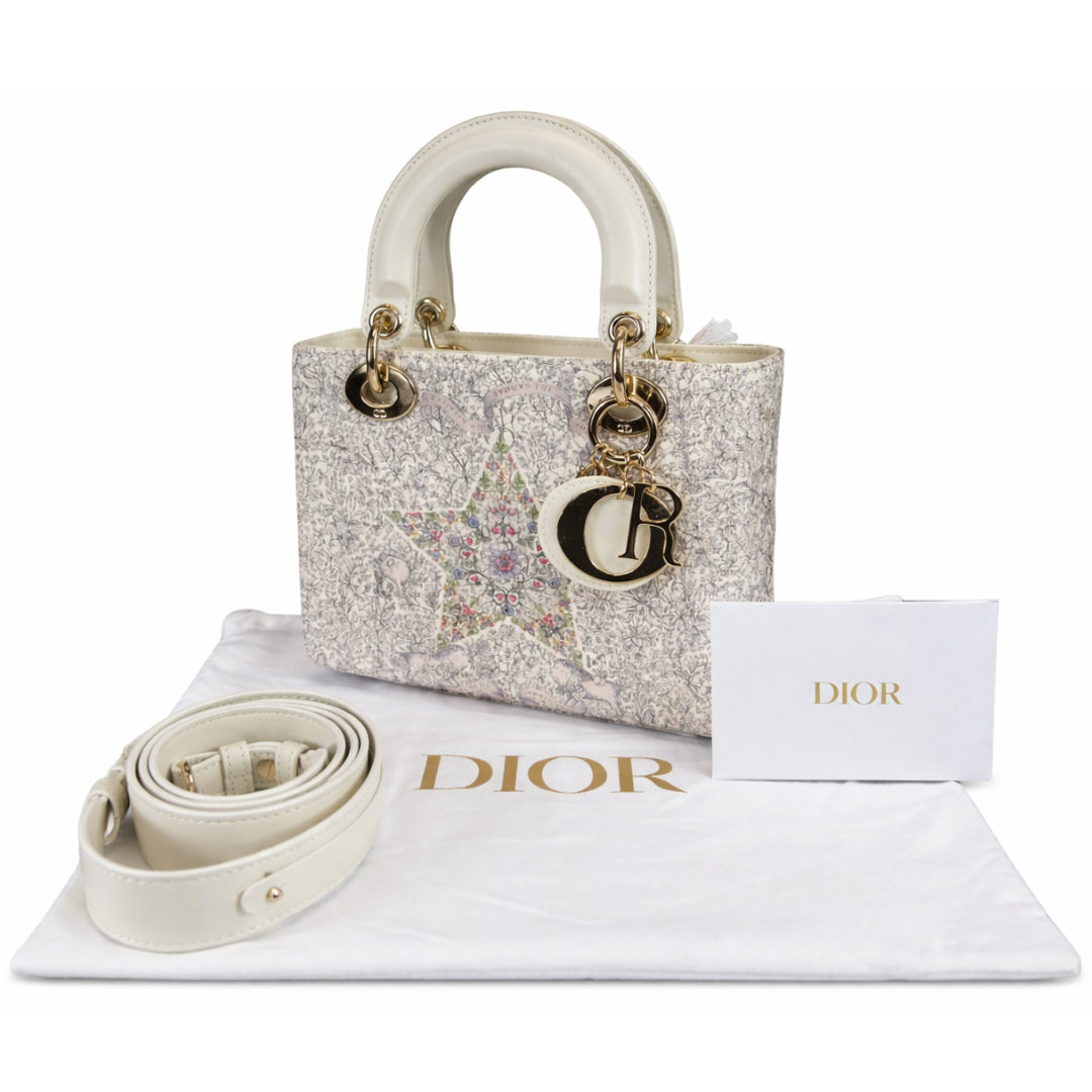 A brand new Dior Lady Dior Star tote bag, crafted from printed canvas with smooth leather trim, showcasing a distinctive and artistic interpretation of the house’s iconic silhouette. The intricate monochrome toile-style print is elevated by a central star motif adorned with delicate floral detailing, creating a unique and highly collectible design that blends heritage inspiration with contemporary flair.