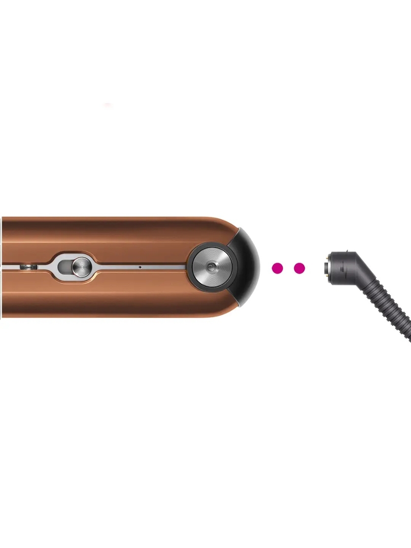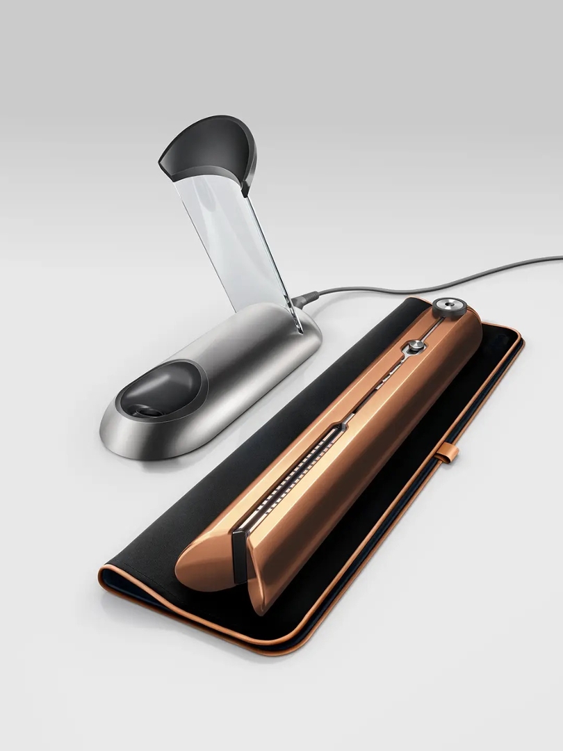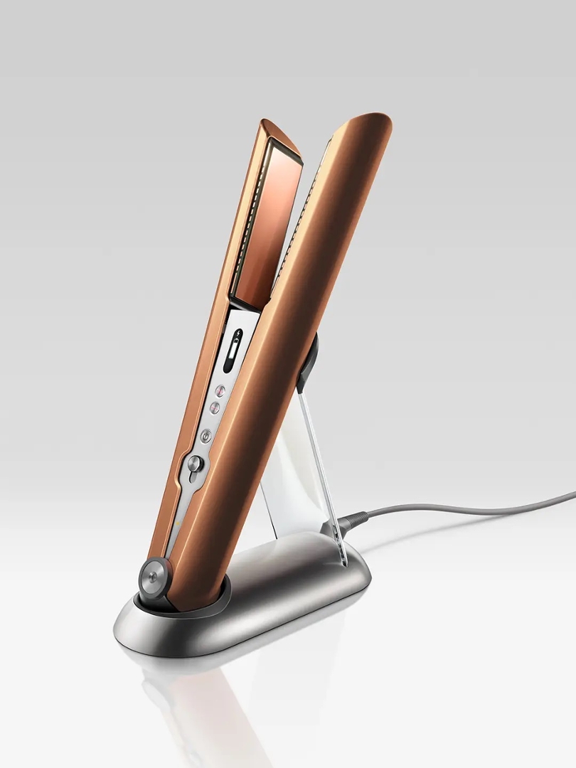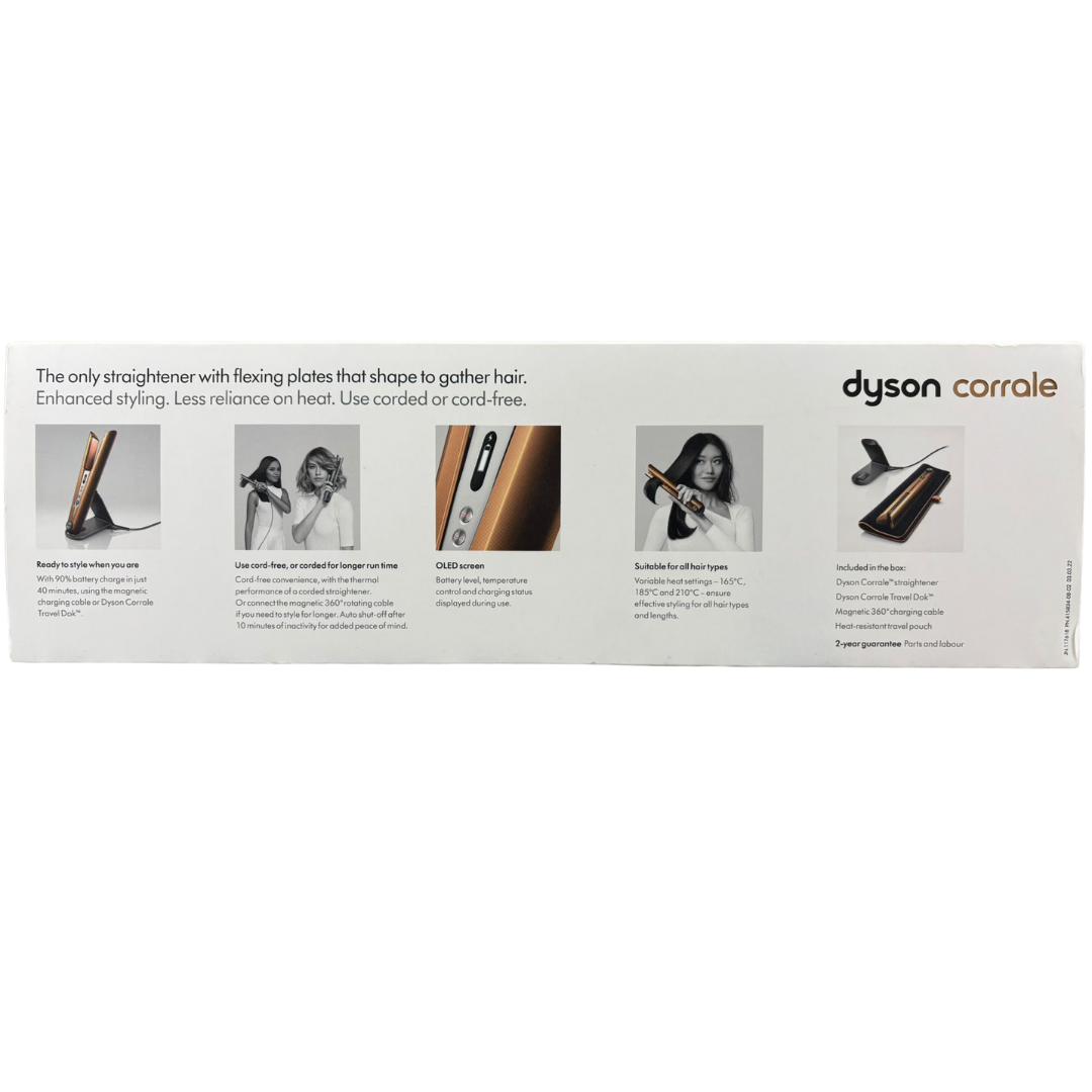 The Dyson Corrale Hair Straightener represents a refined approach to styling, combining cutting-edge engineering with a distinctive copper and bright nickel finish. Designed by Dyson, this cordless straightener features flexing manganese copper alloy plates that adapt to the hair, gathering strands neatly for enhanced control. This intelligent design allows for smooth, even styling while maintaining a sleek, modern aesthetic that feels substantial and well balanced in the hand.