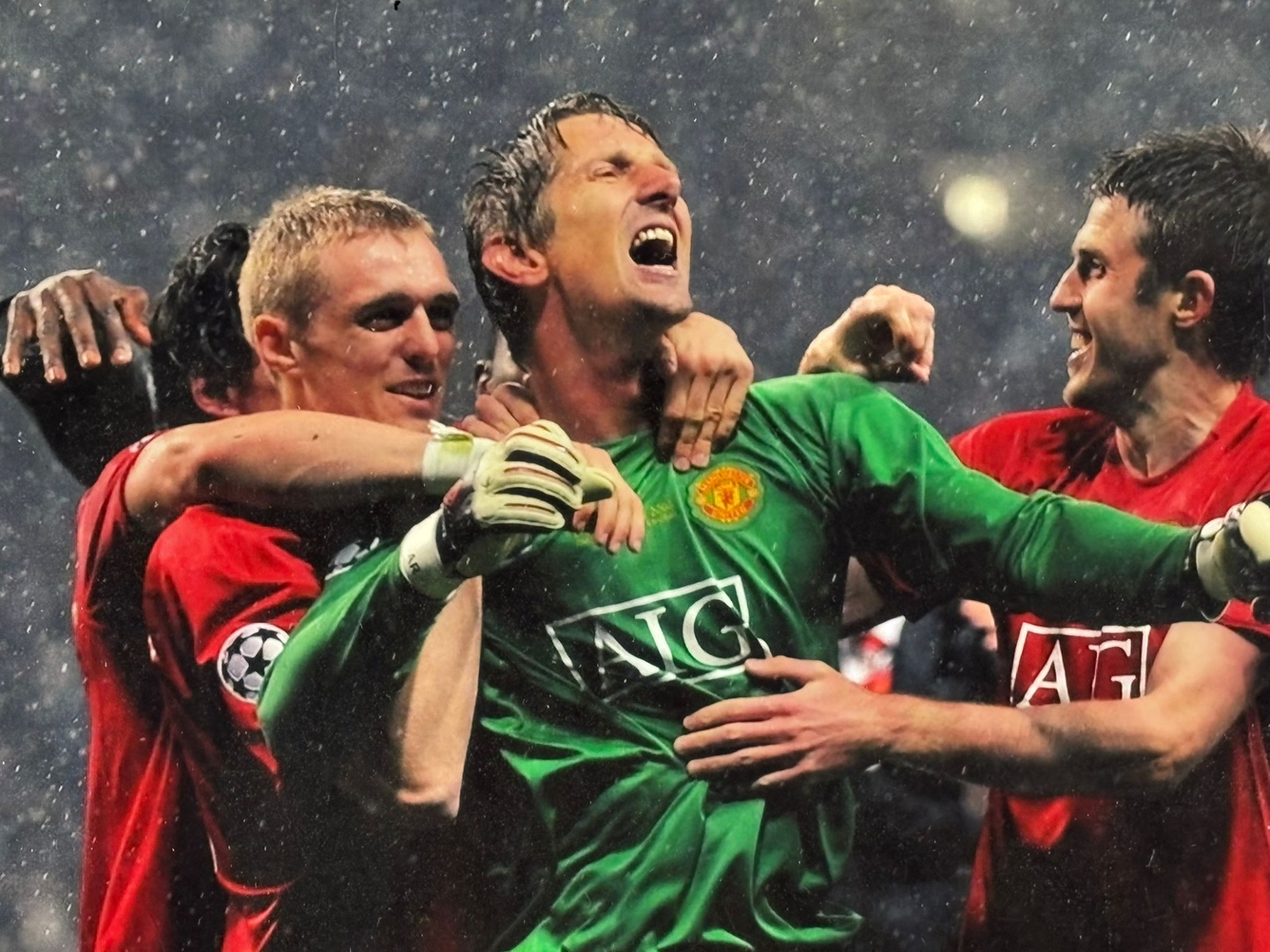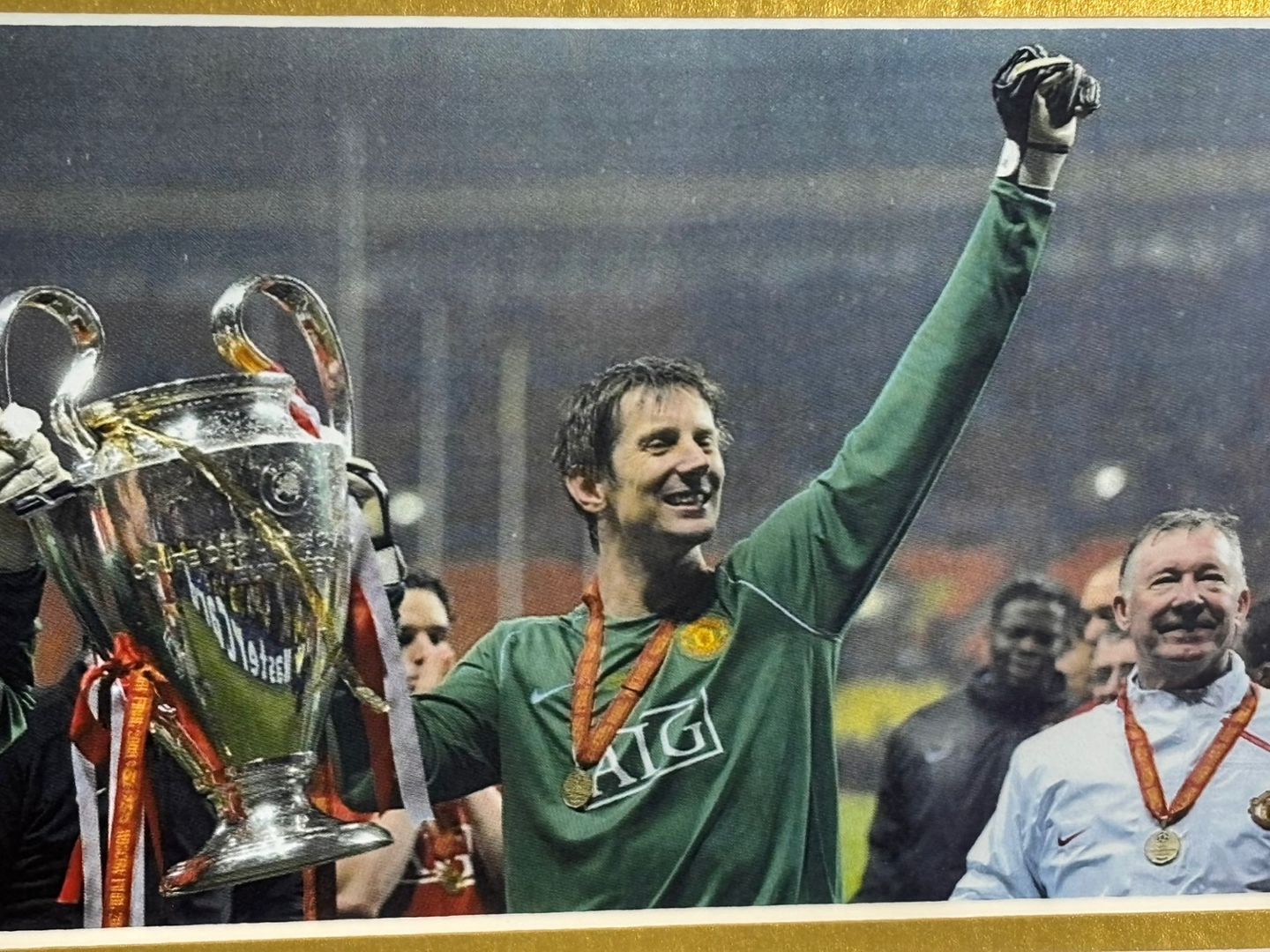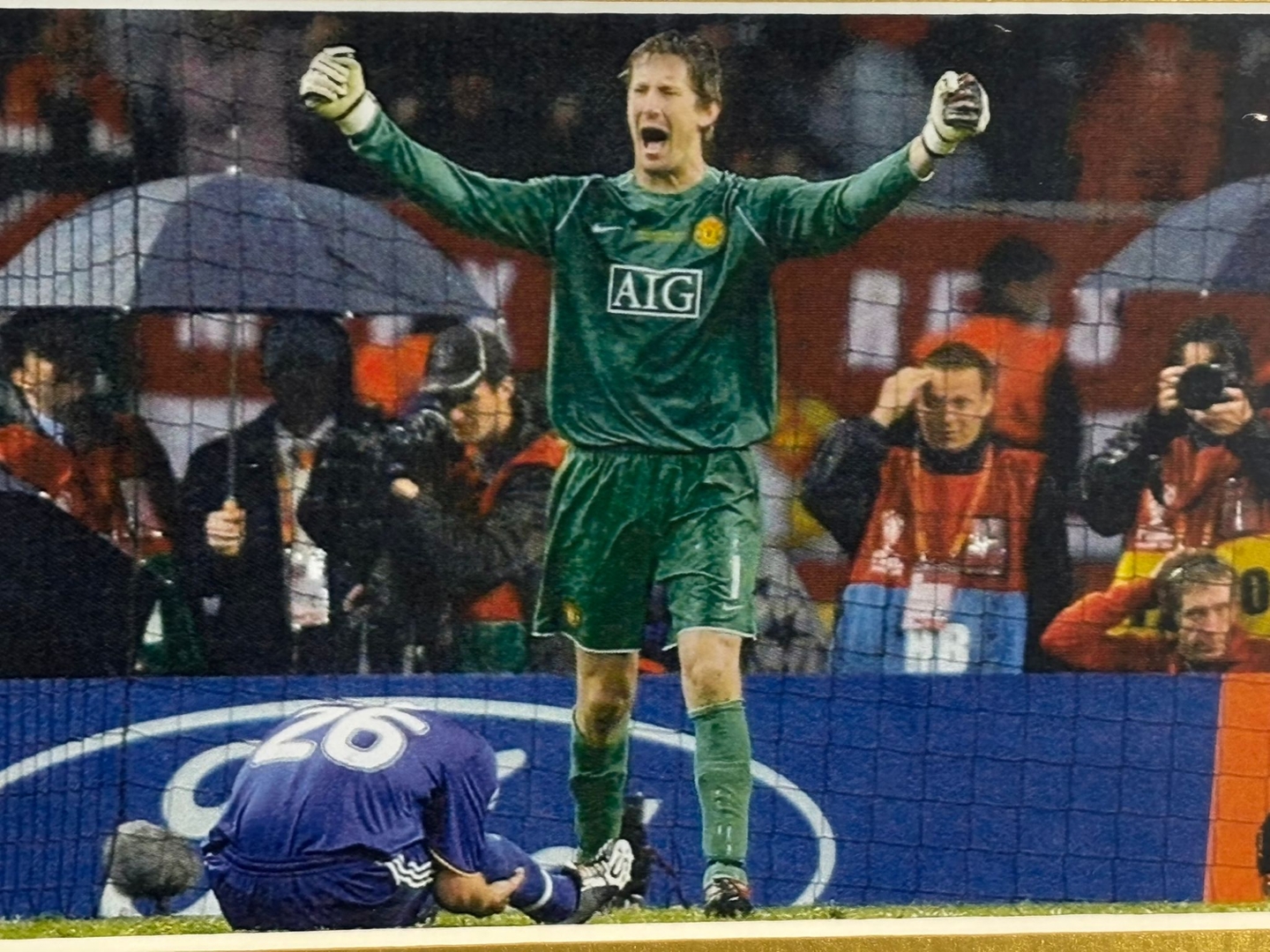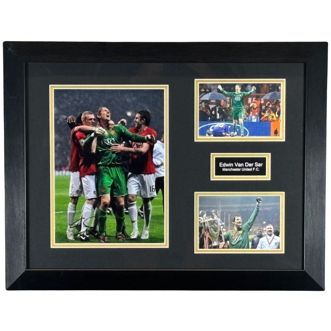 The central signed photograph immortalises the moment of triumph during Manchester United’s 2008 UEFA Champions League victory, where van der Sar’s crucial penalty save sealed European glory. The surrounding images feature him in jubilant celebration, lifting the Champions League trophy and commanding his goal with trademark composure.