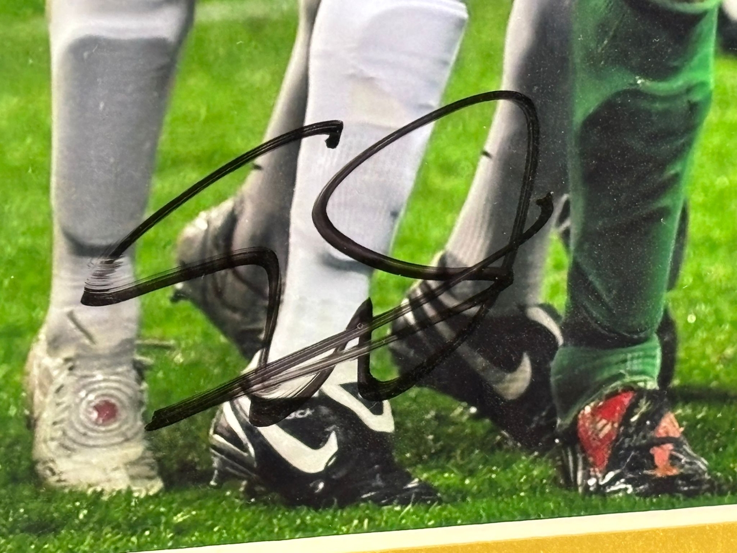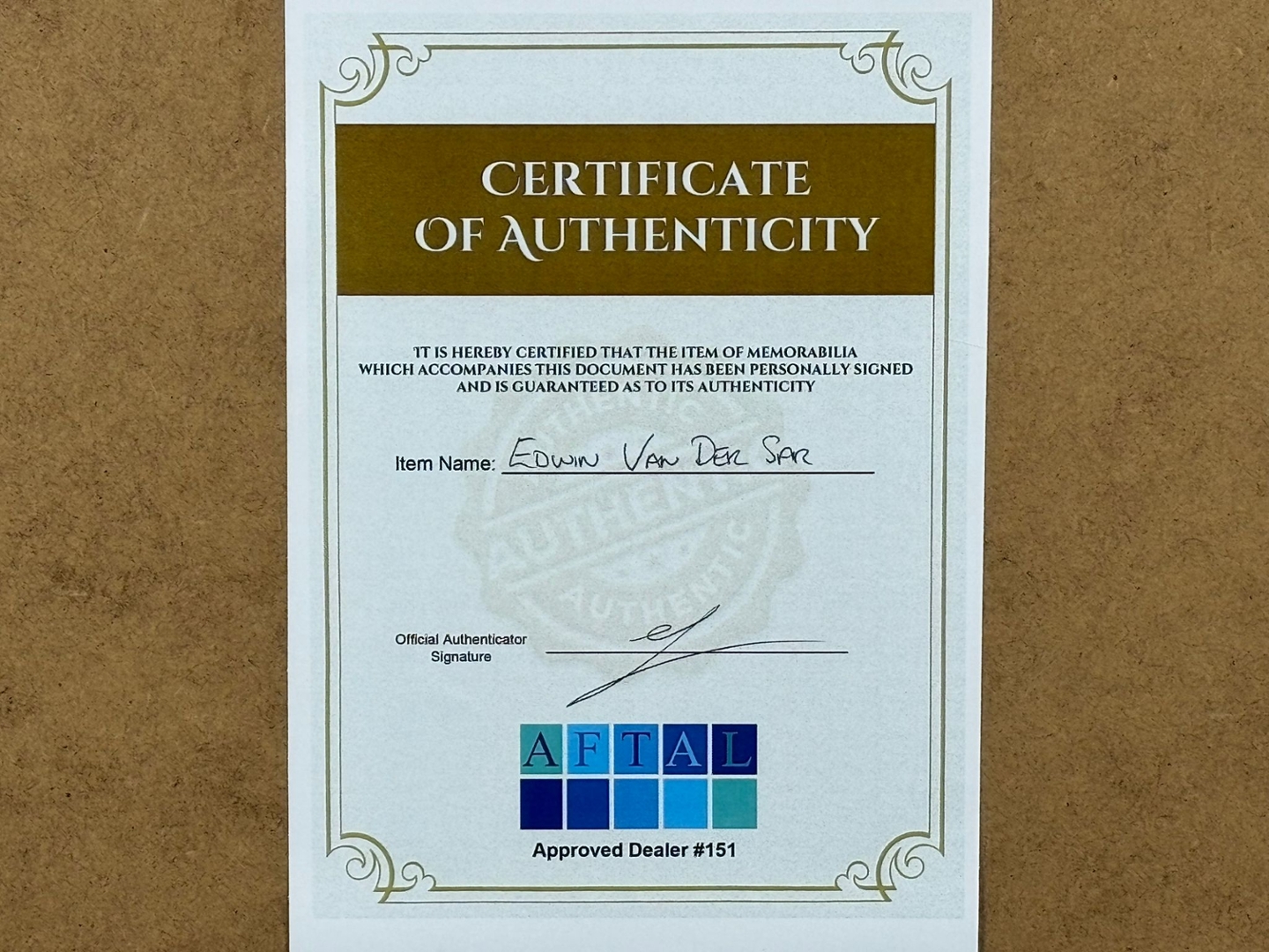 A signed and authenticated Edwin van der Sar Manchester United picture montage is a remarkable collector’s display celebrating one of the greatest goalkeepers in football history. Elegantly framed and presented, it measures approximately 45cm in height and 57cm in width, showcasing three unforgettable images that capture van der Sar’s brilliance and leadership between the posts.