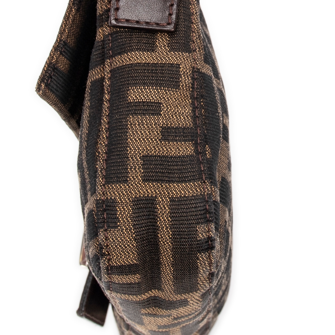 A vintage Fendi khaki/dark brown canvas Baguette bag with a certificate of authenticity, Approximately 14cm height, 26cm width.
