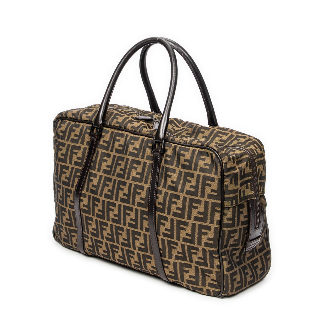 A vintage Fendi tan/dark brown canvas Duffle Bag with a certificate of authenticity. Approximately 29cm height, 43cm width.