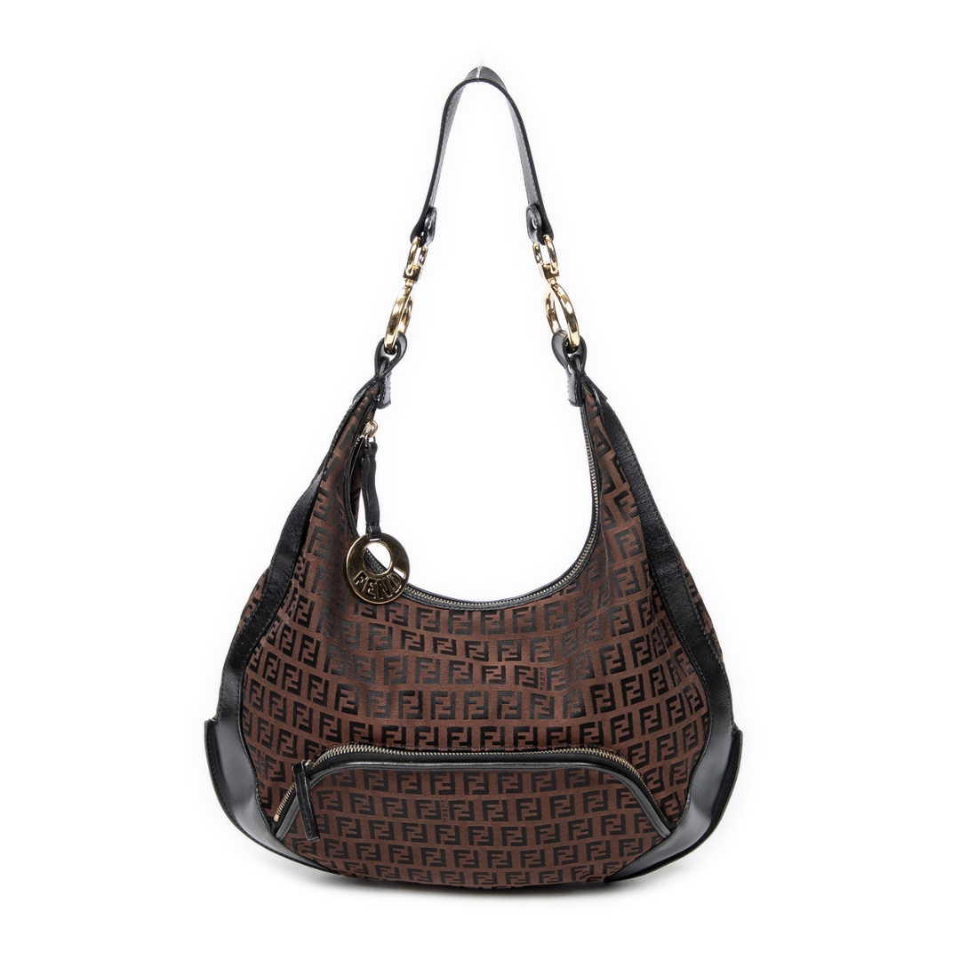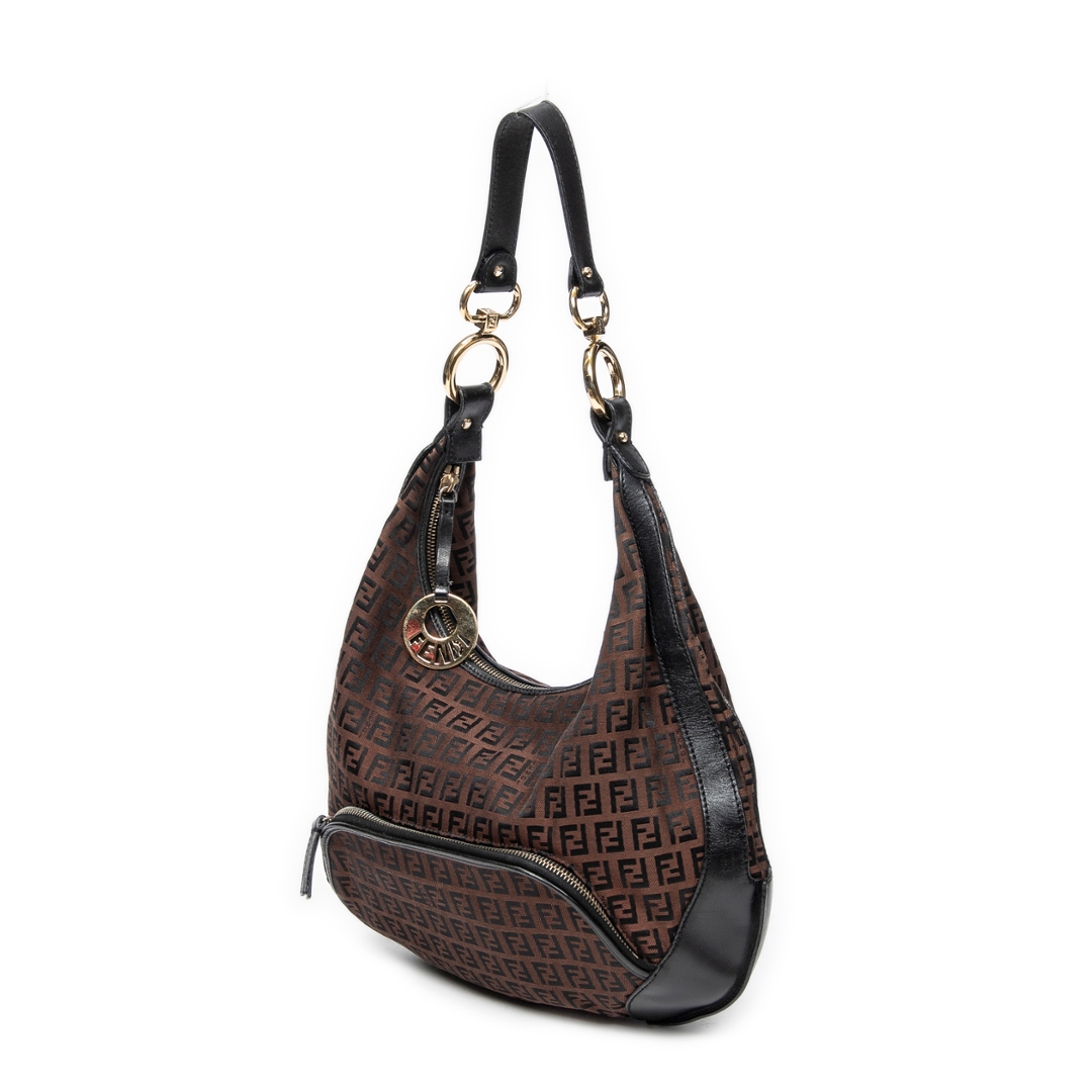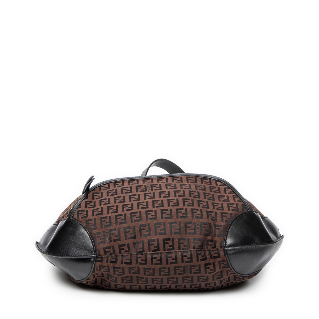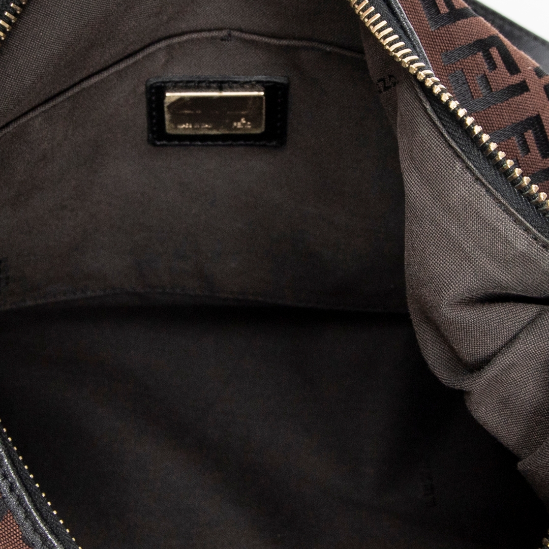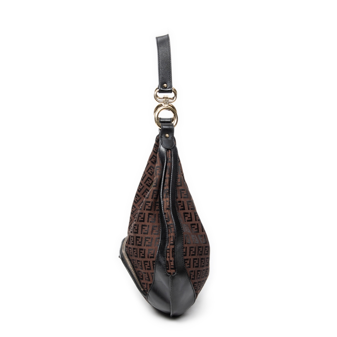 A vintage Fendi dark brown/black canvas Front Pocket Chef Hobo bag with a certificate of authenticity. Approximately 30cm height, 38cm width.