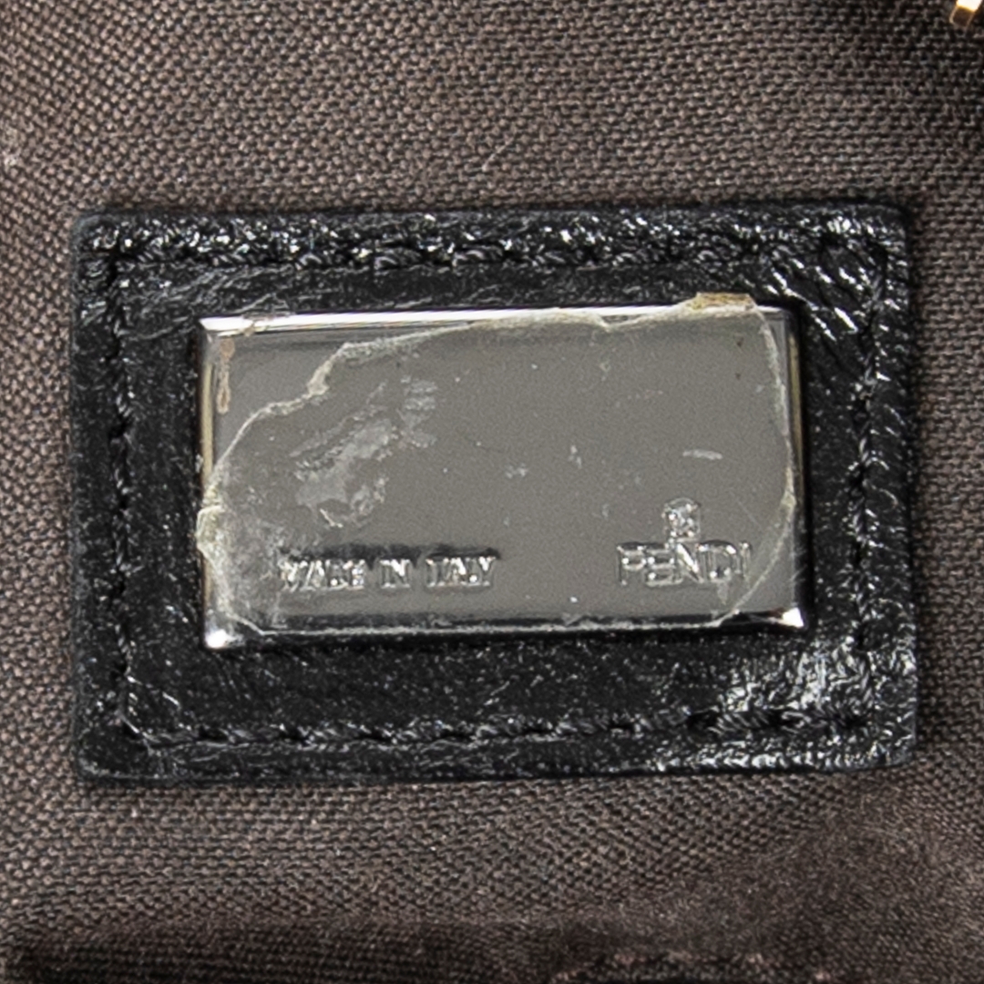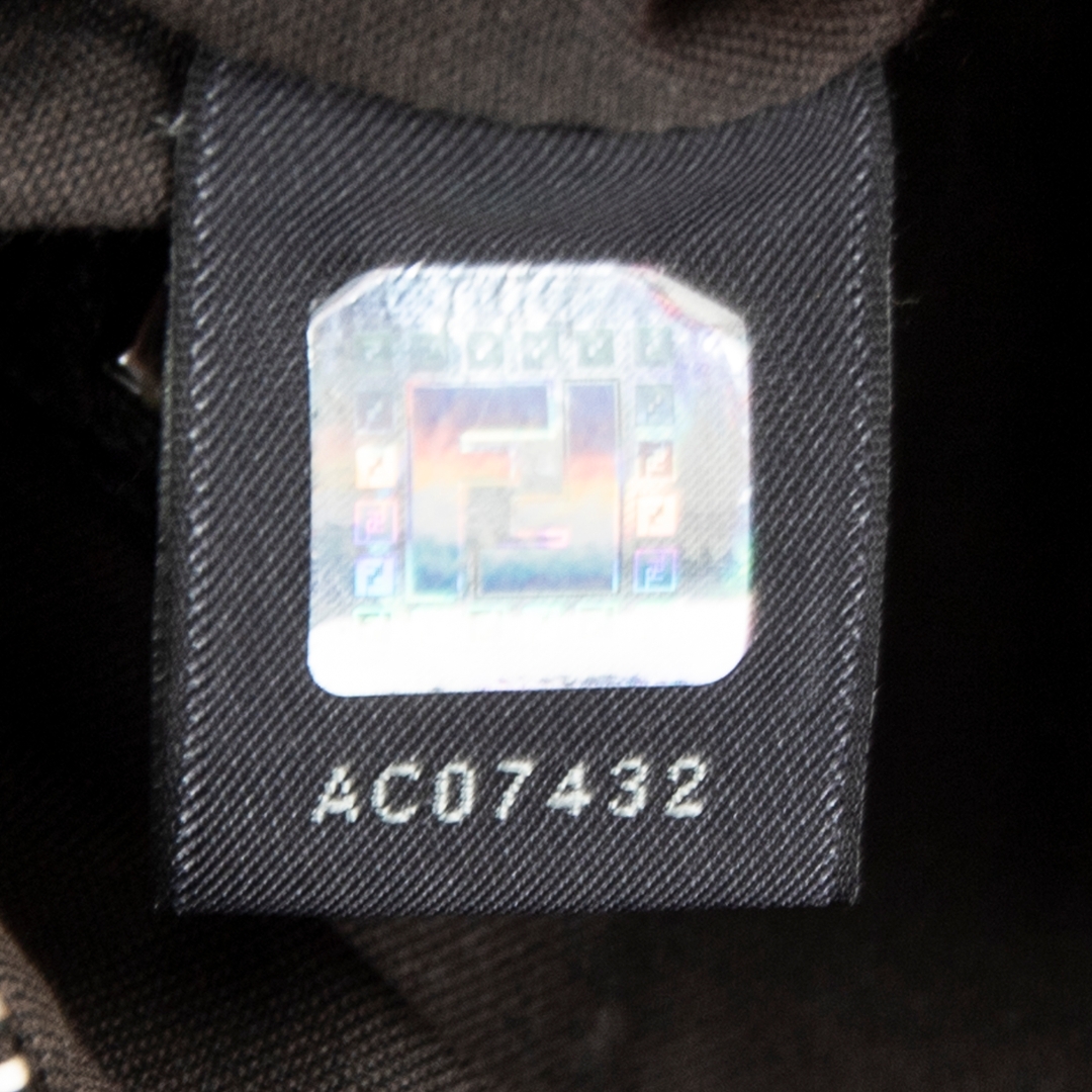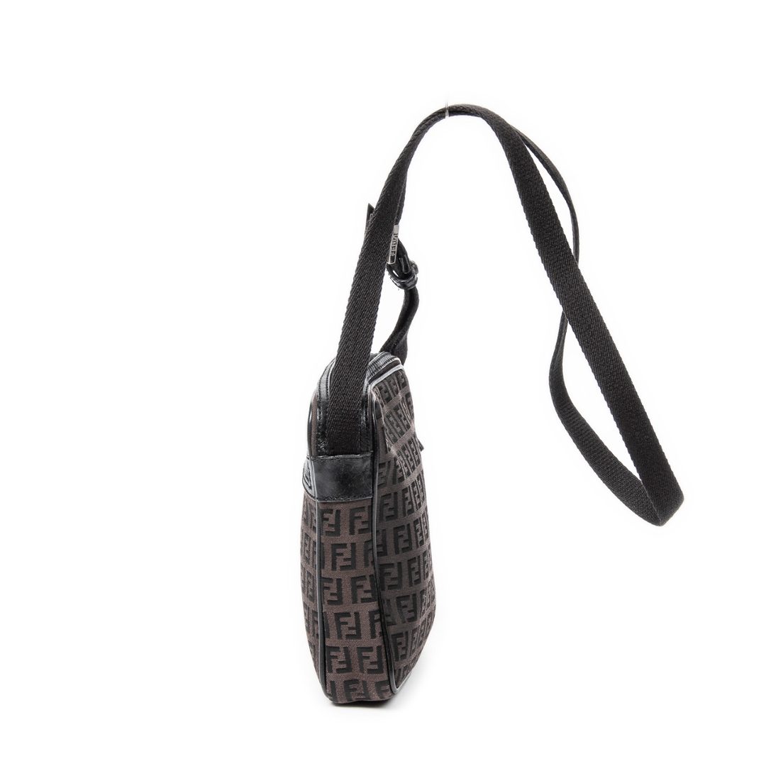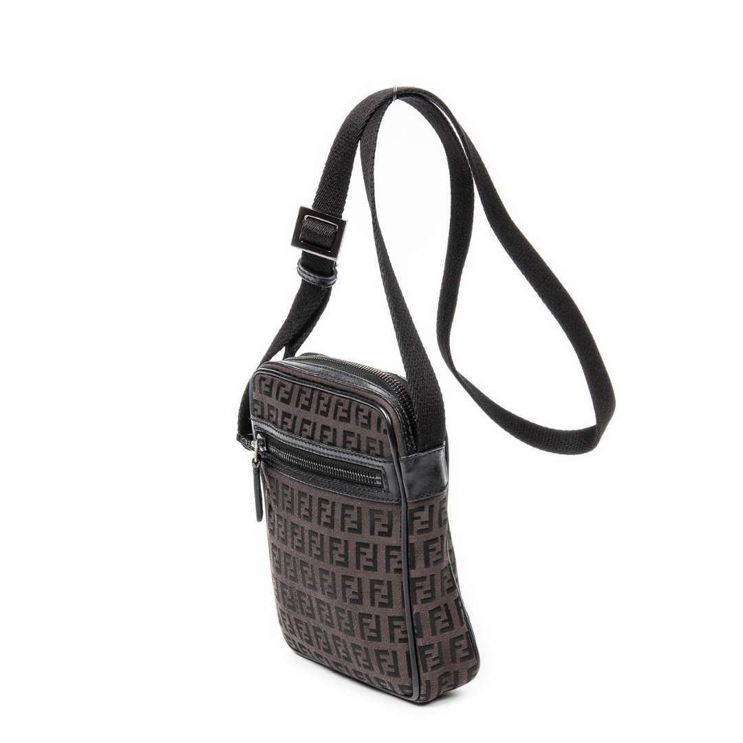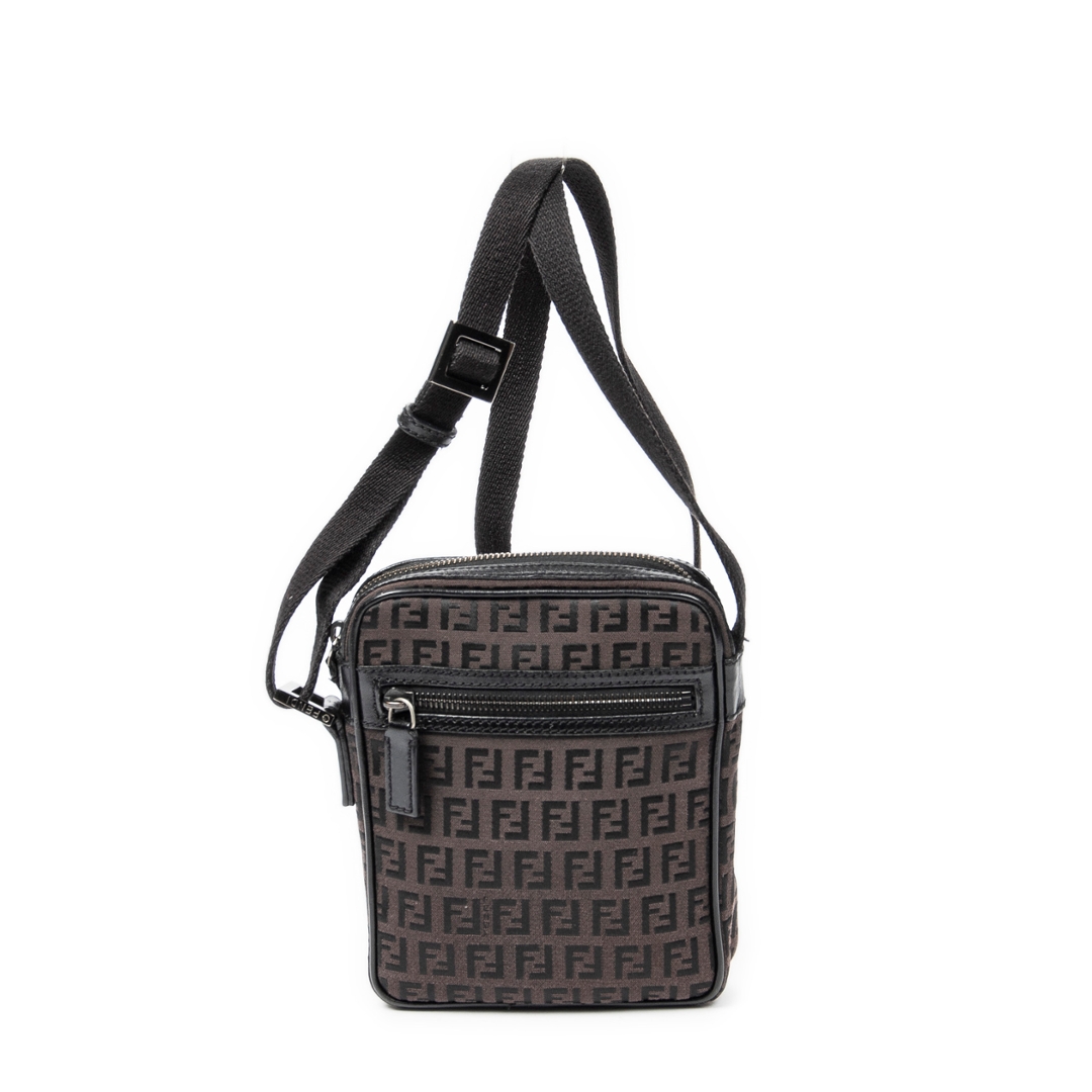 A vintage Fendi dark brown/black canvas Front Pocket Crossbody bag with a certificate of authenticity. Approximately 18cm height, 15cm width.