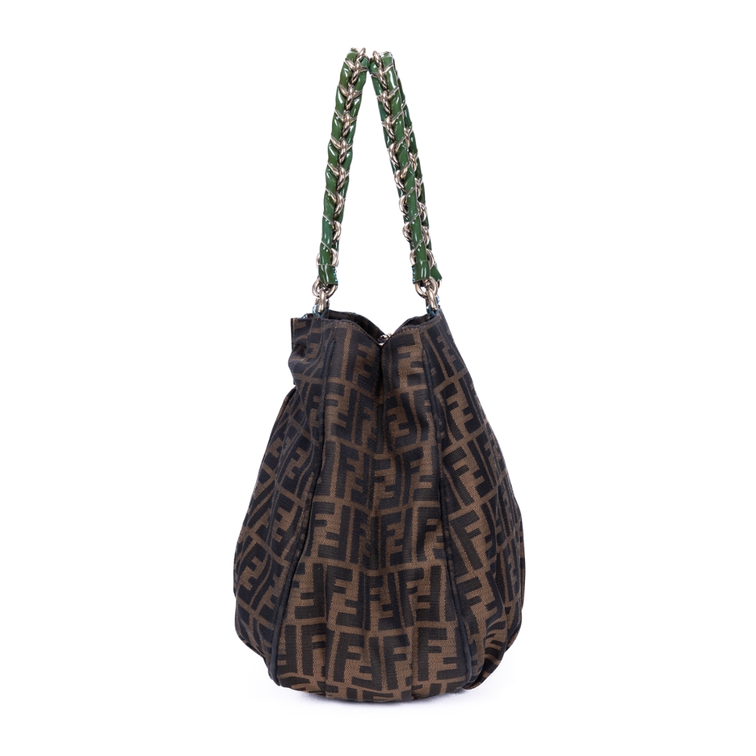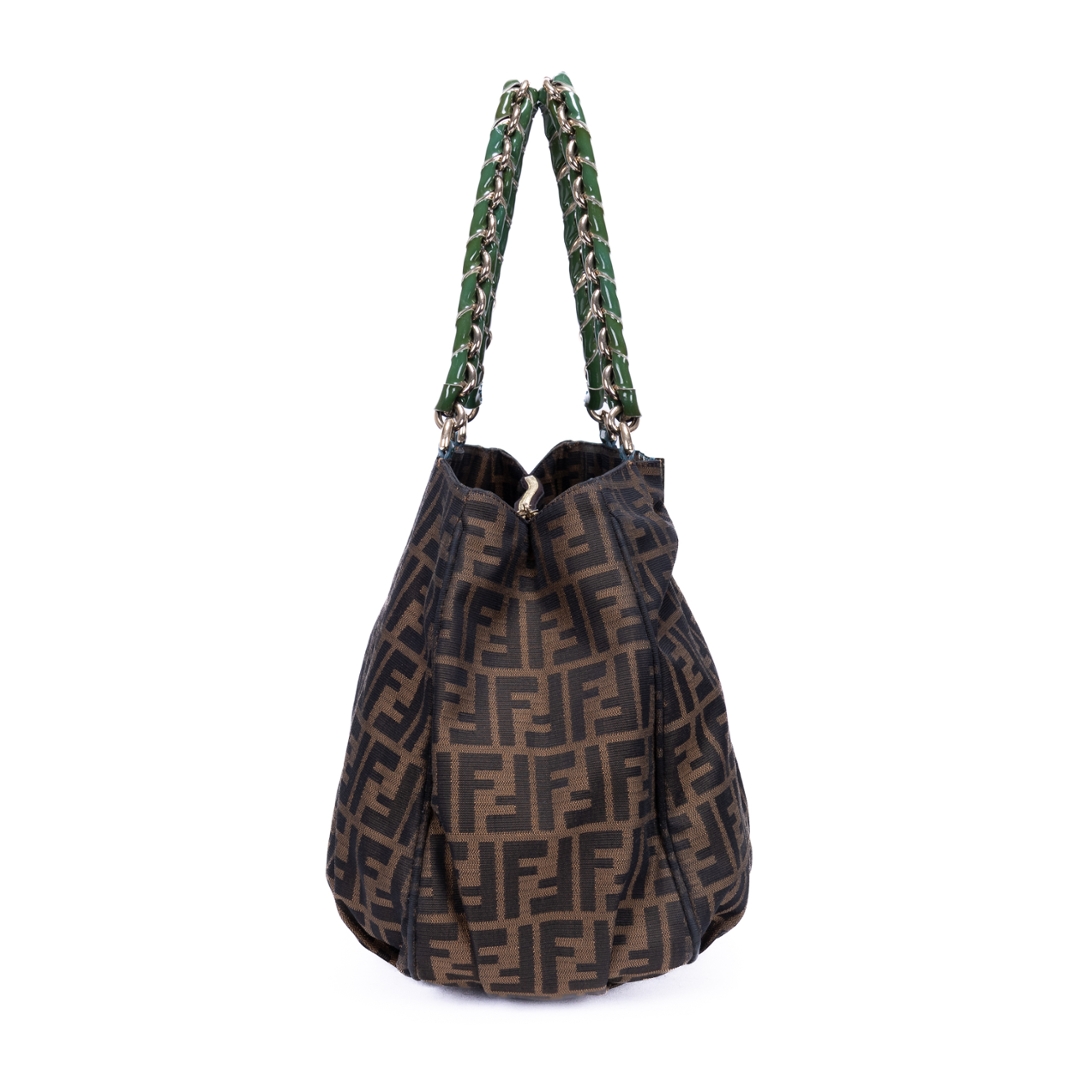 A vintage Fendi brown/green canvas Mia bag with a certificate of authenticity. Approximately 26cm height, 30cm width.