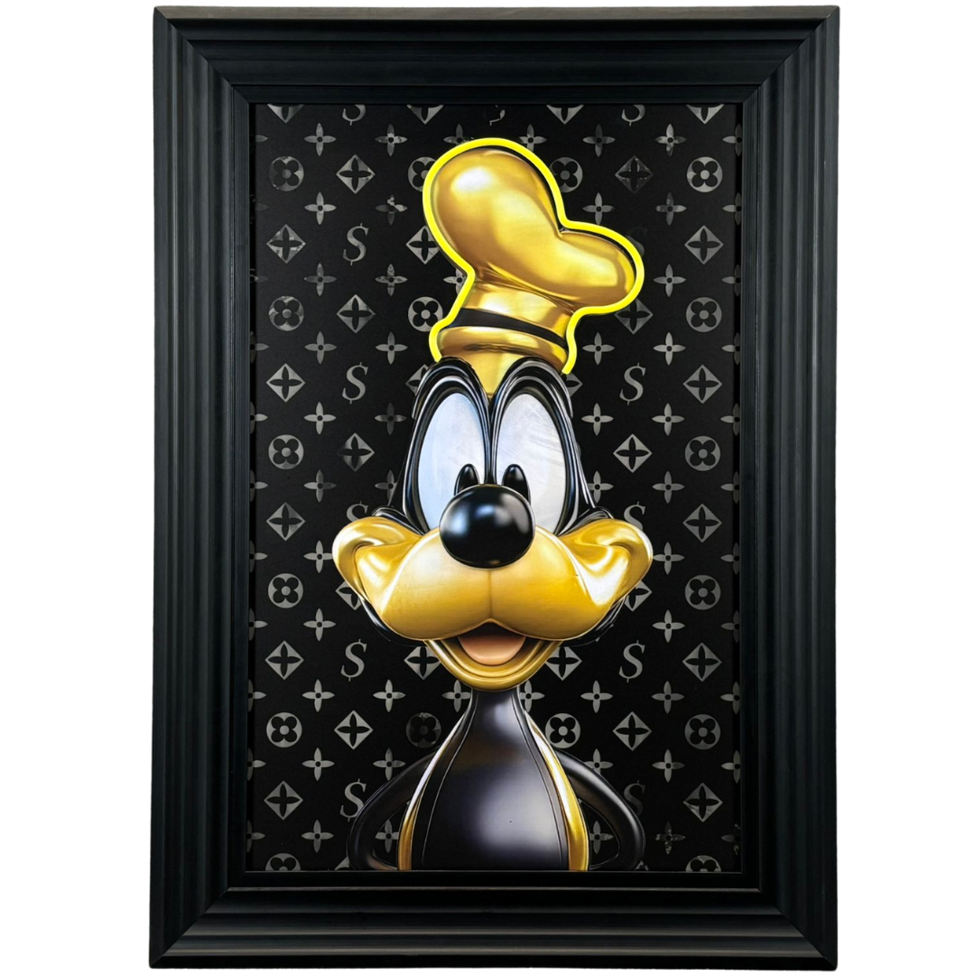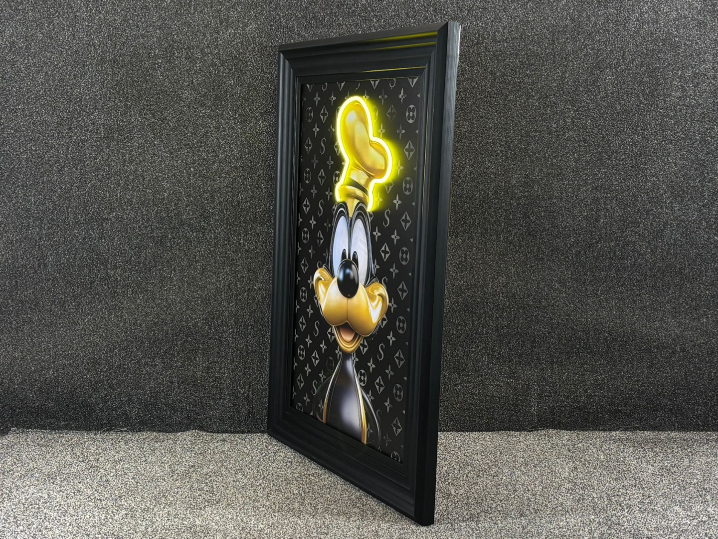 A brand new black framed LED wall art picture features a bold and stylish portrayal of Goofy, reimagined in a high-end designer-inspired aesthetic. The deep black background is patterned with luxury-style motifs, creating a striking contrast against Goofy’s vibrant yellow tones and expressive features. The LED lighting highlights his hat with a bright glow, giving the artwork an eye-catching presence whether displayed in a modern home, office, or entertainment space.