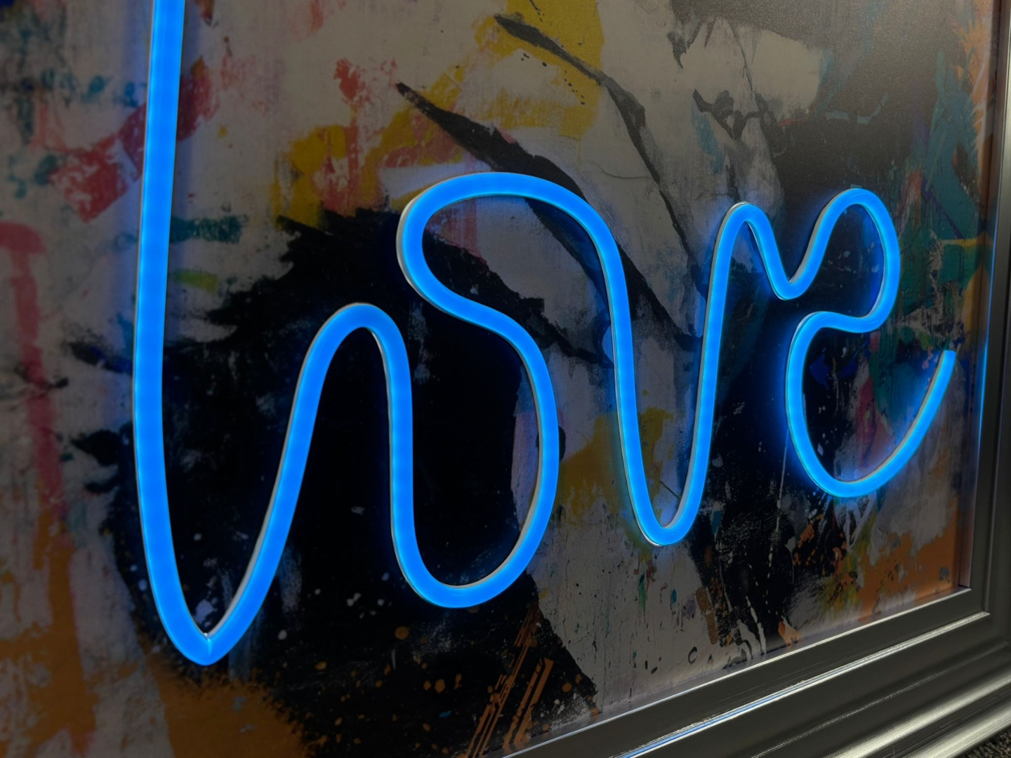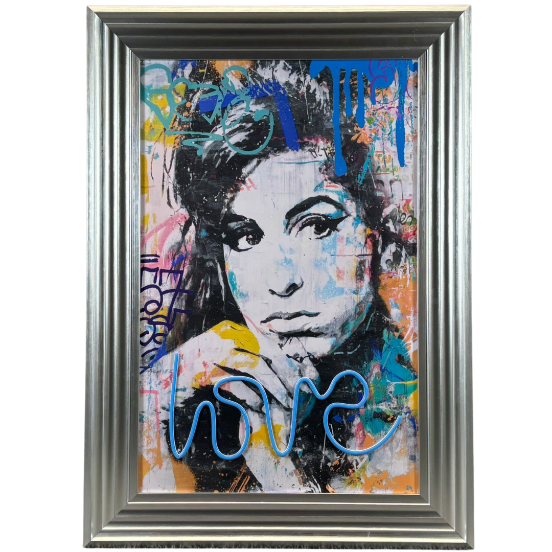 A silver framed LED wall art features a striking mixed-media portrait of Amy Winehouse, brought to life with a vibrant street-art aesthetic and a bold electric-blue ‘love’ LED script that adds an immediate glow. The expressive brushwork and graffiti-inspired background create a dynamic contrast with the monochrome portrait, giving the piece a modern edge while still capturing Amy’s unmistakable presence. With the LED turned on, the artwork gains an eye-catching luminosity, yet it remains equally impactful with the lights off thanks to its rich colours and layered texture.