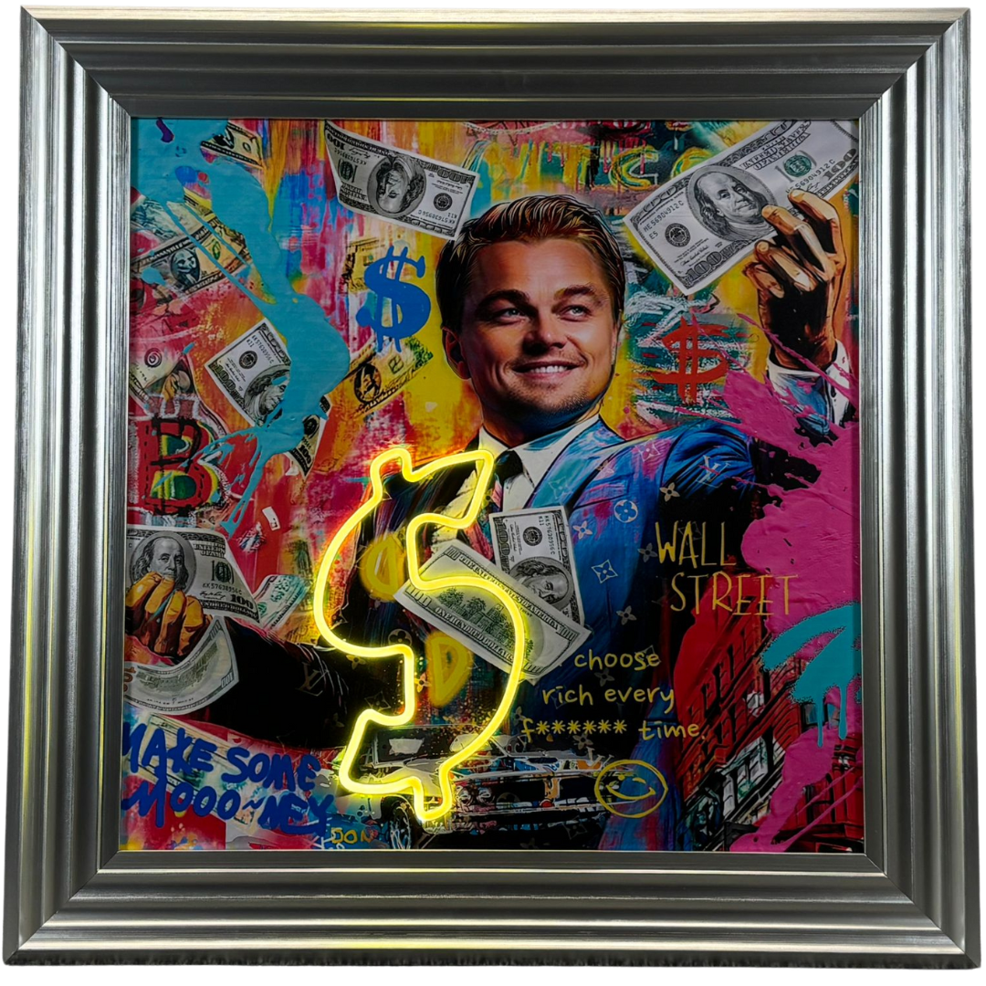 A brand new silver framed LED wall art piece captures the high-energy charisma of Leonardo DiCaprio in his iconic Wolf of Wall Street role. The artwork explodes with colour, graffiti textures and layered imagery, creating a thrilling backdrop of dollar bills, symbols and bold street-style markings. At the centre, DiCaprio’s confident expression and sharp suit dominate the scene, surrounded by vibrant splashes of pink, yellow and electric blue that amplify the energetic financial chaos the movie is known for.