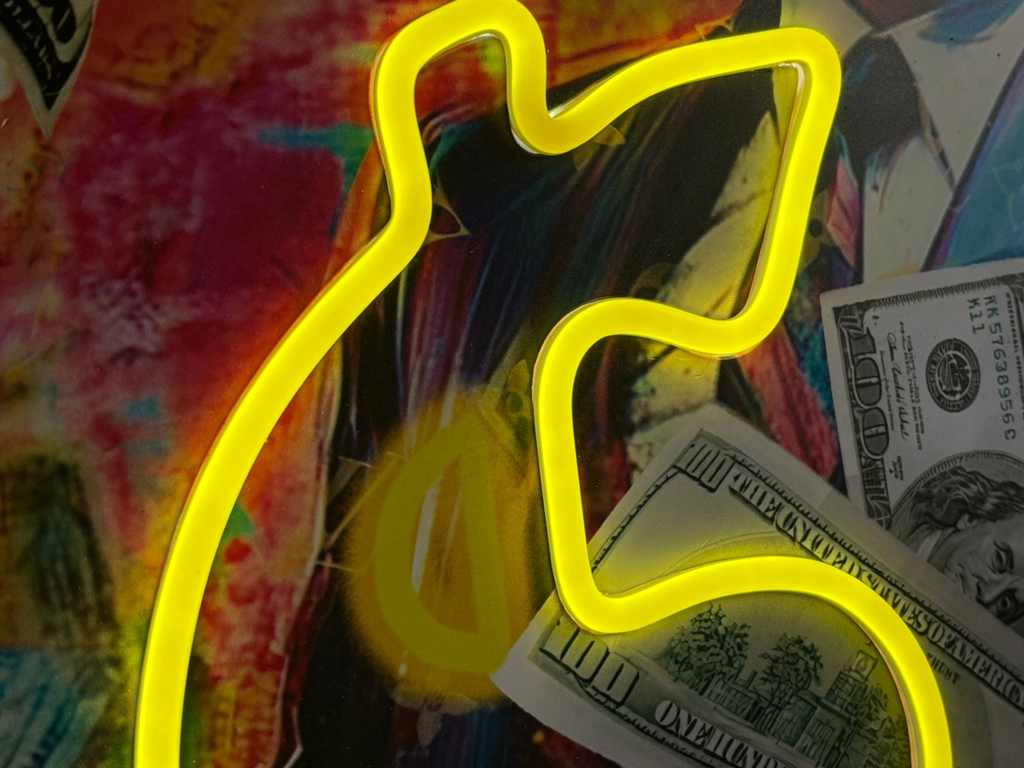 A striking yellow LED dollar sign sits boldly at the front of the composition, giving the entire piece a captivating illuminated focus. The built-in power button at the bottom and discreet battery pack keep operation simple while maintaining a clean display without visible wires. As a general rule, with these LED artworks, the picture looks fantastic whether the lights are switched on or off, thanks to its strong colours and powerful design.